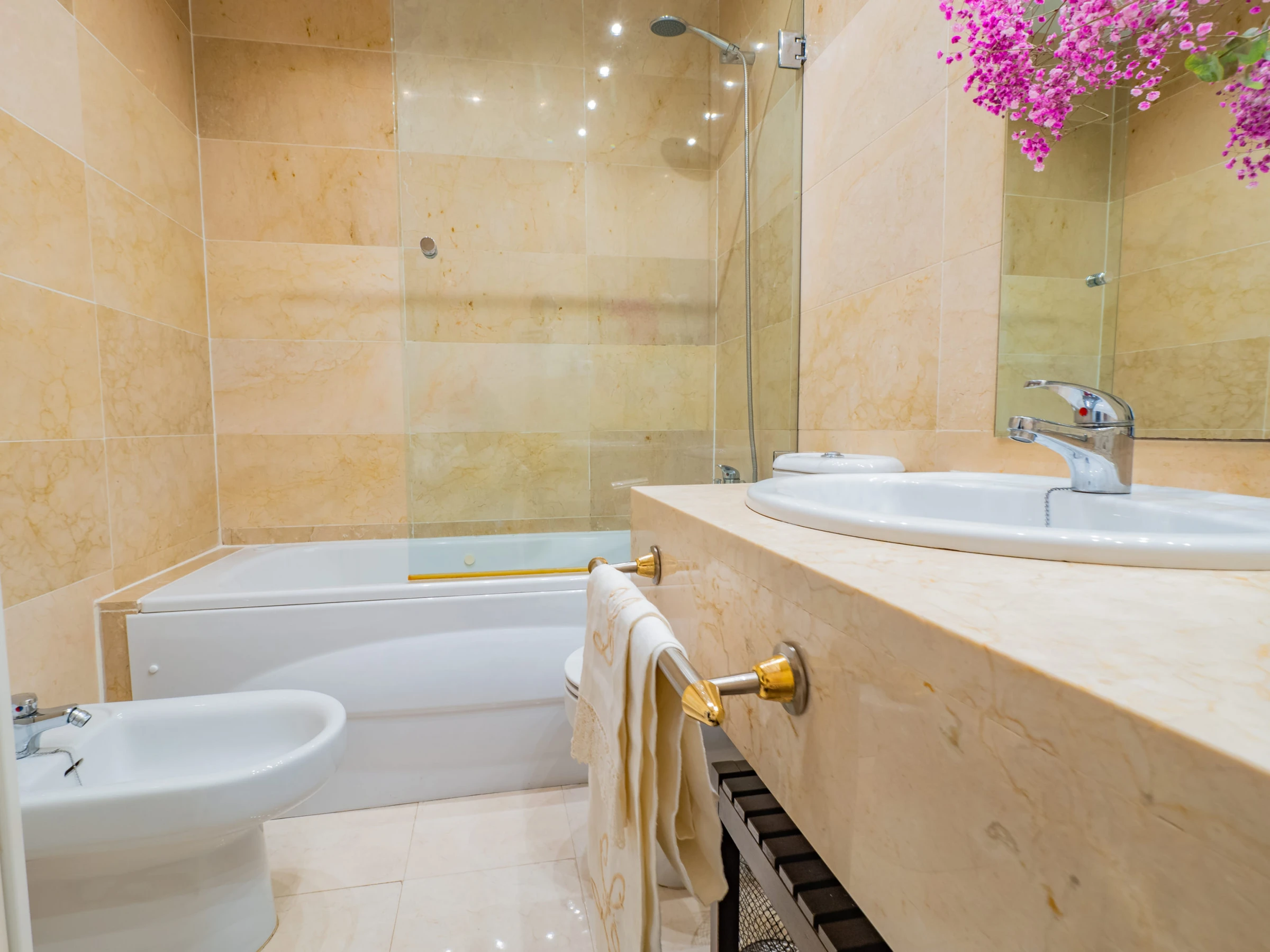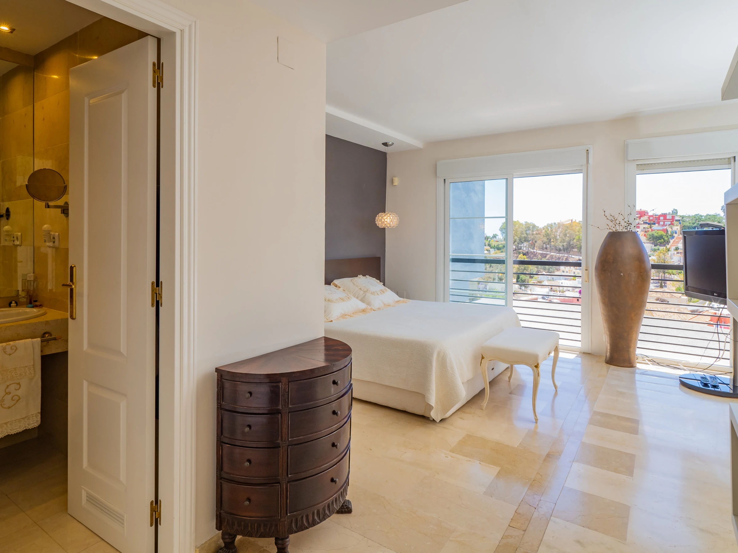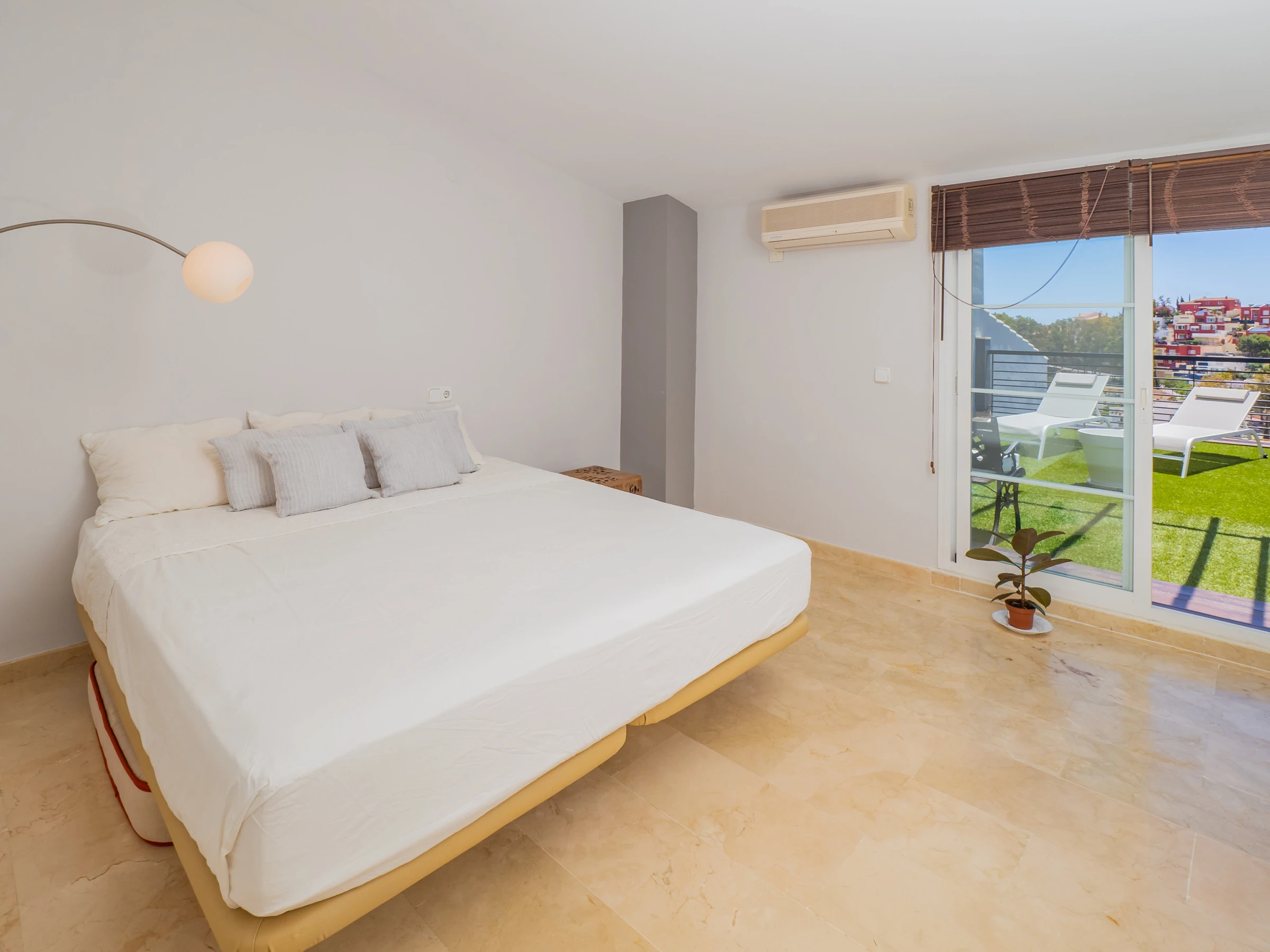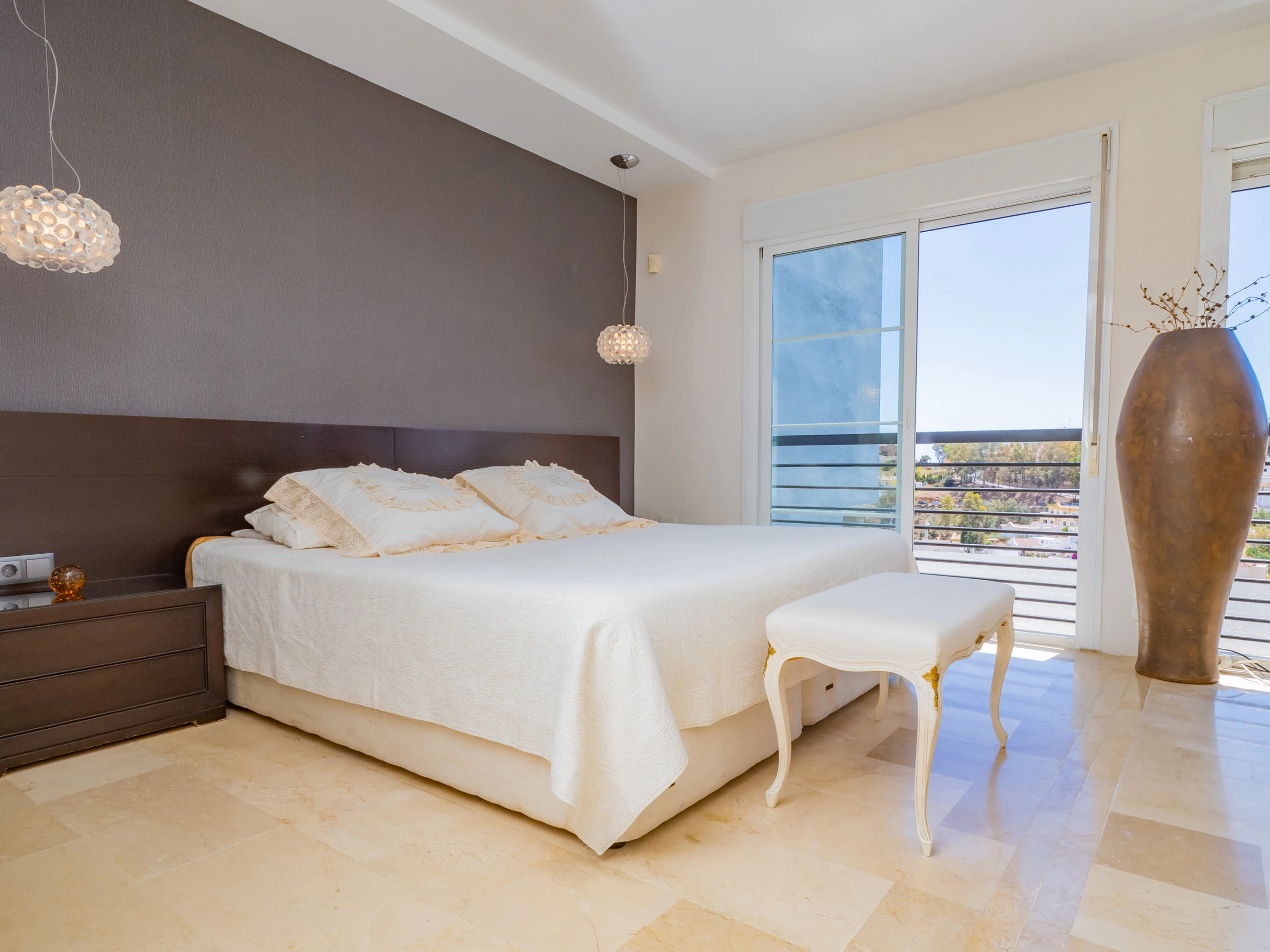 Le logement dispose de 4 chambres spacieuses et élégantes, équipées de grands lits (2x2 mètres), réparties sur plusieurs étages pour offrir intimité et confort. À l'étage supérieur, la chambre principale comprend une salle de bain attenante et une terrasse privée avec une vue spectaculaire. À l'étage intermédiaire, une autre chambre avec un lit de couple, de grands placards et une terrasse accueillante parfaite pour des dîners en plein air. Au rez-de-chaussée se trouvent deux autres chambres, l'une avec un lit de couple et l'autre avec deux lits individuels, toutes deux avec une salle de bain attenante.