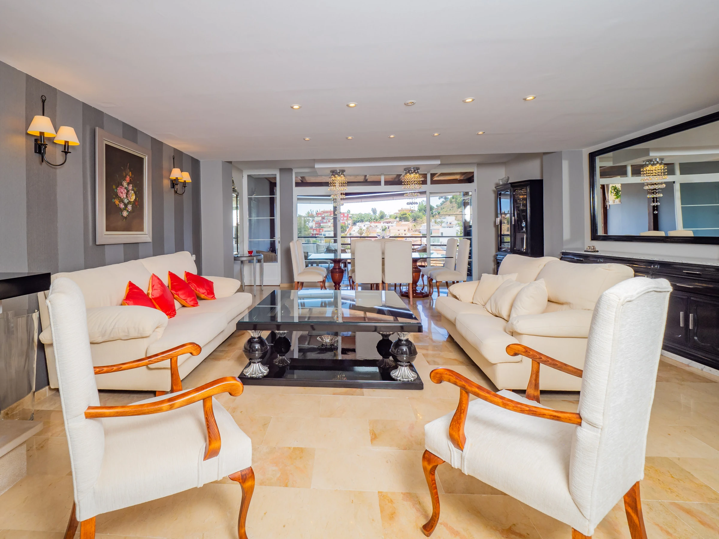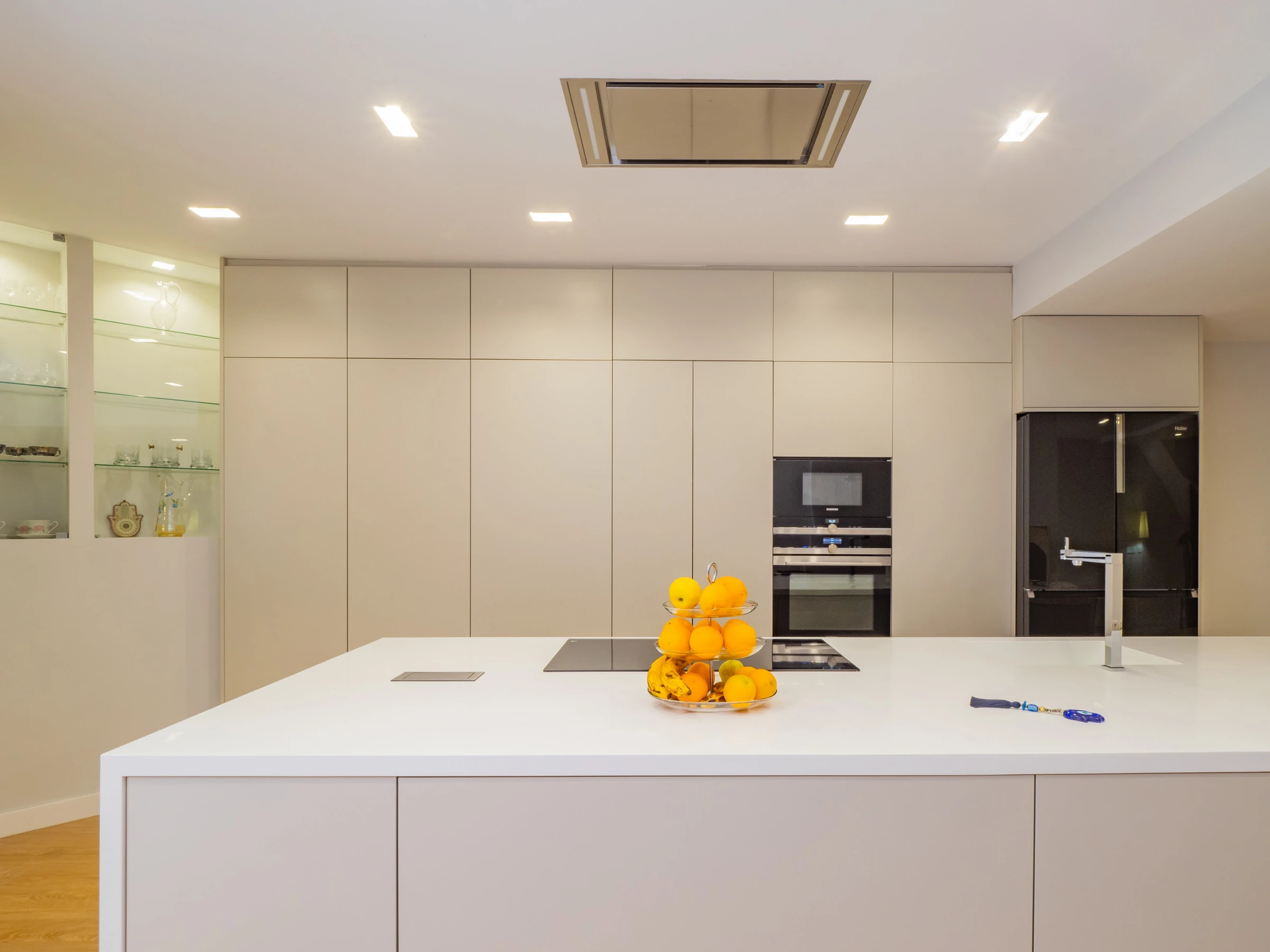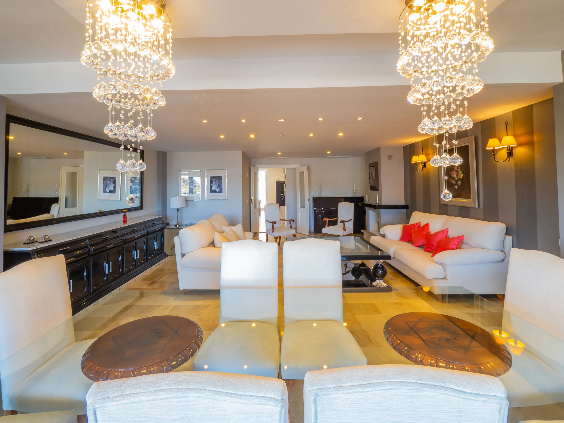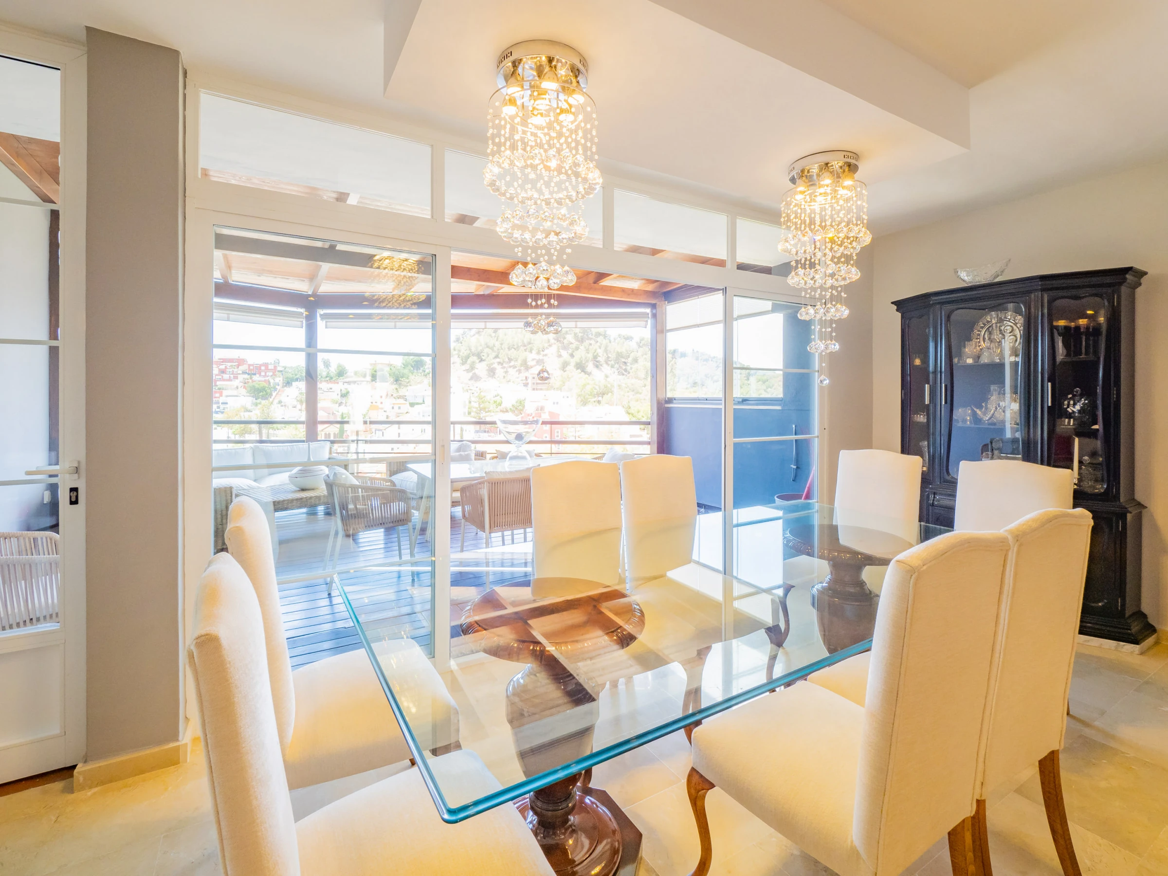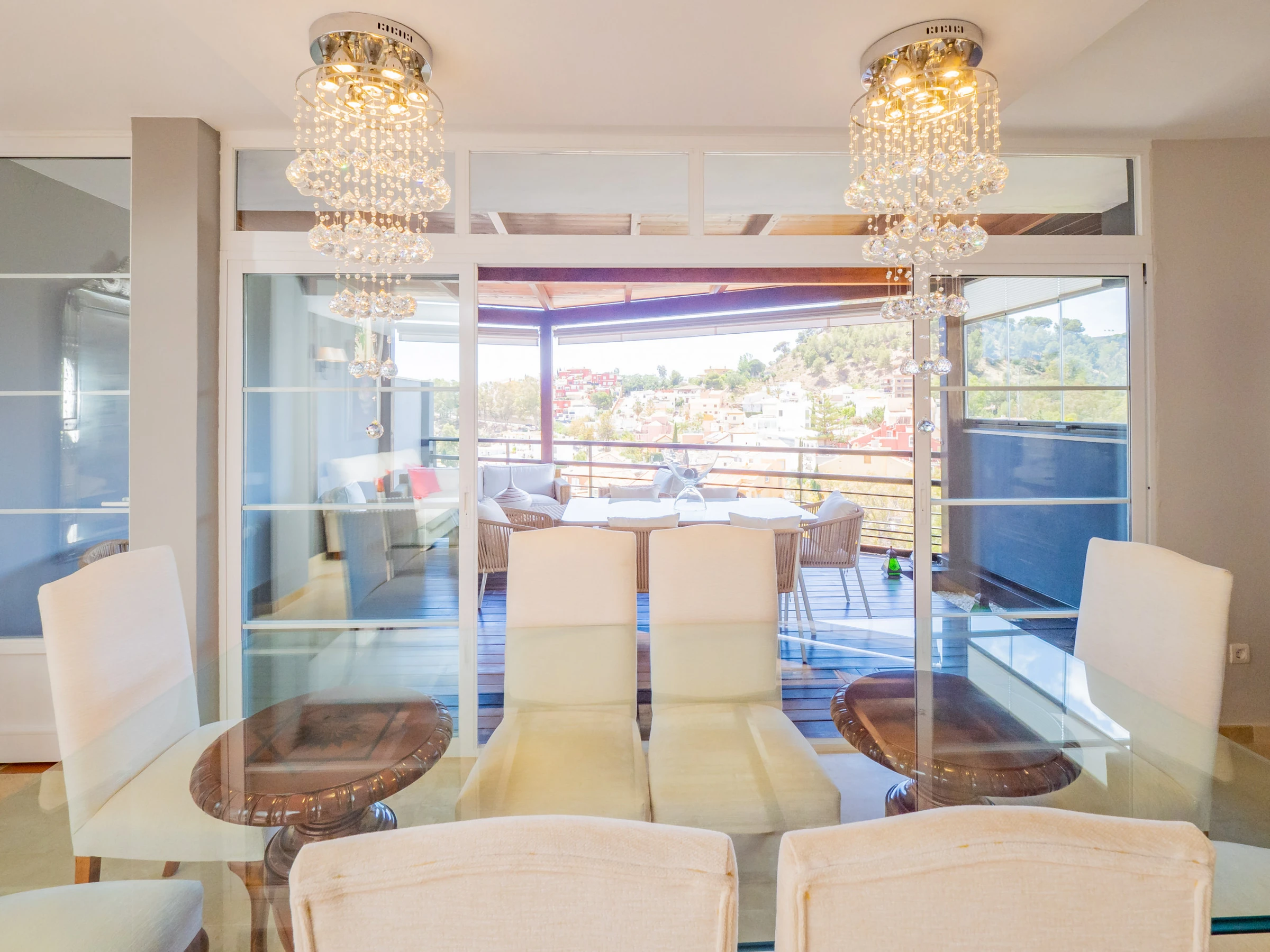 Le salon-salle à manger impressionne avec ses plafonds hauts et son mobilier de luxe, s'ouvrant sur une terrasse offrant des vues partielles sur la mer et la ville. La cuisine indépendante, moderne et équipée d'électroménagers dernier cri et d'un îlot central, est idéale pour préparer de délicieux repas. De plus, elle dispose d'une cour avec un brûleur à gaz pour plus de commodité. 🍽️🔥