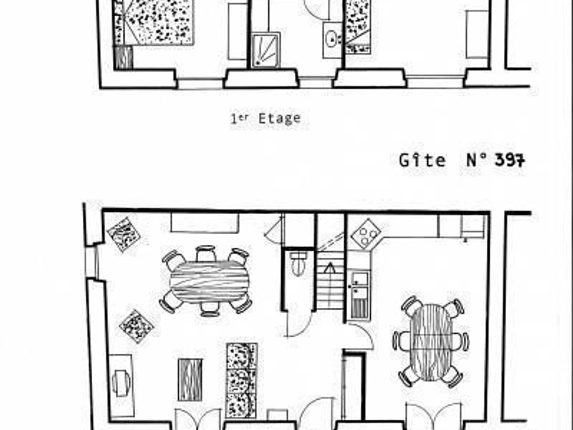 1er étage: 3 chambres (1 lit 160 x 200, 1 lit 140 x 190, 2 lits gigognes 1 personne, 1 lit bébé), salle d'eau, WC indépendant.