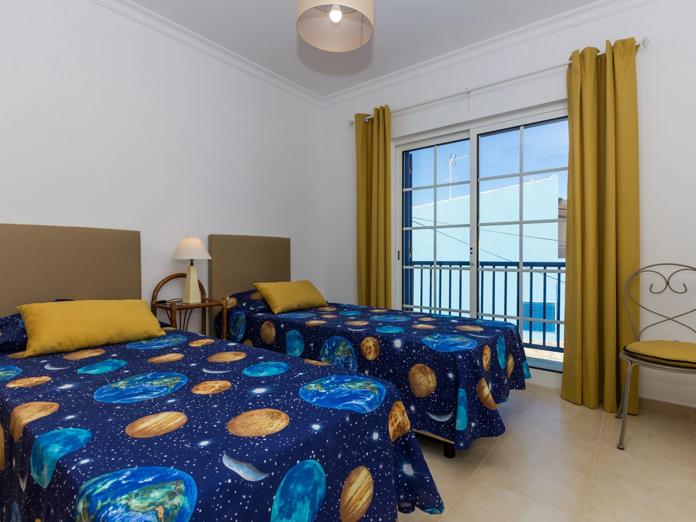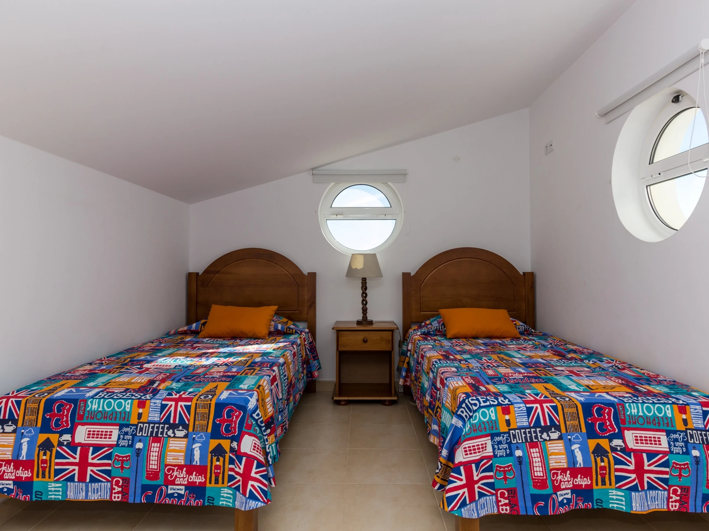 Le premier étage dispose de trois chambres confortables : une avec un lit double et deux chambres avec deux lits individuels chacune, dont l'une en suite avec une douche d'angle. Il y a également une salle de bain familiale avec baignoire, garantissant l'intimité et le confort pour tous les invités. La maison est équipée de la climatisation et du Wi-Fi, offrant un séjour agréable à toute période de l'année.
