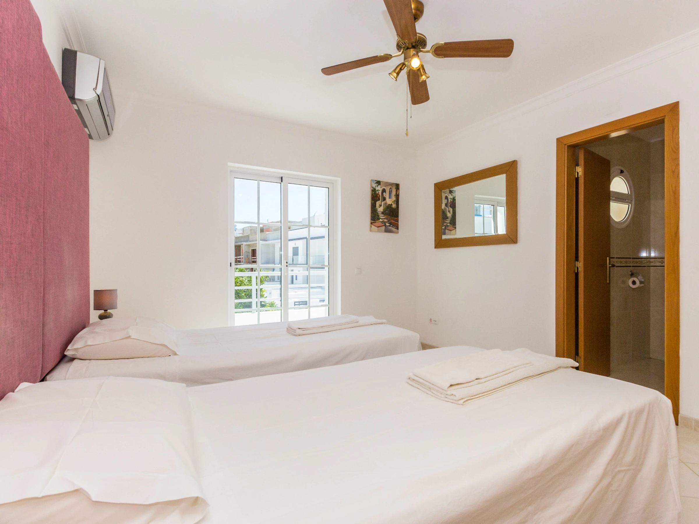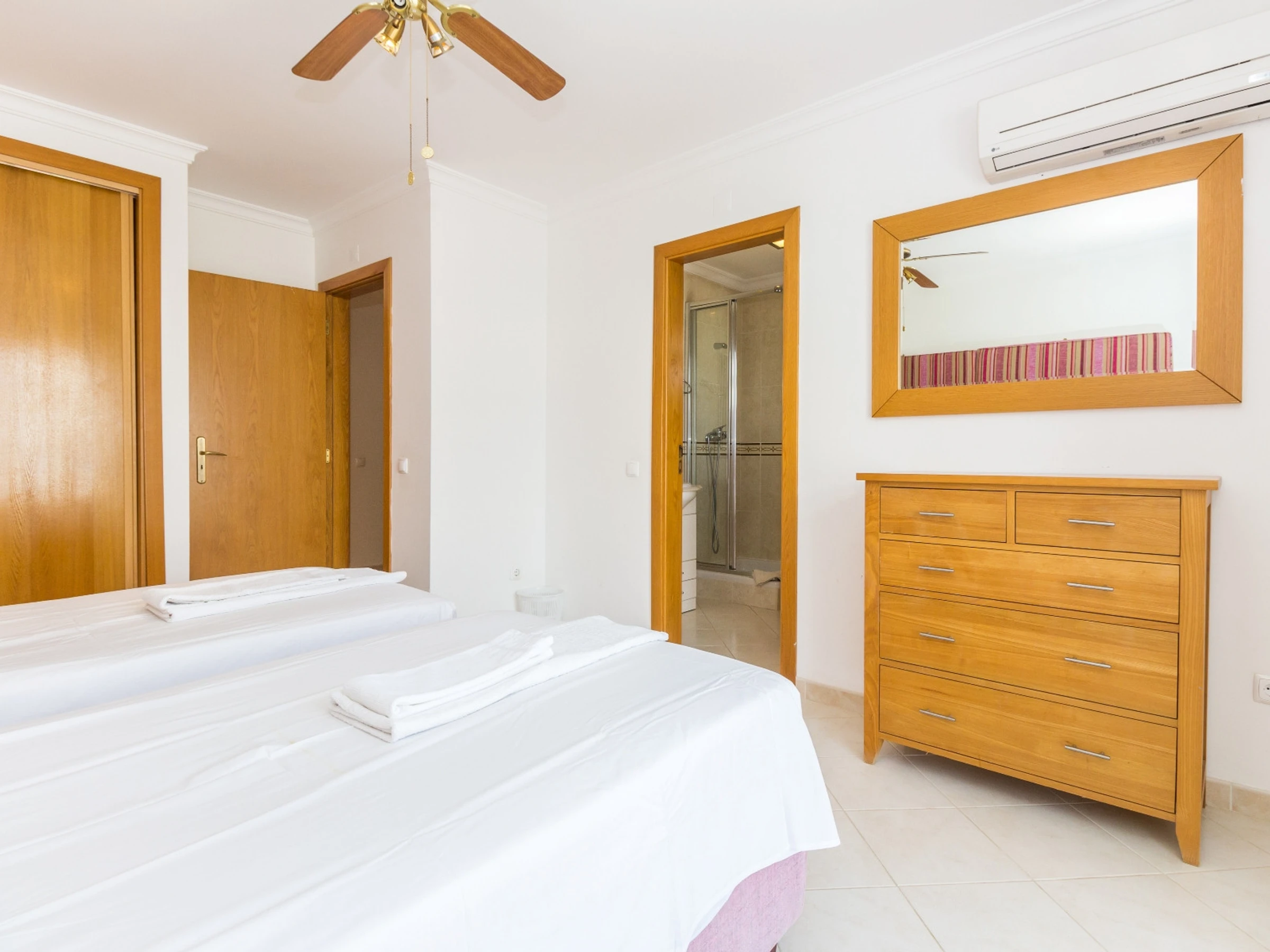 Le bien peut accueillir jusqu'à 6 personnes, avec trois chambres confortables et une distribution polyvalente des lits, comprenant un lit double et quatre lits individuels. Deux des chambres sont en suite, avec des salles de bains privatives avec douche d'angle, tandis que la troisième chambre dispose d'une salle de bains avec baignoire. Toutes les chambres possèdent des balcons avec des vues orientées à l'Est, à l'Ouest ou au Nord, et le grenier offre une terrasse impressionnante avec vue sur la mer.
