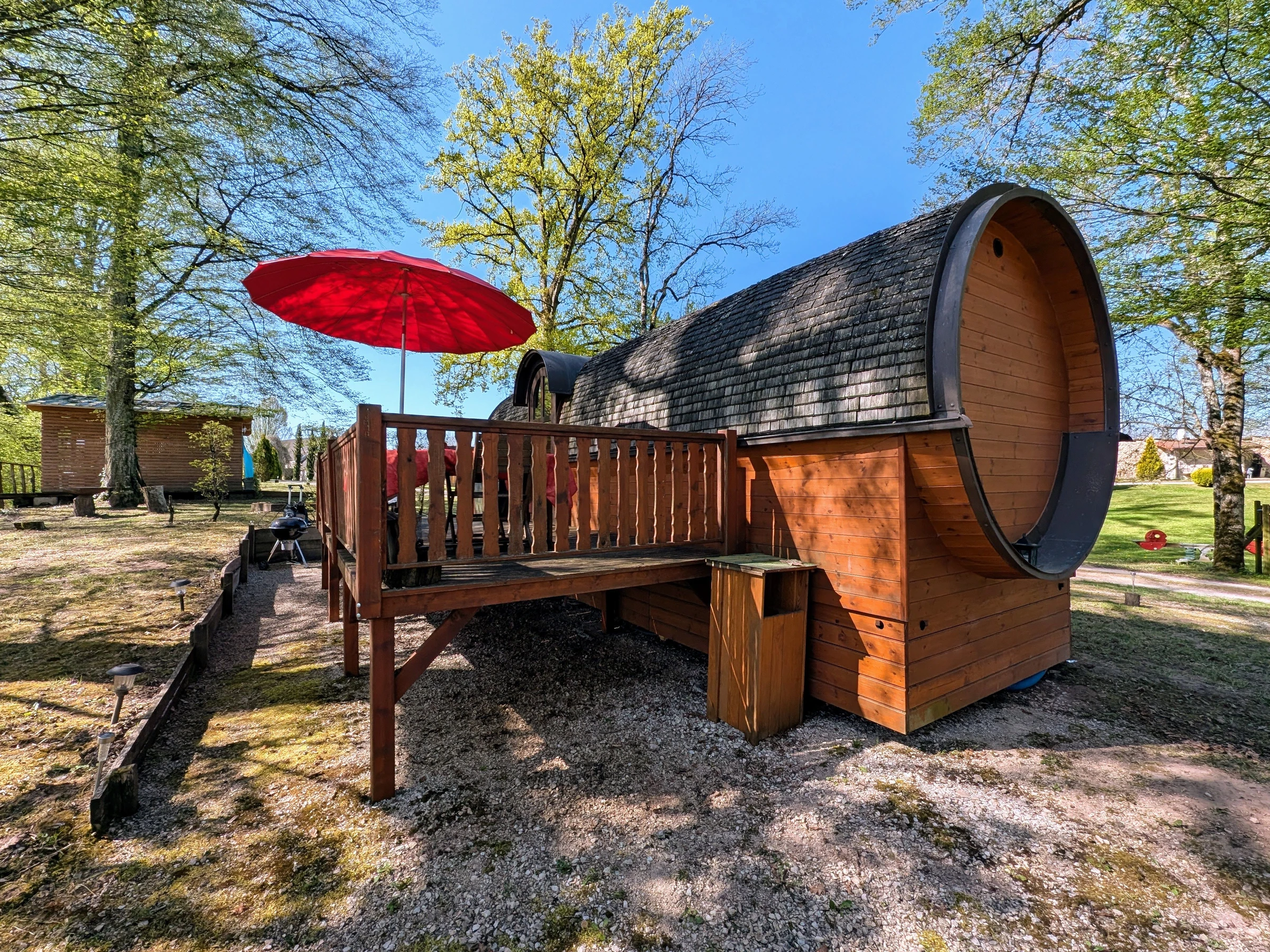 Le Tonneau (2 personnes) : un cocon chaleureux avec lit double, coin cuisine, salle d’eau et grande terrasse avec barbecue.