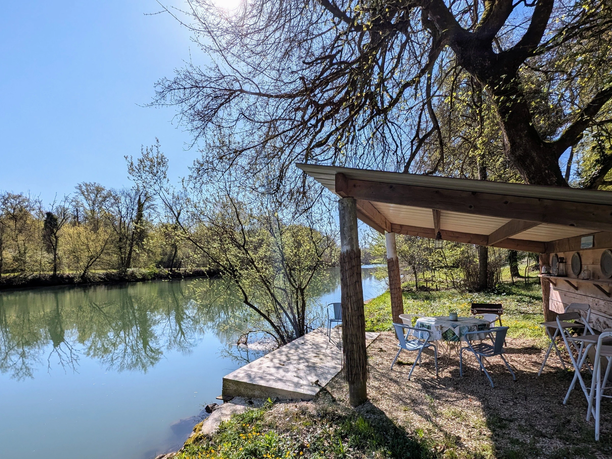 Une grande terrasse ombragée, équipée d’un barbecue, permet de profiter pleinement des repas en extérieur avec vue sur la Saône.