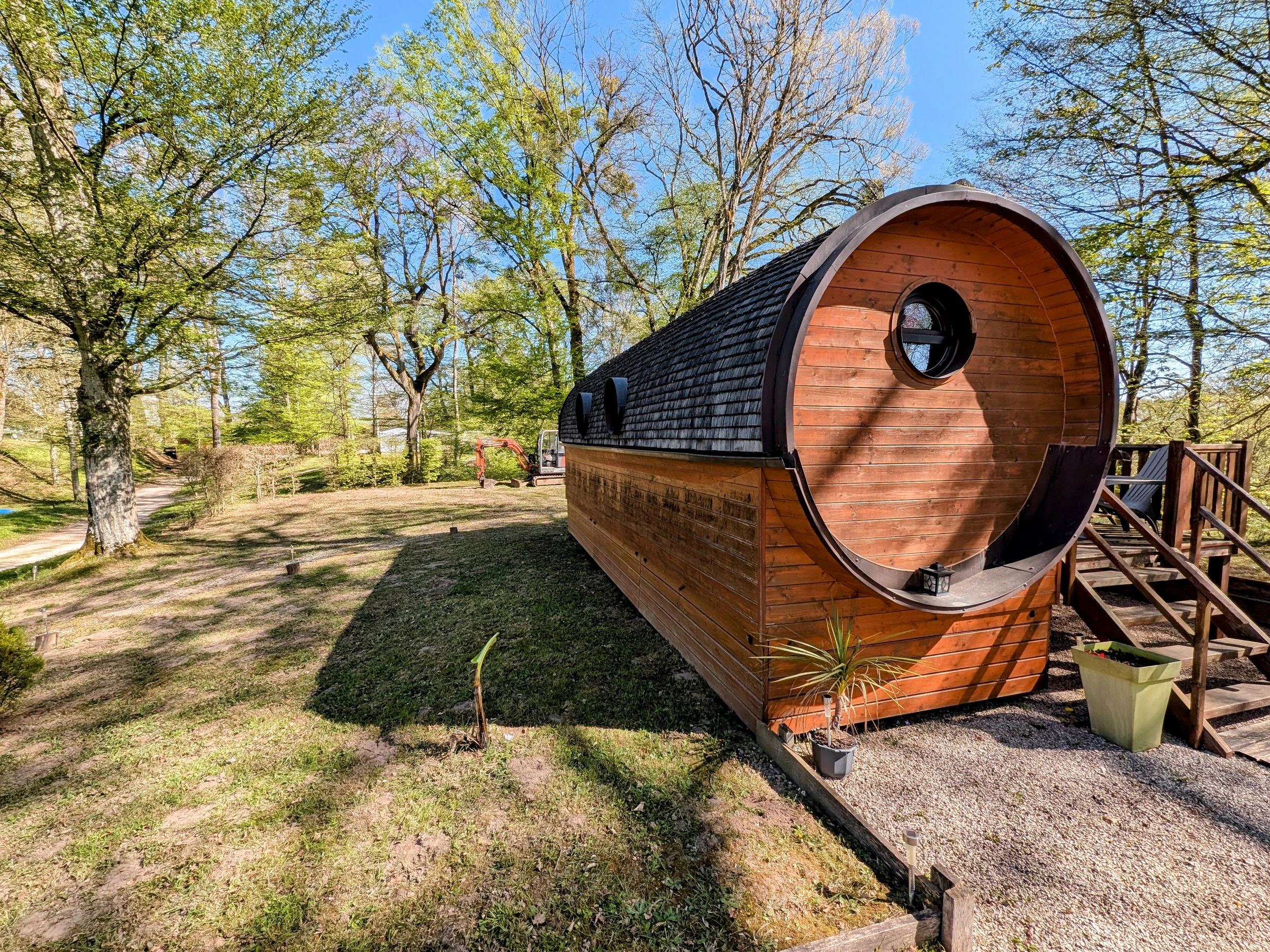 Le Tonneau se compose d’un espace nuit avec lit double (140 cm), d’un coin cuisine fonctionnel (plaque de cuisson, réfrigérateur, évier), ainsi que d’une salle d’eau privative avec douche, lavabo et WC.