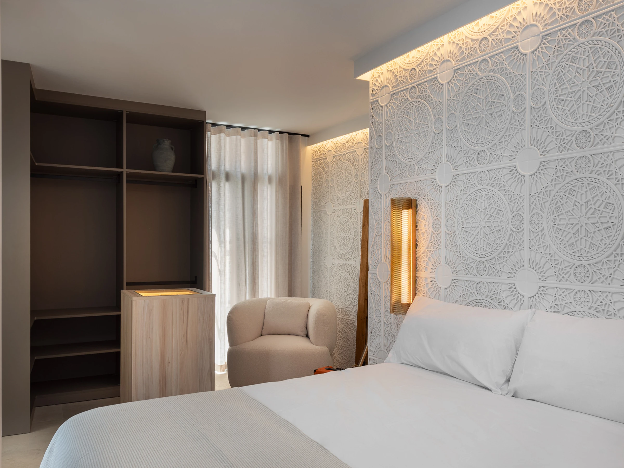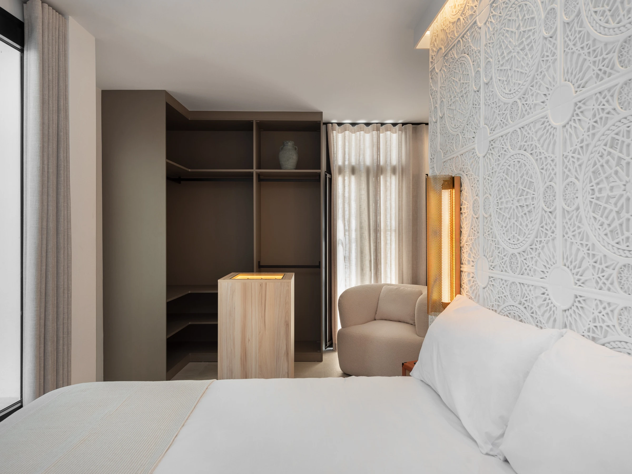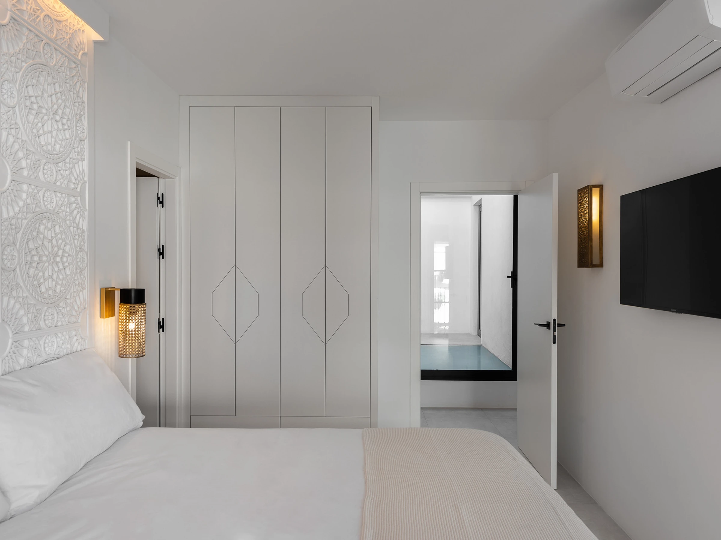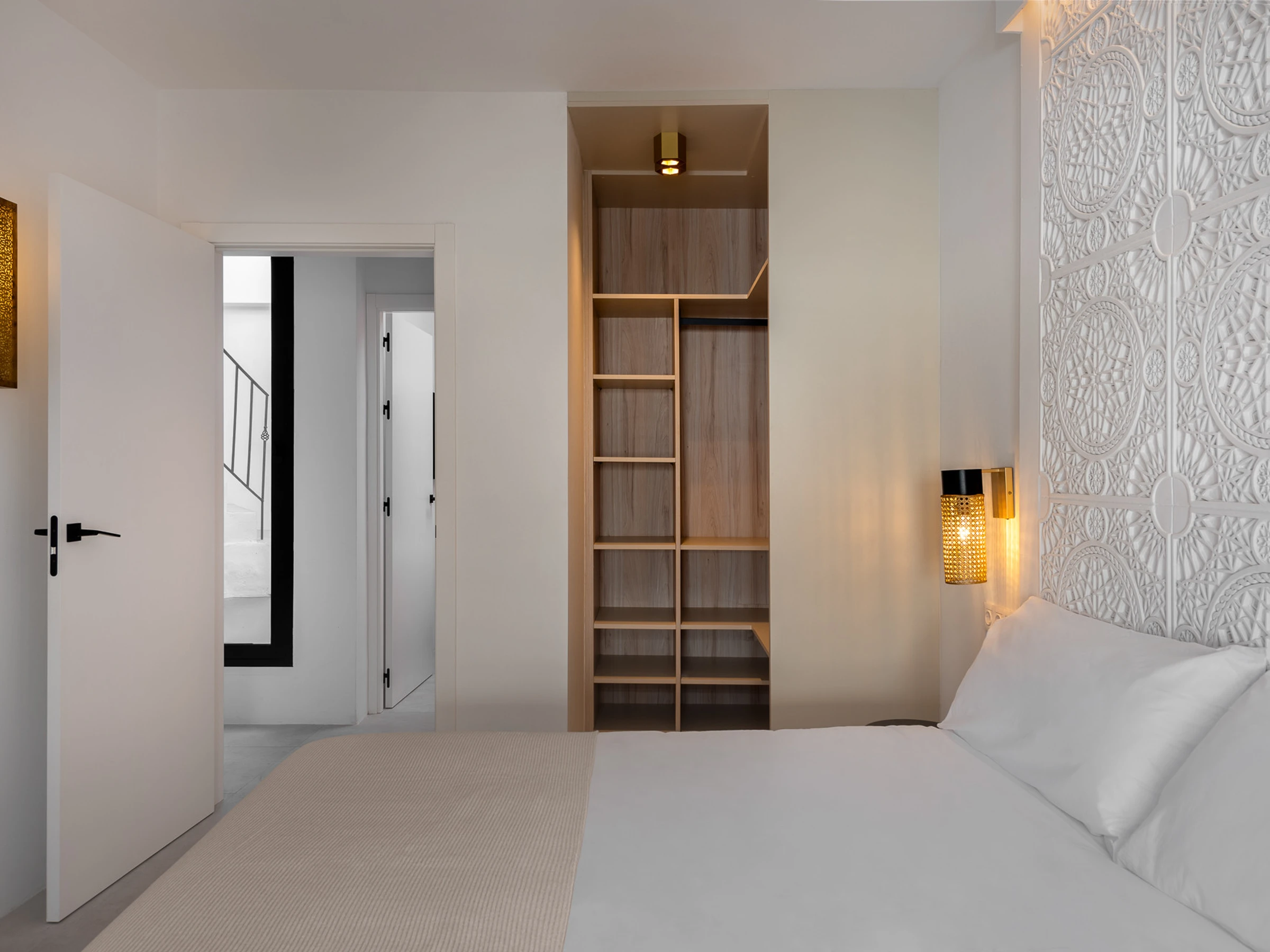 Au milieu de l'étage, il y a trois chambres qui ont été soigneusement et individuellement conçues ; l'une d'entre elles dispose même d'un accès à un espace de thé marocain donnant sur la cour en contrebas. Chaque chambre dispose de sa propre salle de bain privative.