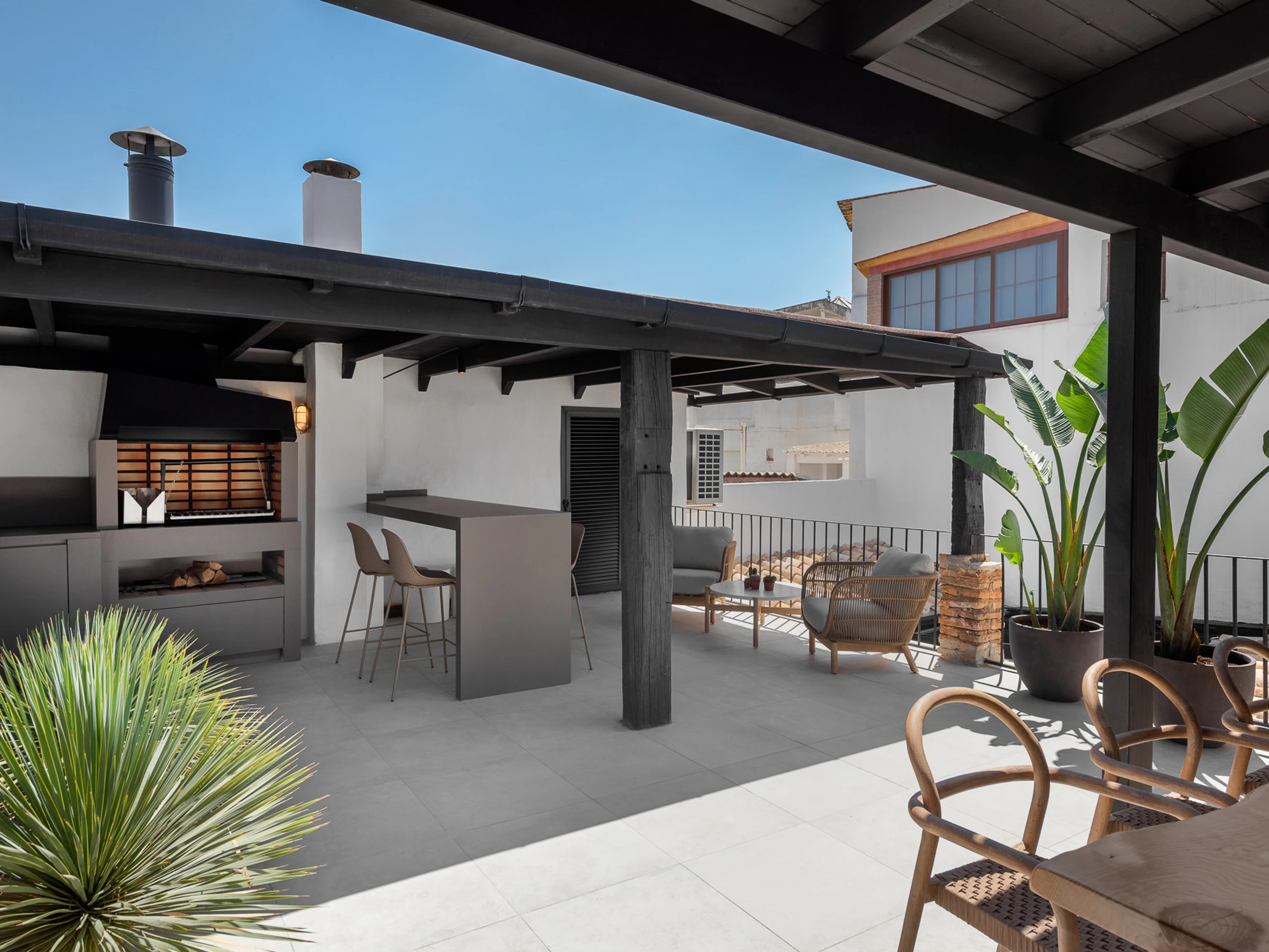 En montant sur la terrasse-toit spacieuse, les invités peuvent profiter du climat méditerranéen avec un espace repas et bar en plein air et une kitchenette avec barbecue au bois/charbon. Il y a également une cinquième chambre sur la terrasse supérieure avec une salle de bain attenante.