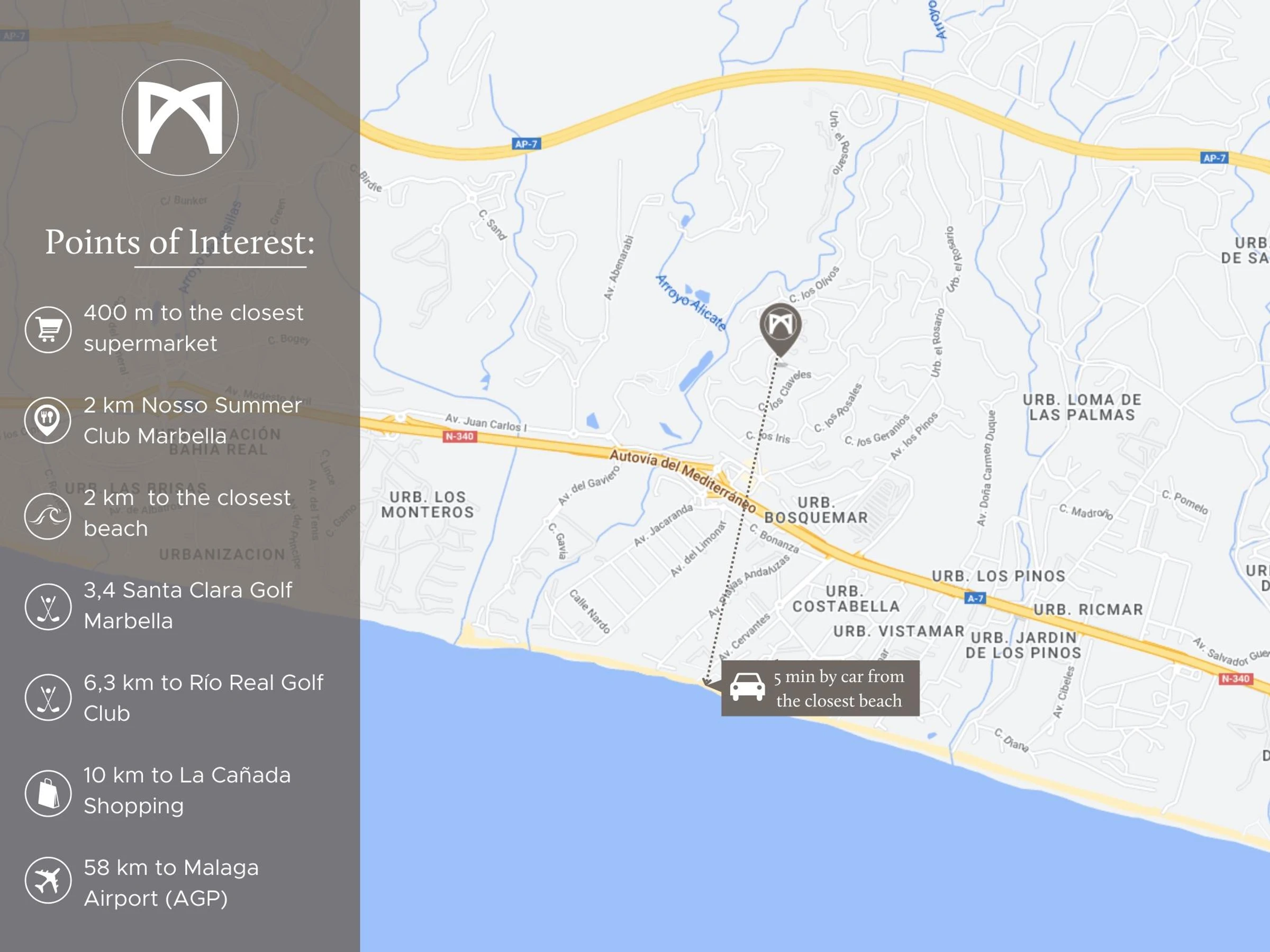 L’emplacement merveilleux de ce havre de paix vous placera à proximité de toutes sortes d’attractions de la Costa del Sol ! Vous pouvez partir à l'aventure dans la nature, accéder facilement aux plages de dunes les plus isolées de la région, comme Cabopino, ou jouer au golf sur l'un des green fees les plus célèbres de la région : Marbella Golf Country Club et Santa Clara Golf Marbella.