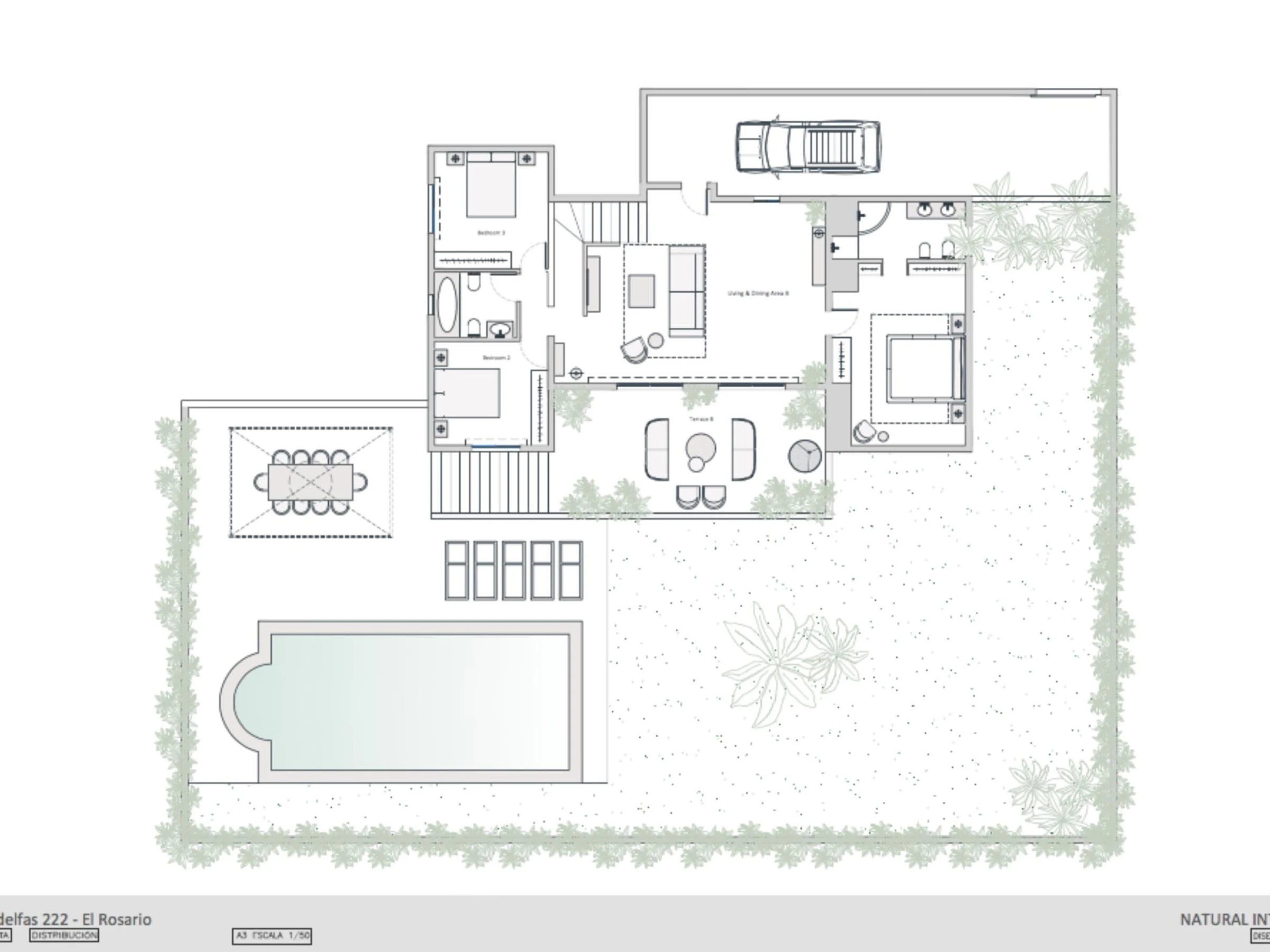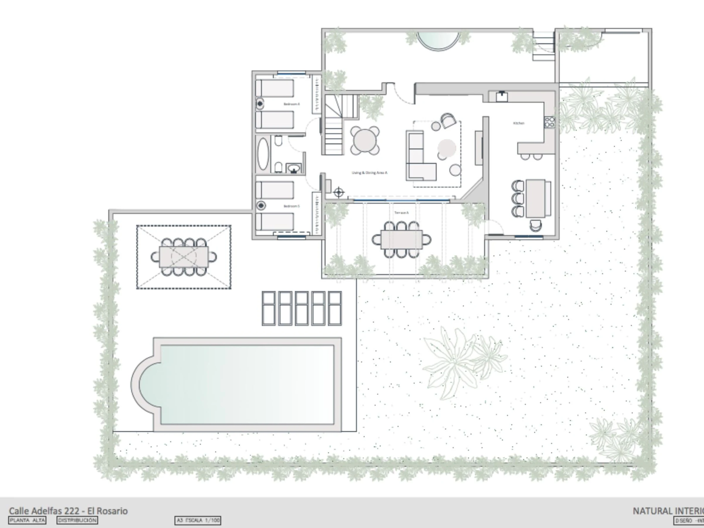 L'étage principal est composé de trois chambres avec deux salles de bains ; La chambre principale avec une salle de bain attenante ; Le séjour spacieux et moderne avec un coin repas donnant sur une terrasse couverte donnant sur le jardin et la piscine