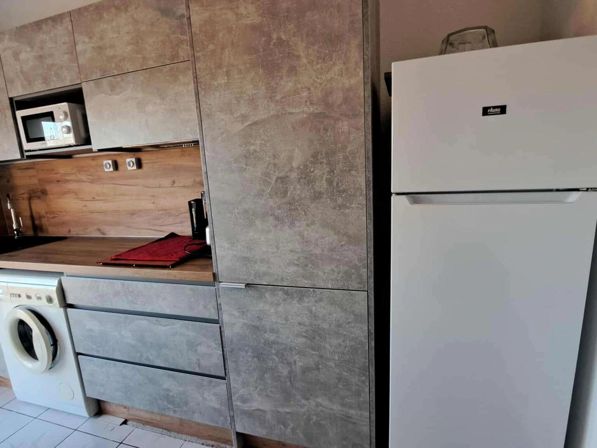 Dès votre arrivée sur votre droite se trouve le séjour où une télévision, une table et des chaises vous attendent pour des moments de détente en famille ou entre amis. Une cuisine équipée vous offre tout le nécessaire pour préparer de délicieux repas, avec des plaques à induction, une hotte, un micro-ondes,un mini-four, une bouilloire, une cafetière électriques, un réfrigérateur/congélateur et même un lave-linge pour votre plus grand confort.