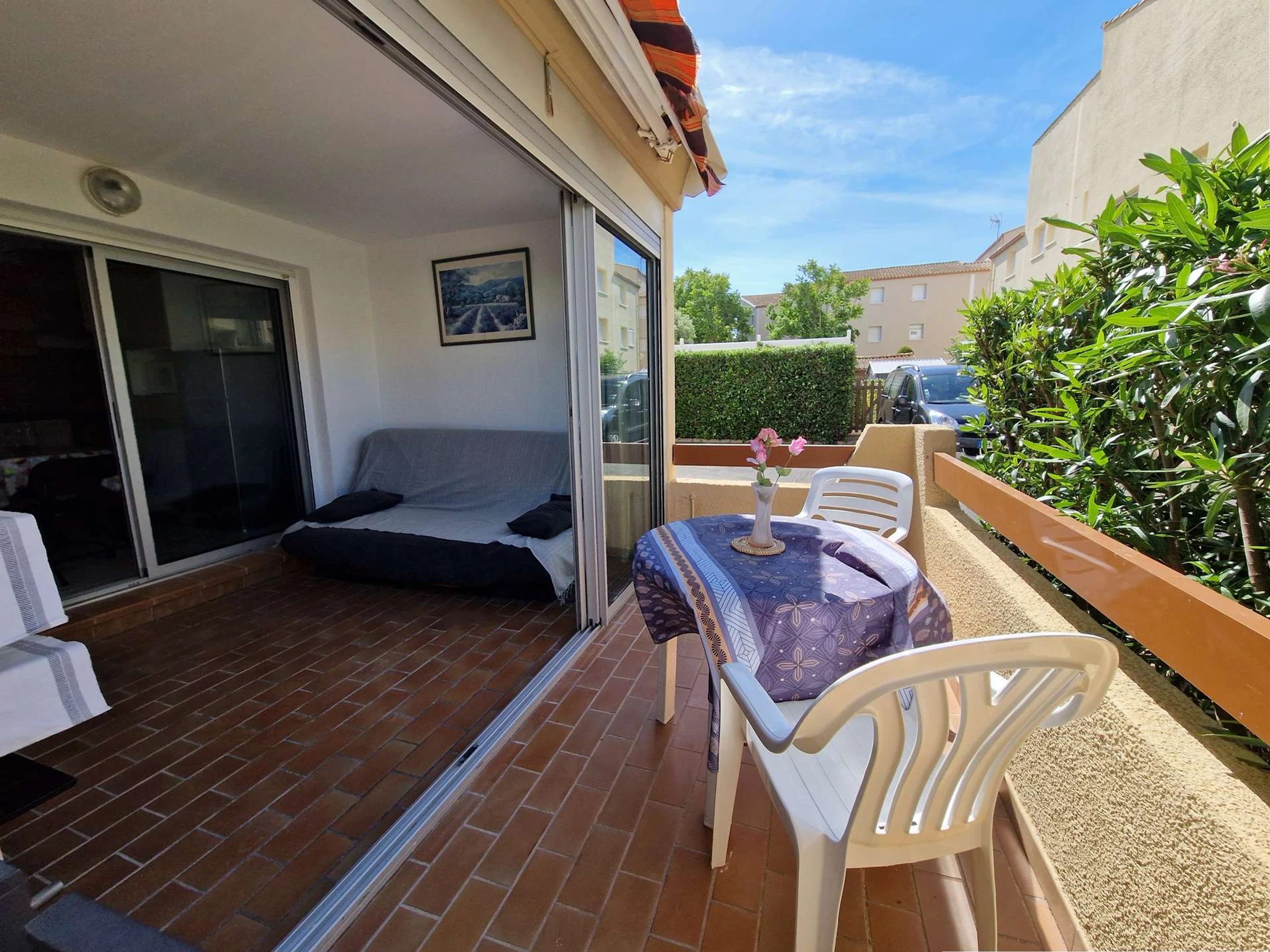 Une véranda avec un canapé convertible.
