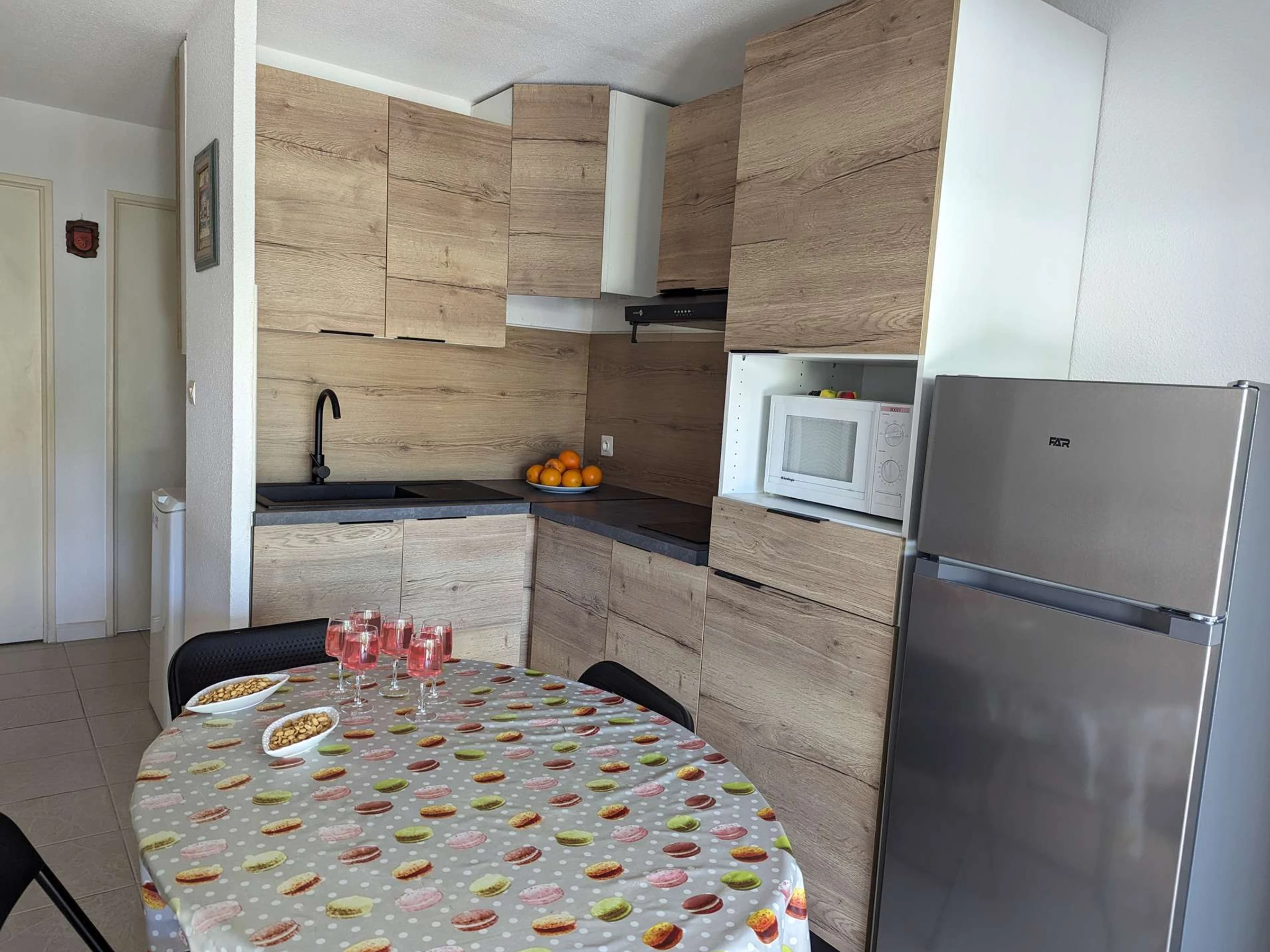 Une cuisine ouverte avec une plaque vitrocéramique, un mini-four, un four à micro-ondes, un réfrigérateur/congélateur, une cafetière électrique, un lave-linge.