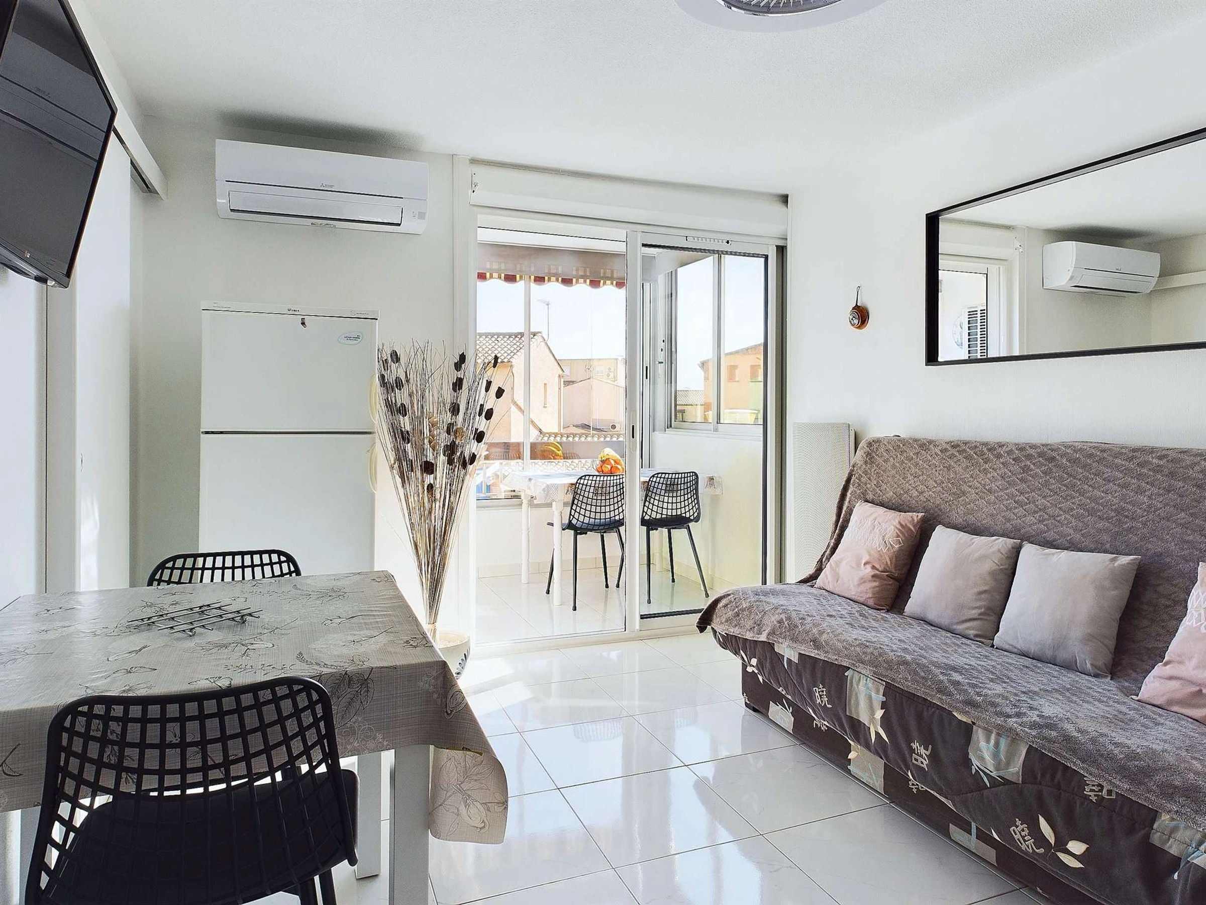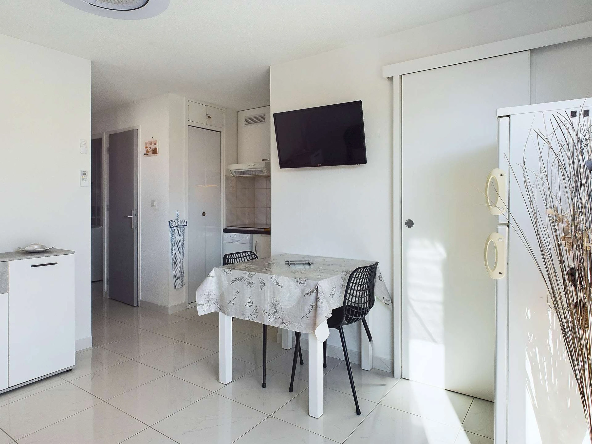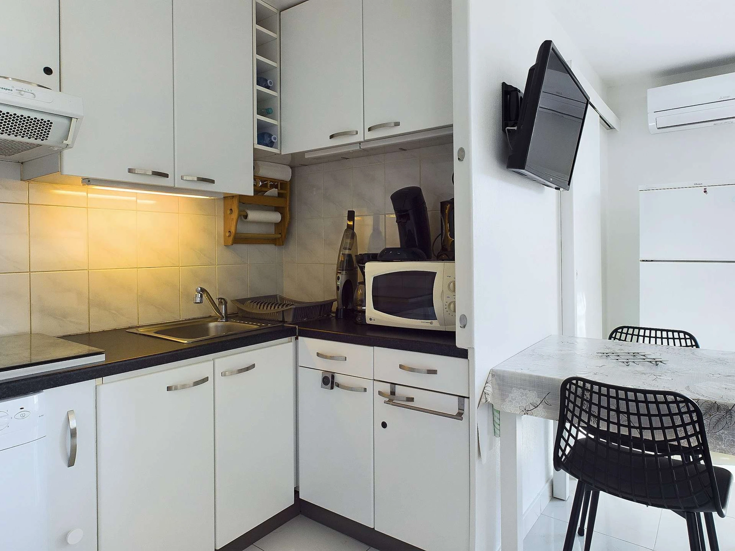 Pièce de vie climatisé composé d'une cuisine équipé avec plaques à inductions, micro ondes, mini four, frigo avec partie congélateur, cafetière électrique à filtres et senseo, lave-vaisselle et aspirateur de table.