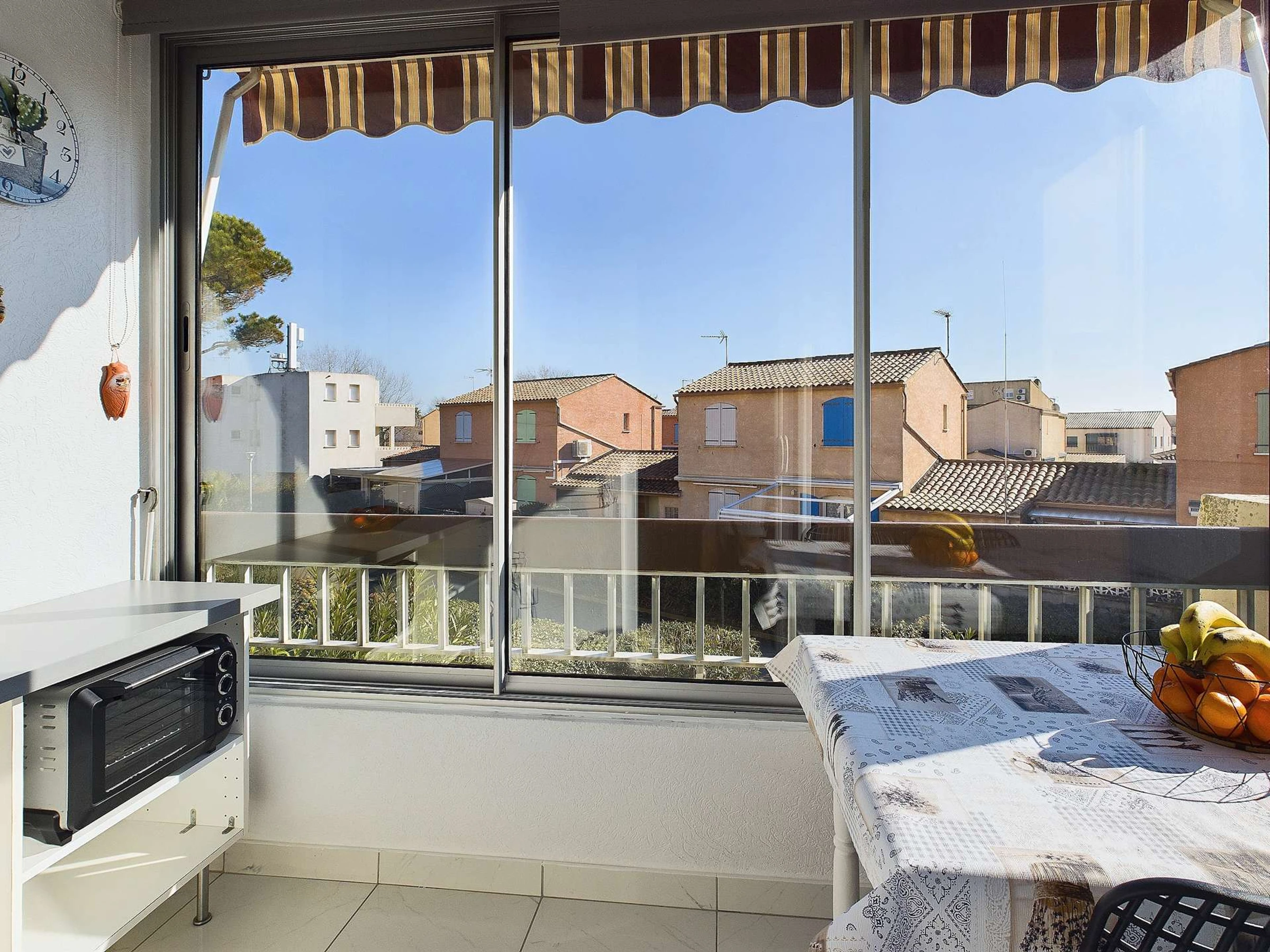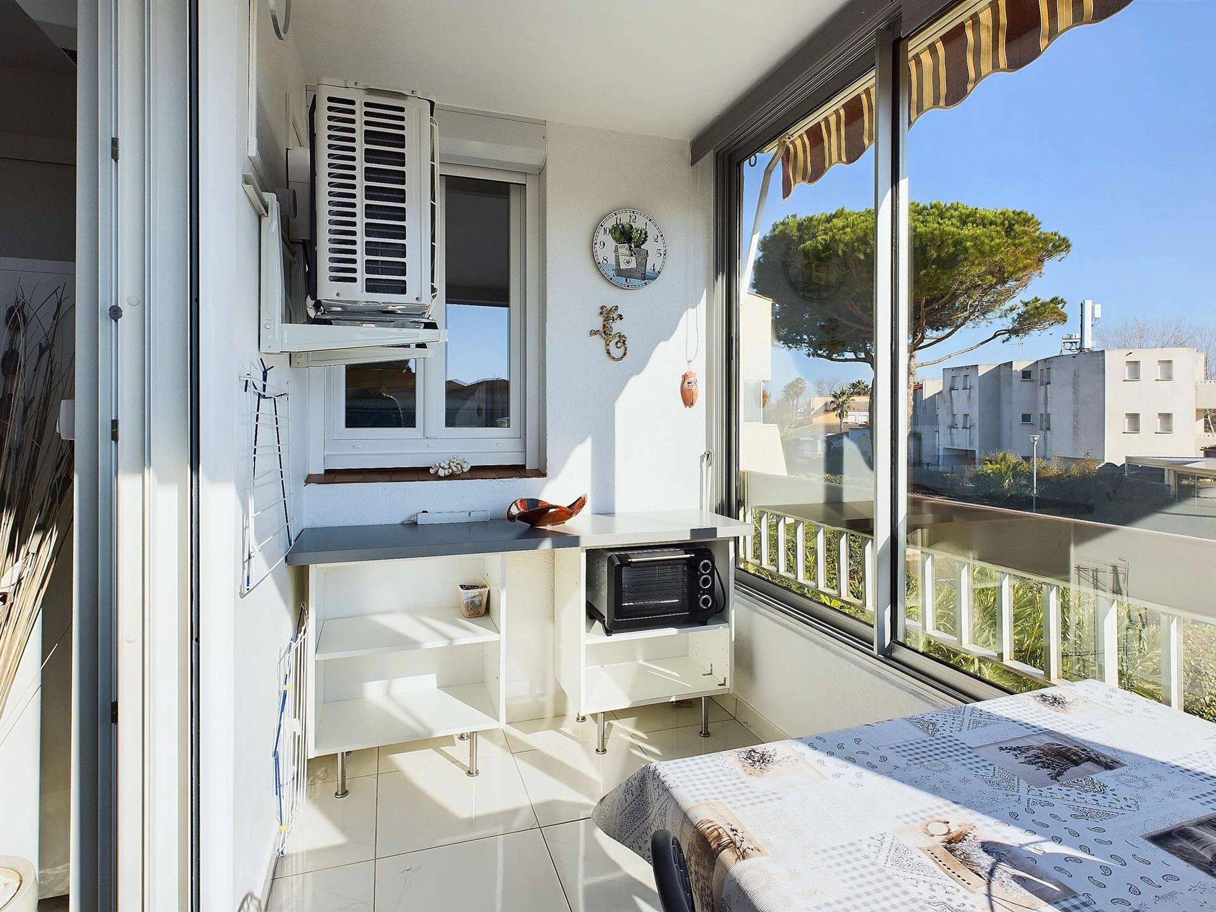 Loggia avec coin repas table et chaises et store ban.