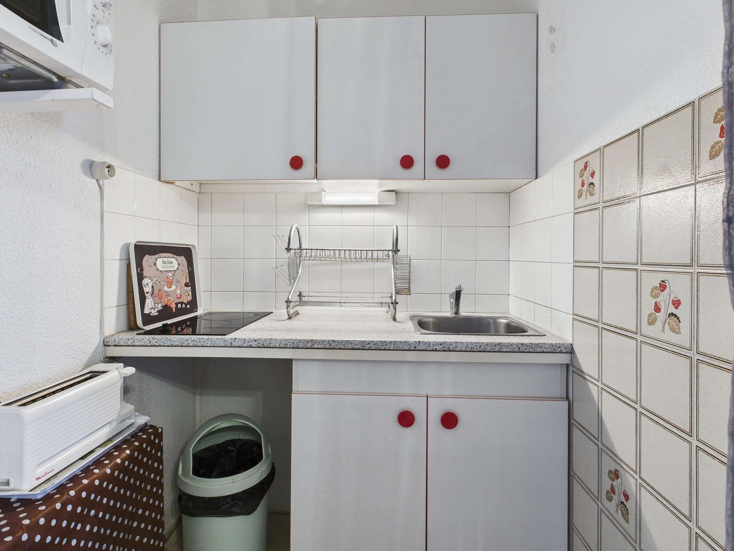 Séjour avec canapé convertible BZ et une Tv, coin cuisine avec 2 plaques vitrocéramiques, 1 réfrigérateur congélateur,1 micro ondes, 1 cafetière Senseo et un lave linge.