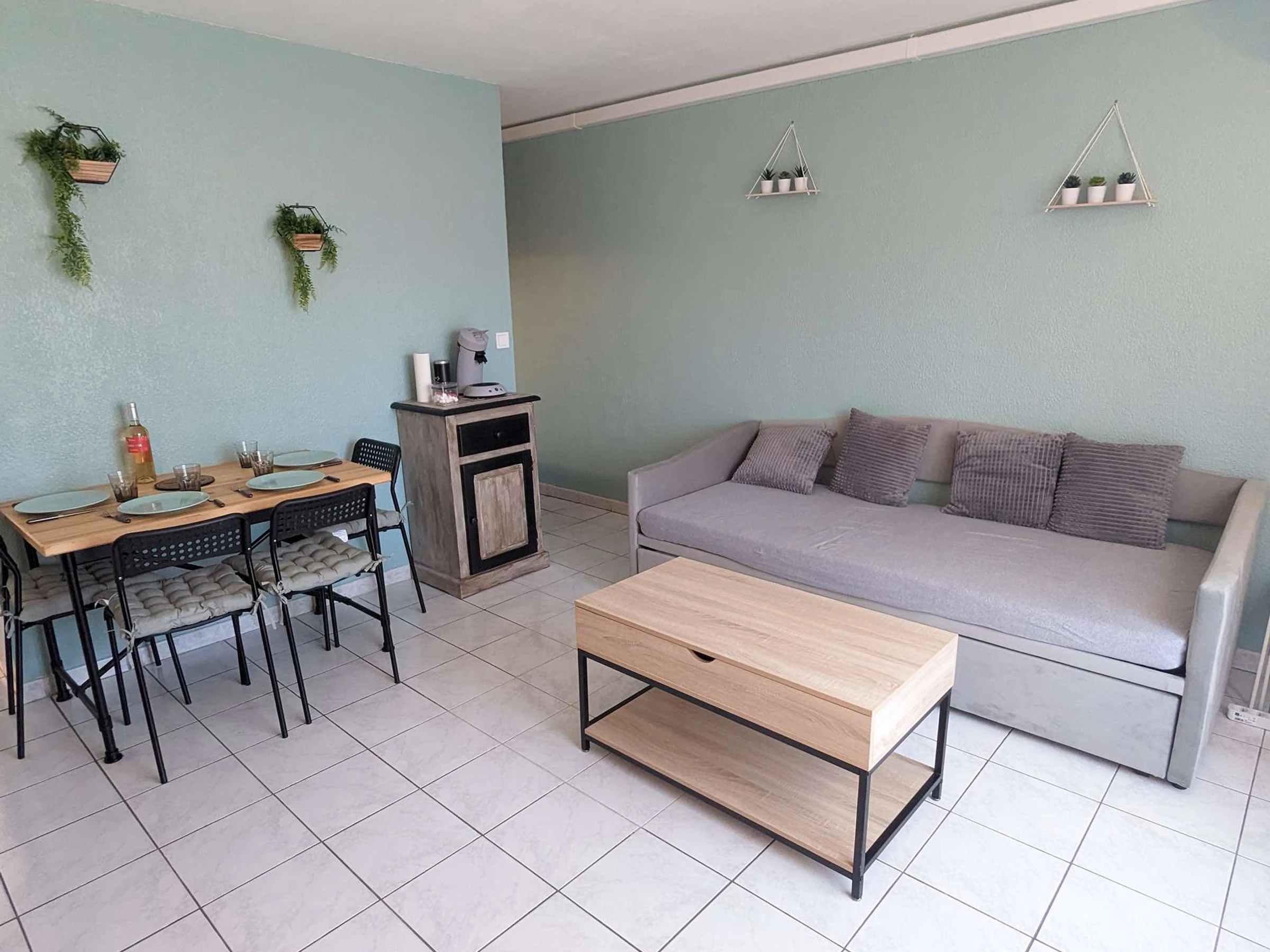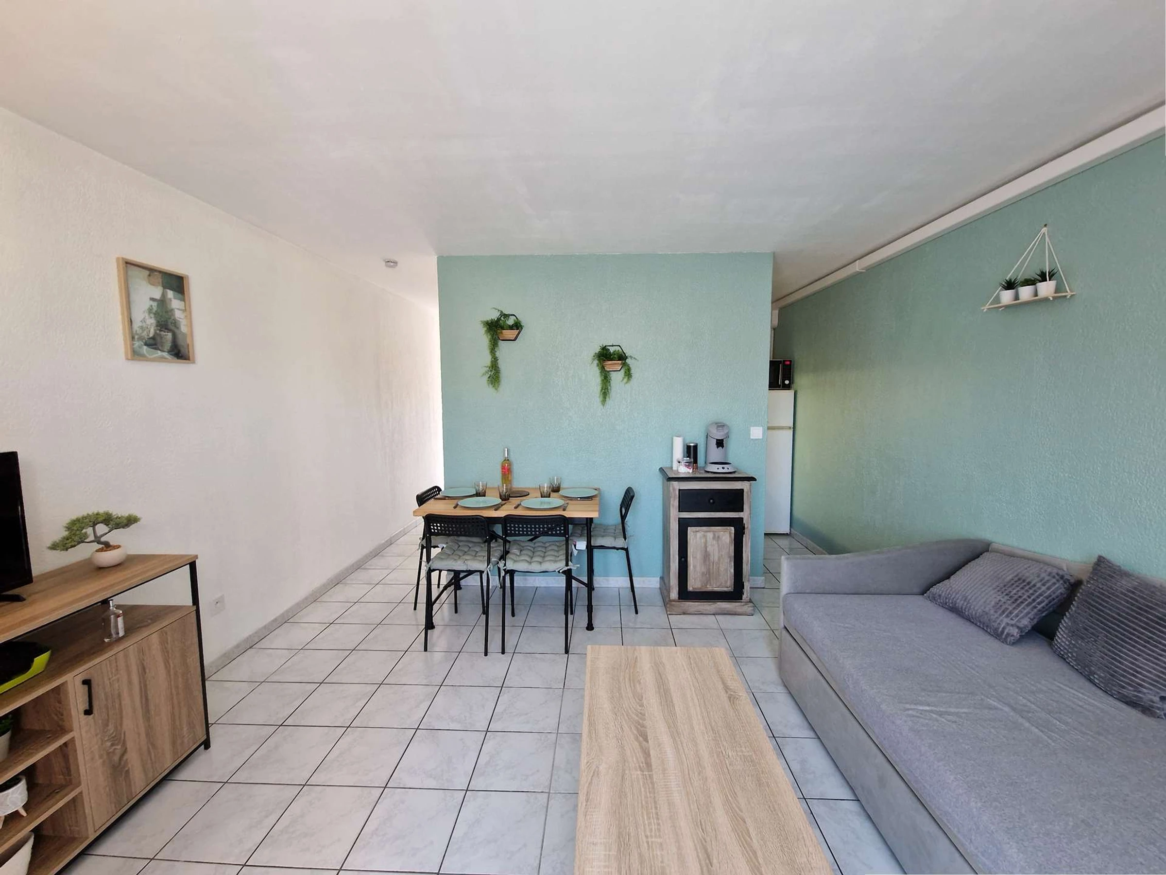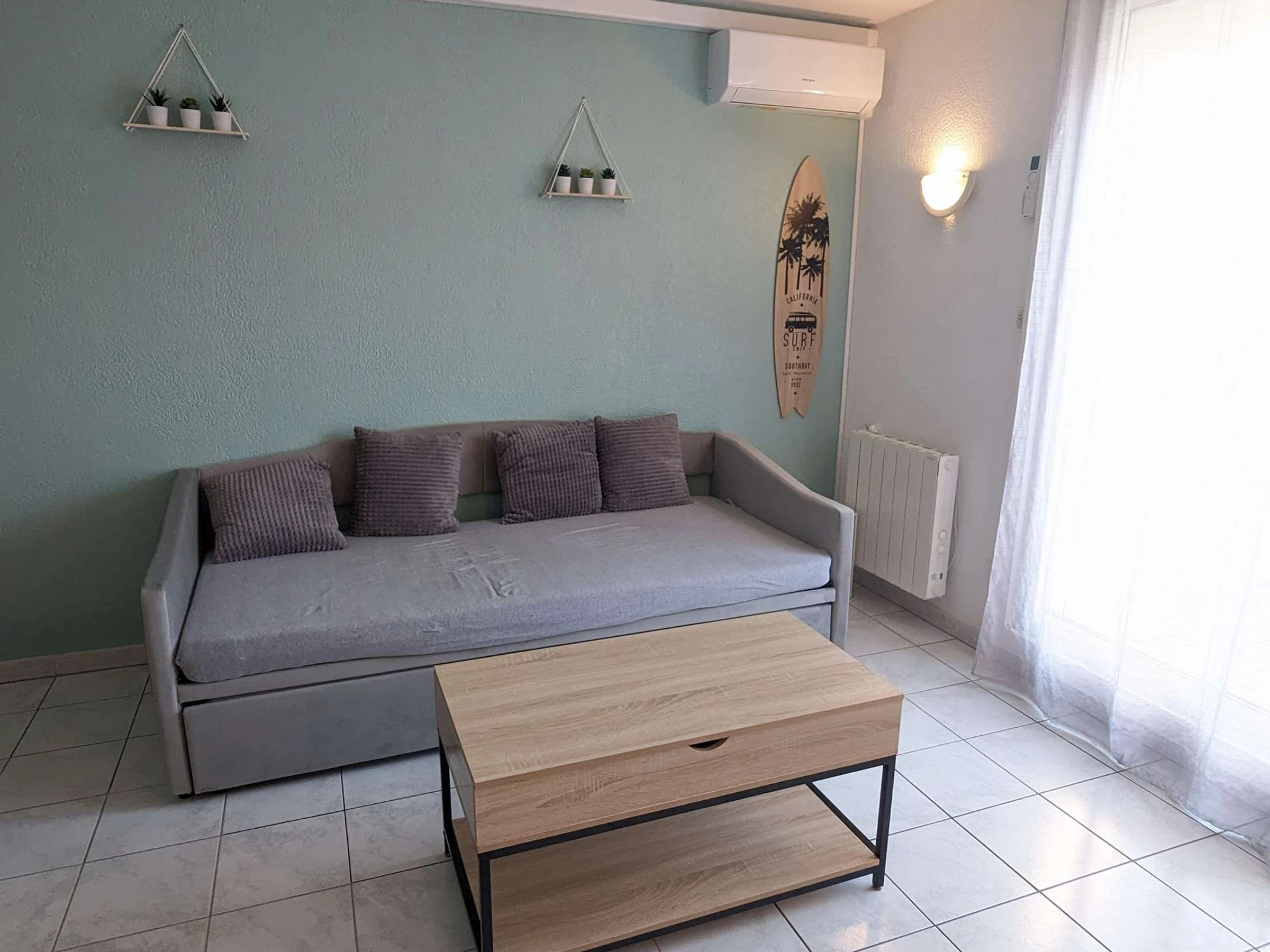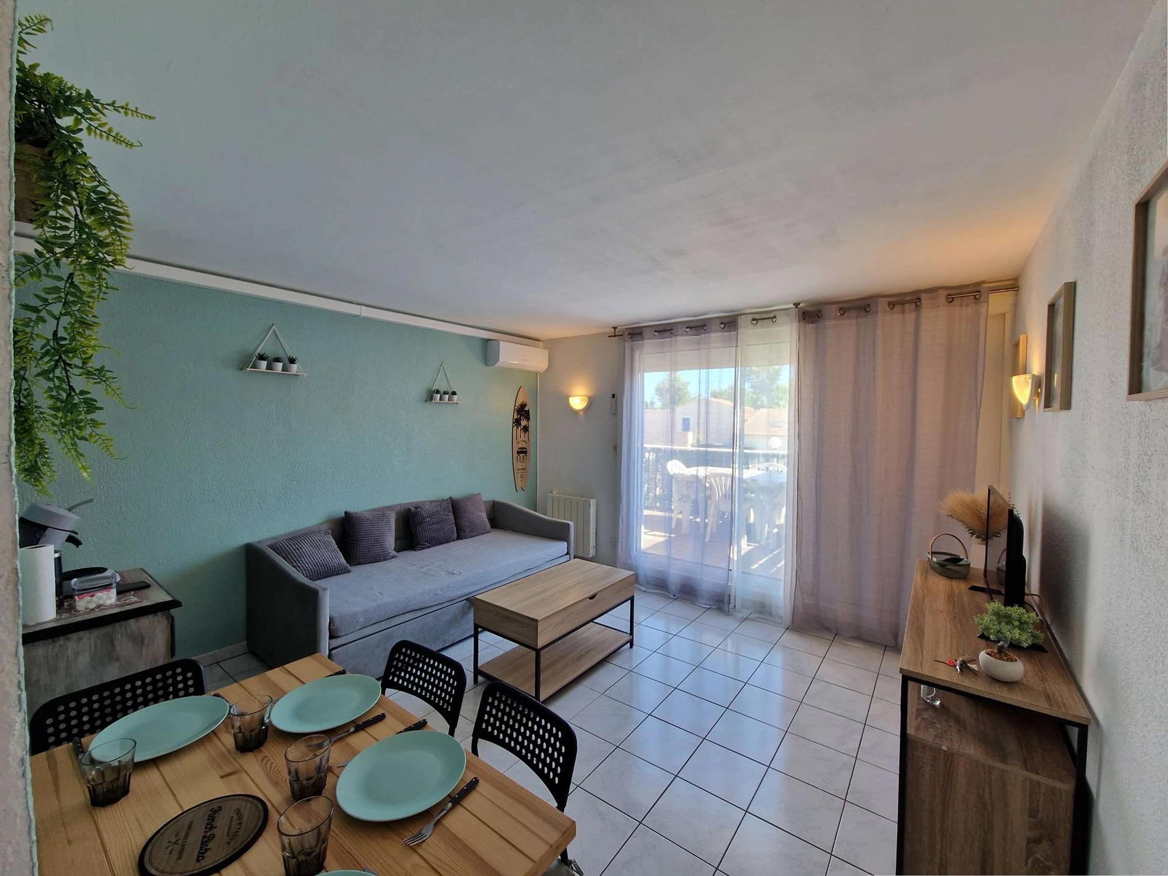 Séjour lumineux aménagé avec un canapé convertible (180x200), une table, des chaises, une TV, et une climatisation. Idéal pour se détendre.