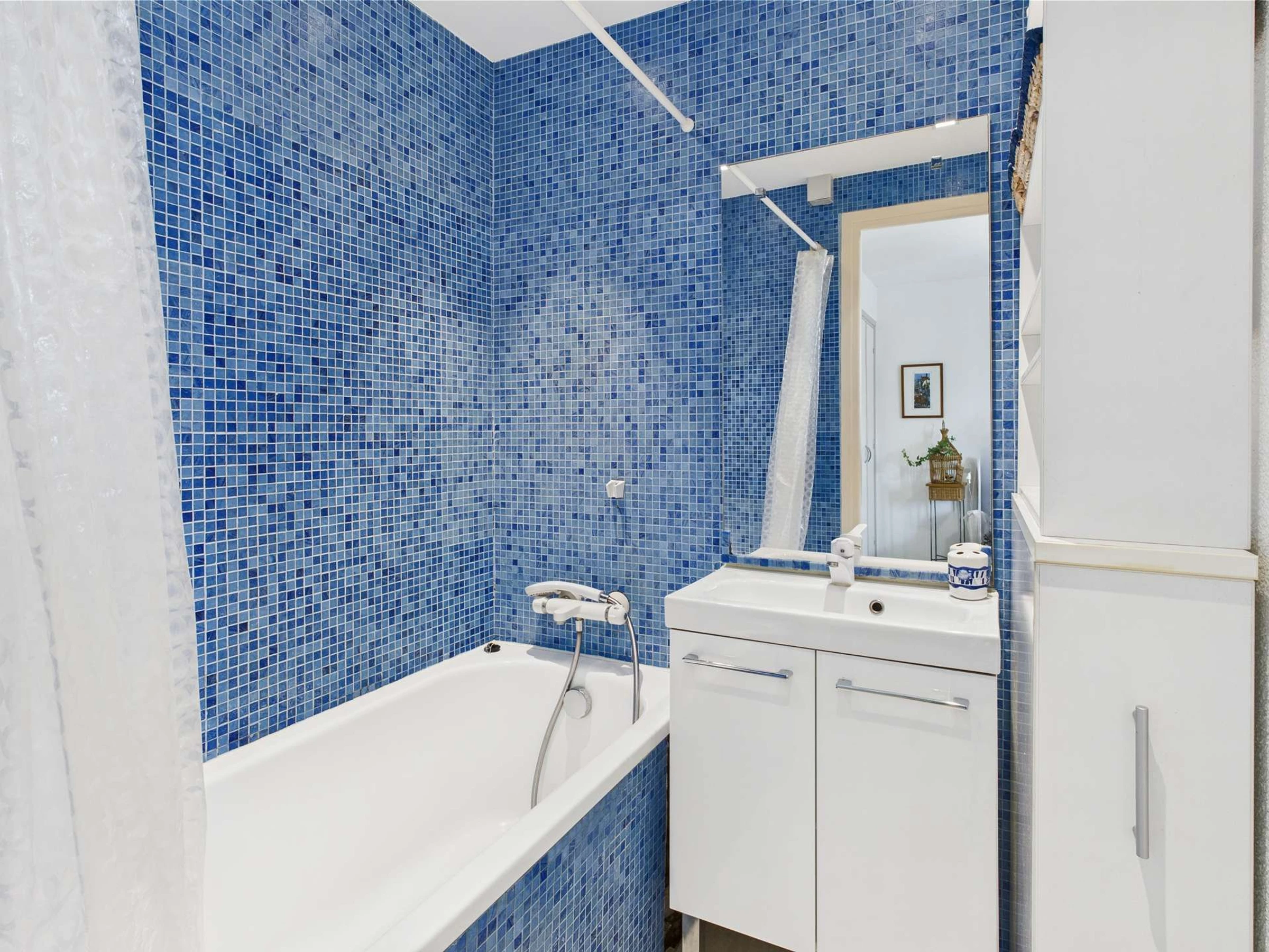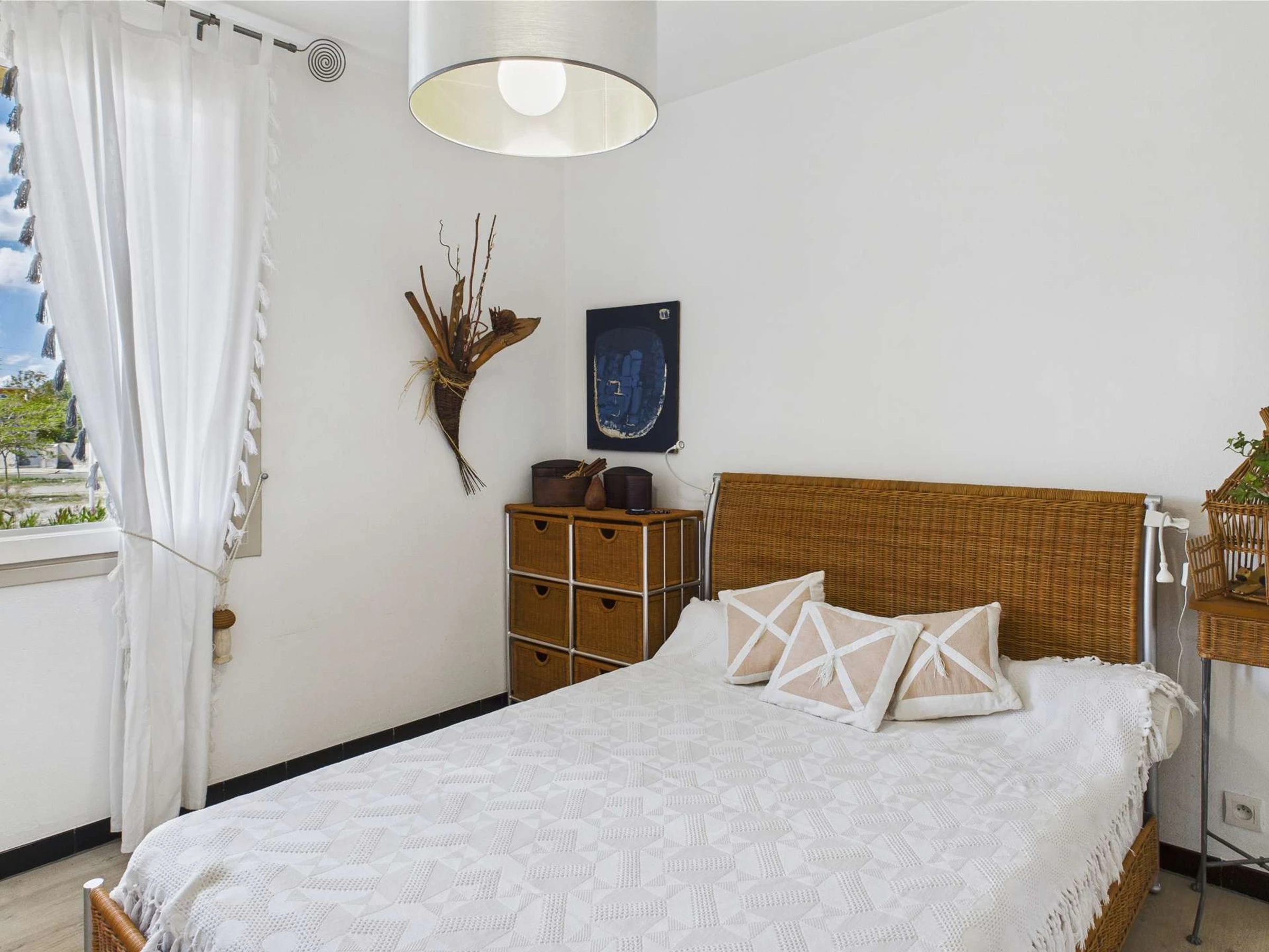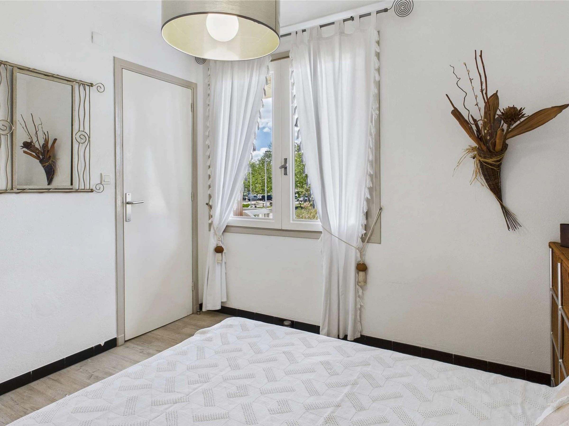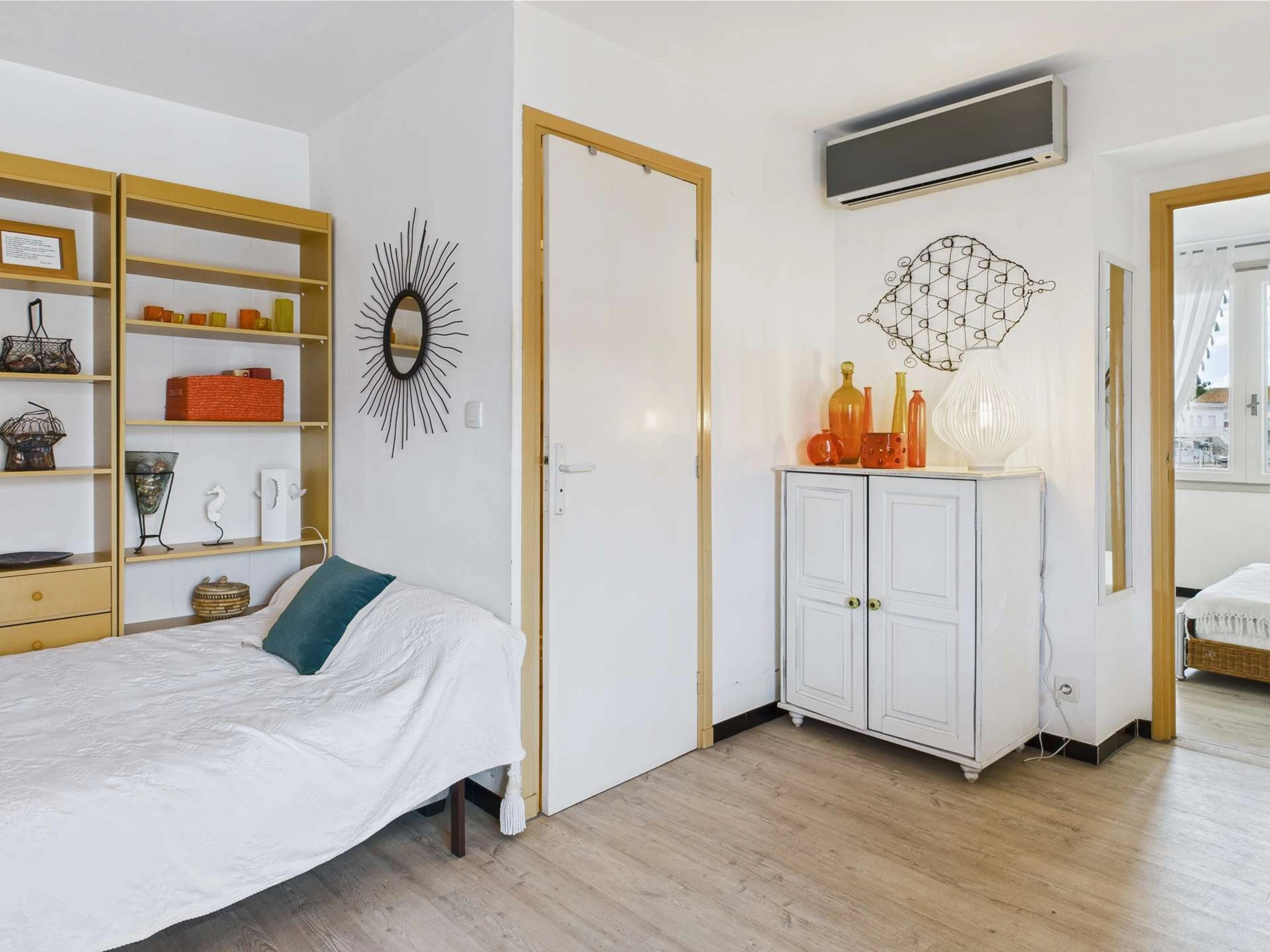 En passant par cette chambre, vous accédez à la seconde chambre, équipée d’un lit simple (120 cm), d’un canapé convertible type clic-clac (140 cm) et de sa propre salle d’eau.