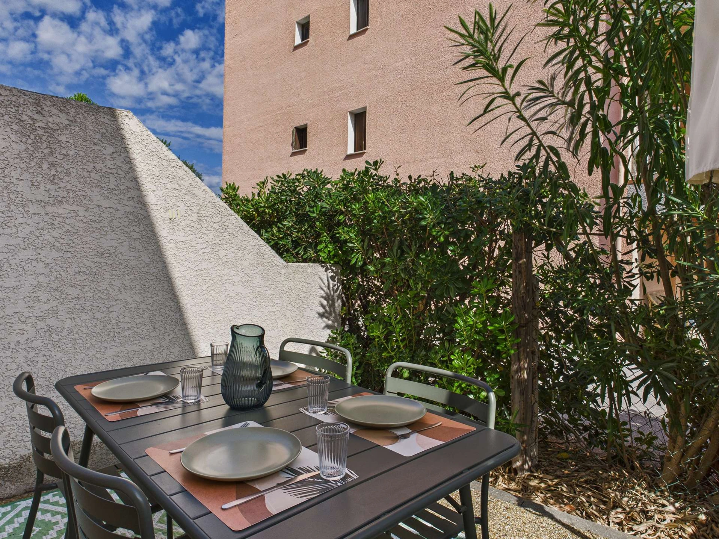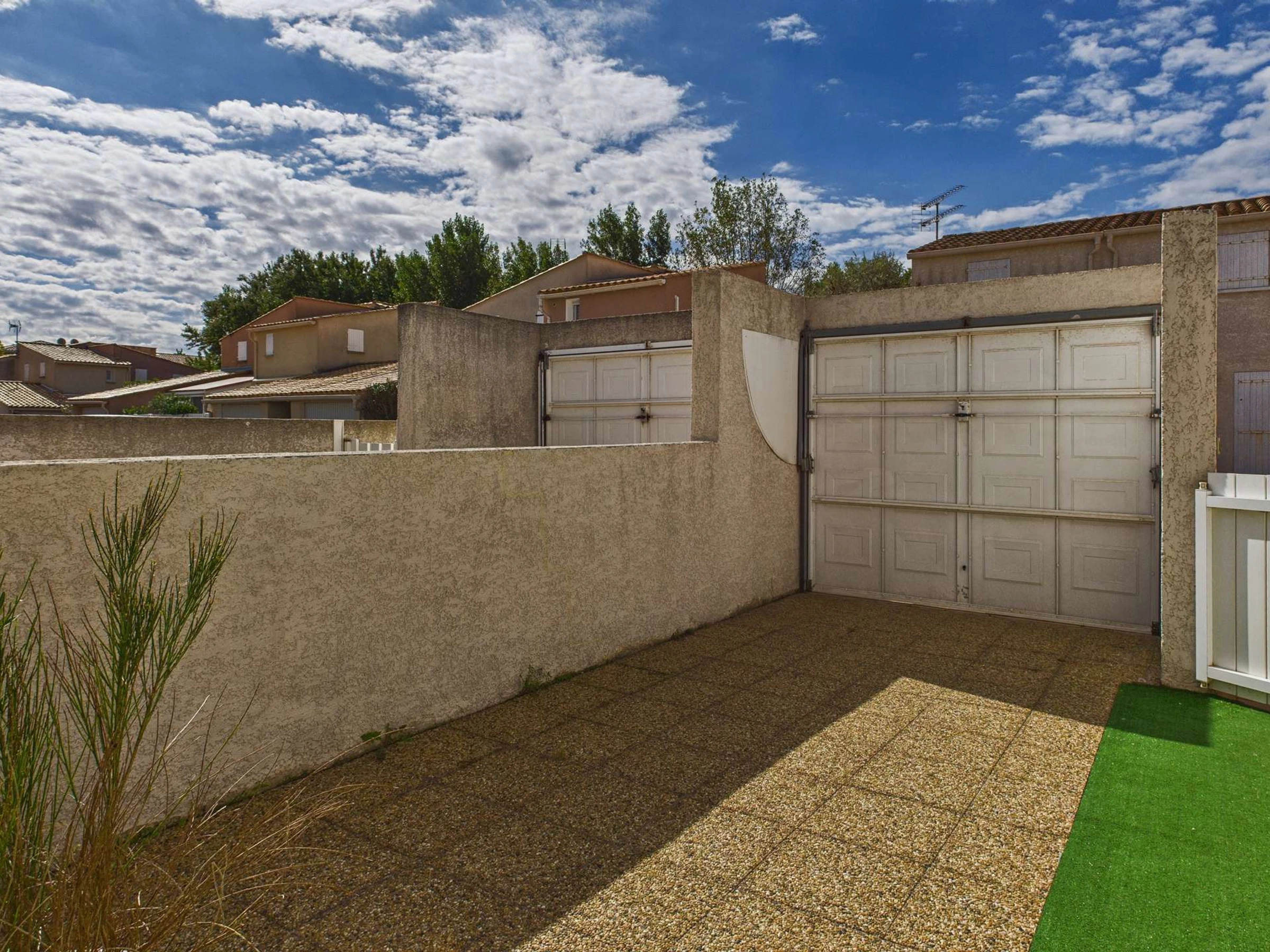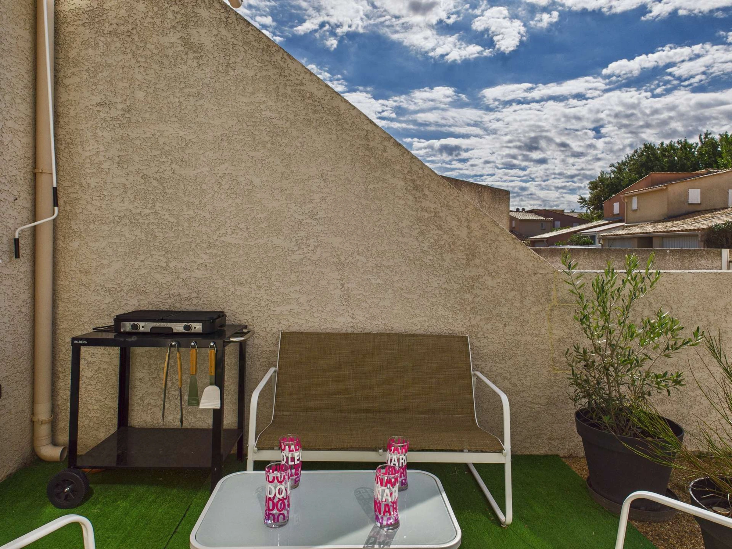 Terrasse à l'avant de la maison clôturée avec store salon de jardin et plancha électrique.