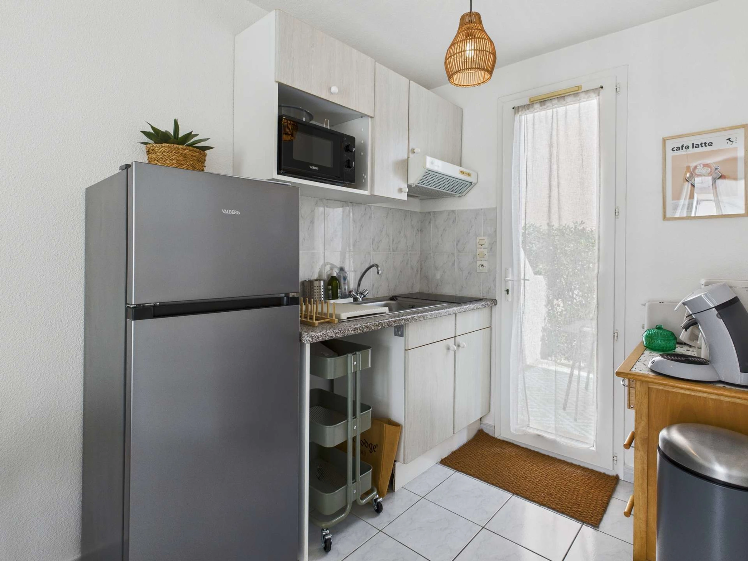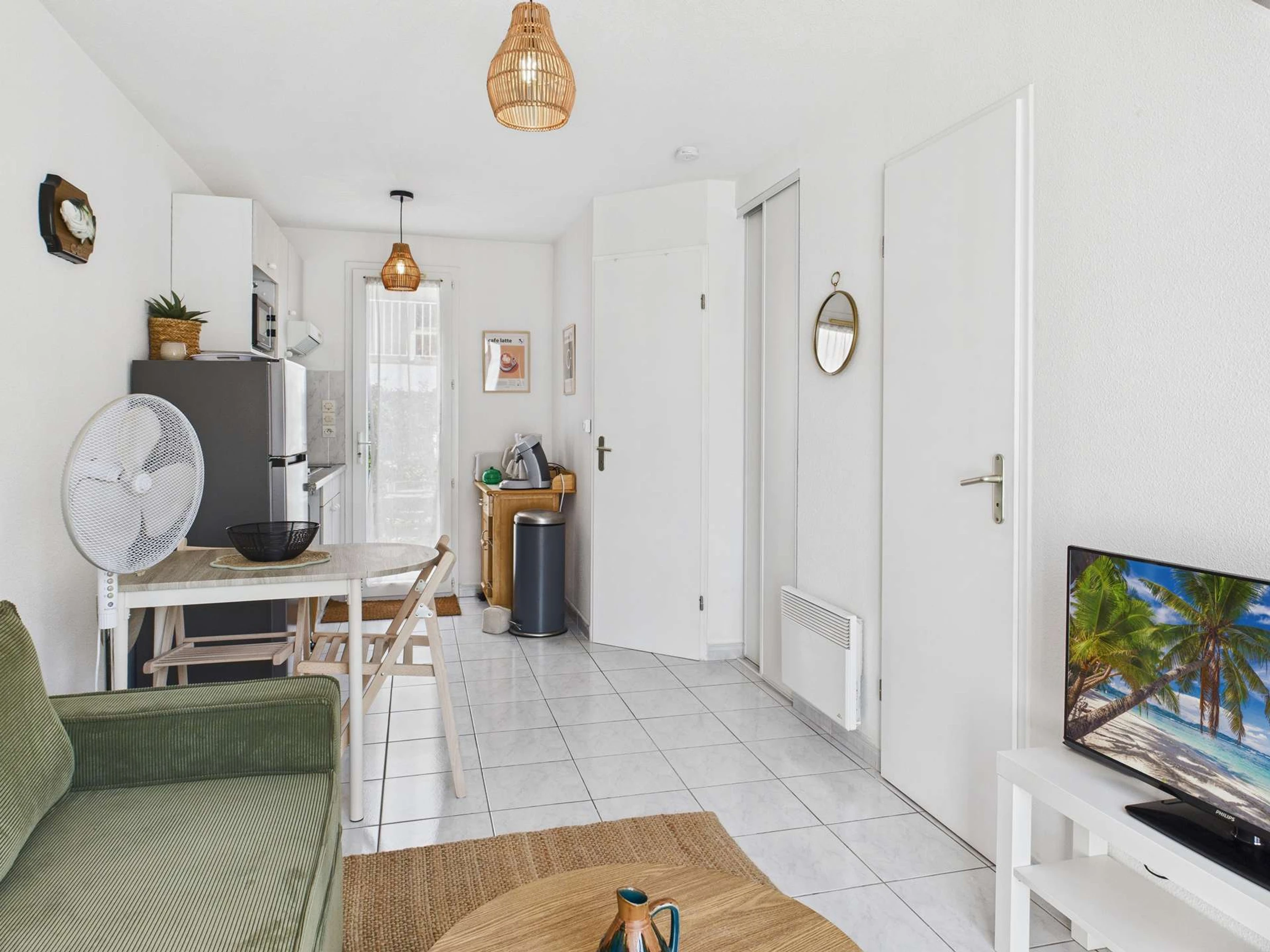 Une petite maison mitoyenne composée au rez-de-chaussée d'un séjour avec un canapé et une télévision. Le coin cuisine équipé ( frigo/congélateur, micro-ondes, cafetière senseo).Salle de douche.