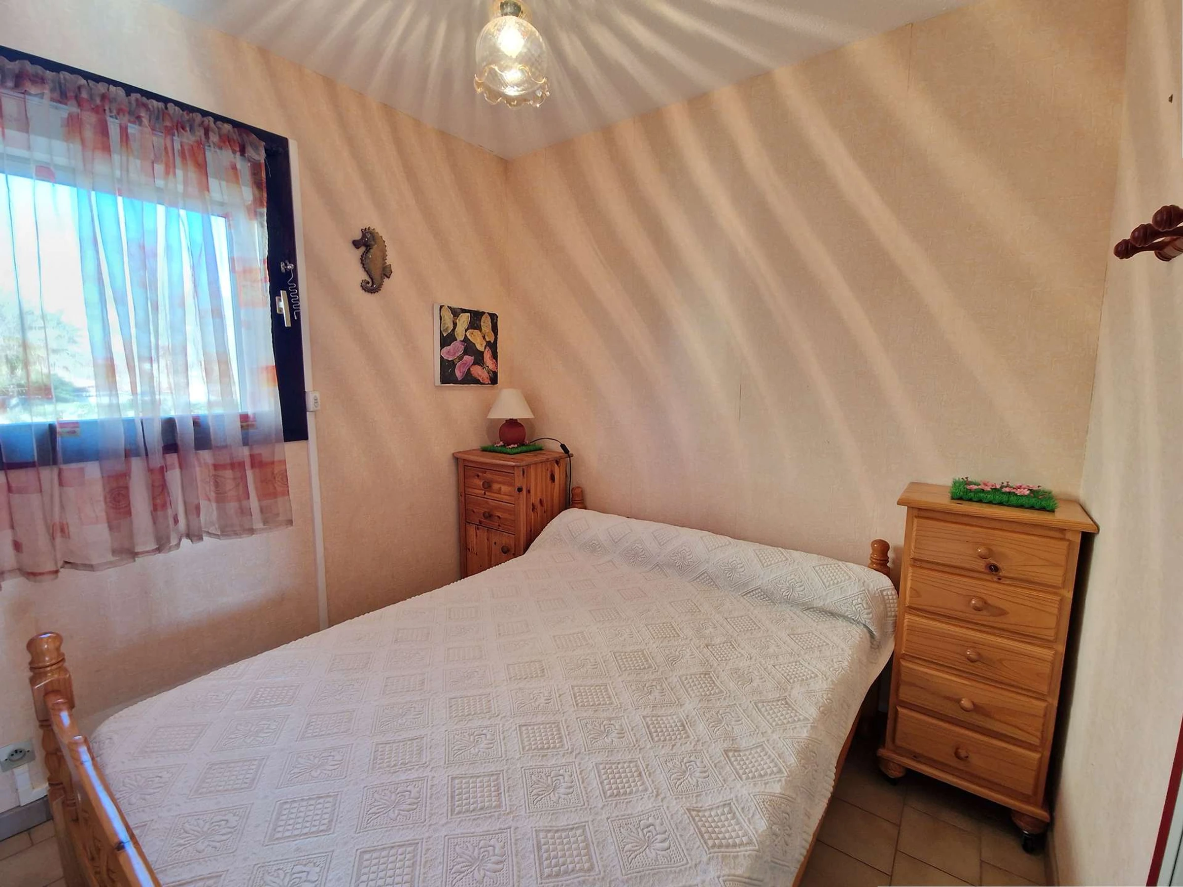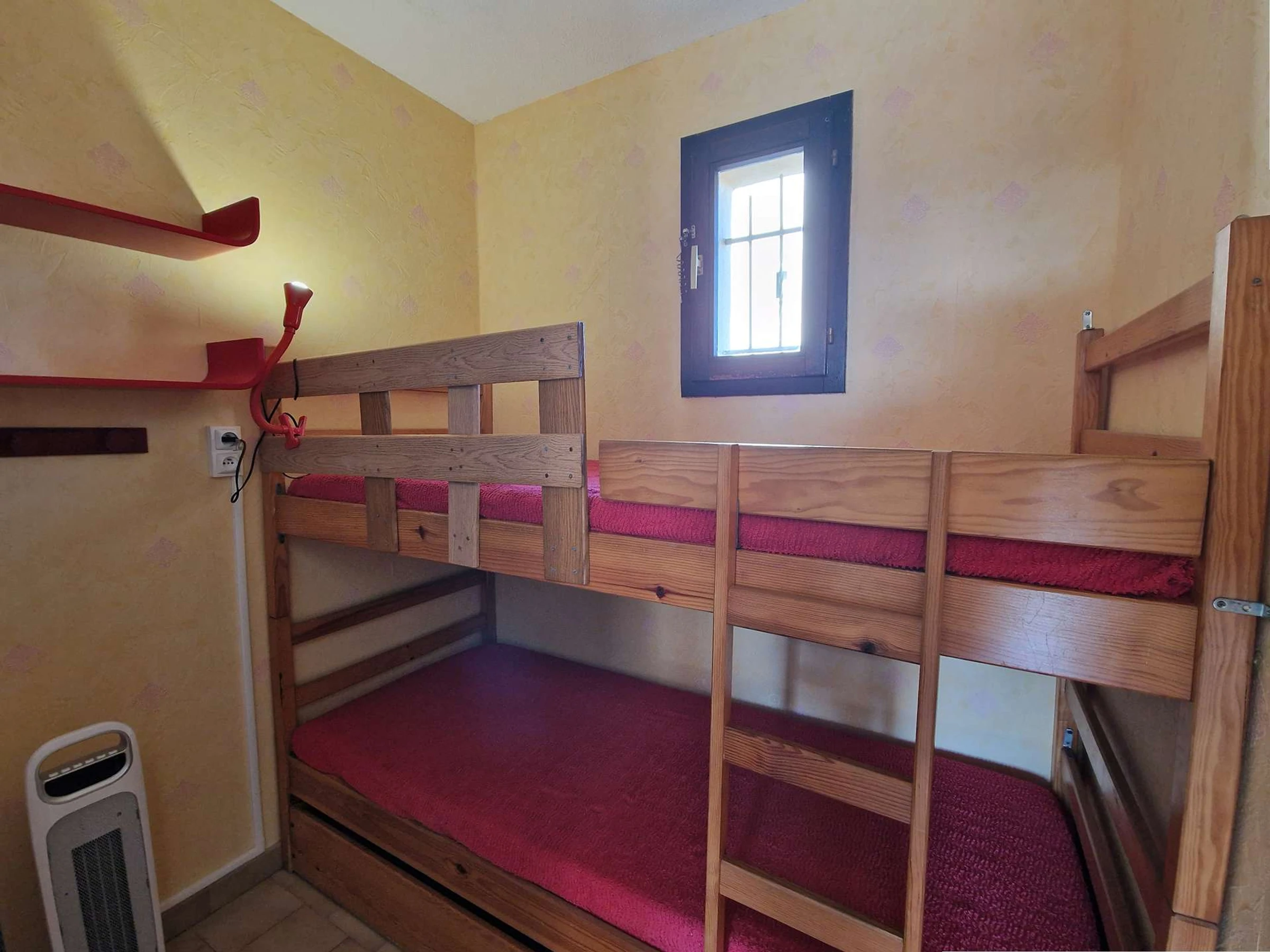 Une chambre avec grand lit. Une petite chambre avec 2 lits superposés.