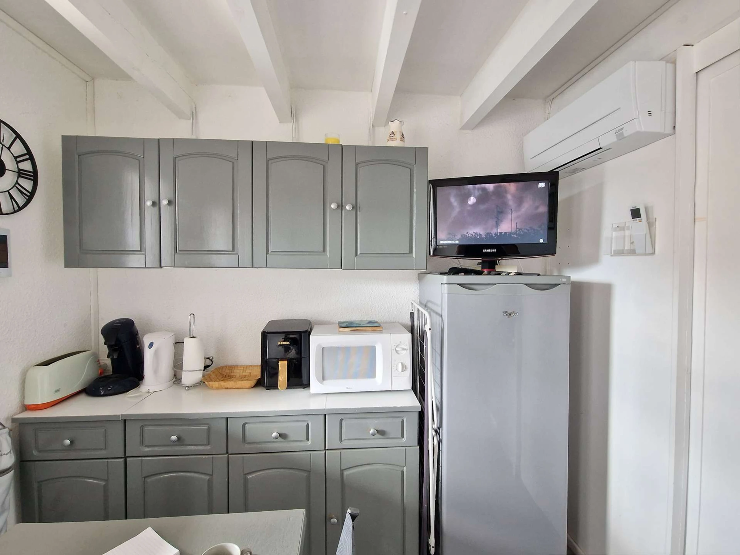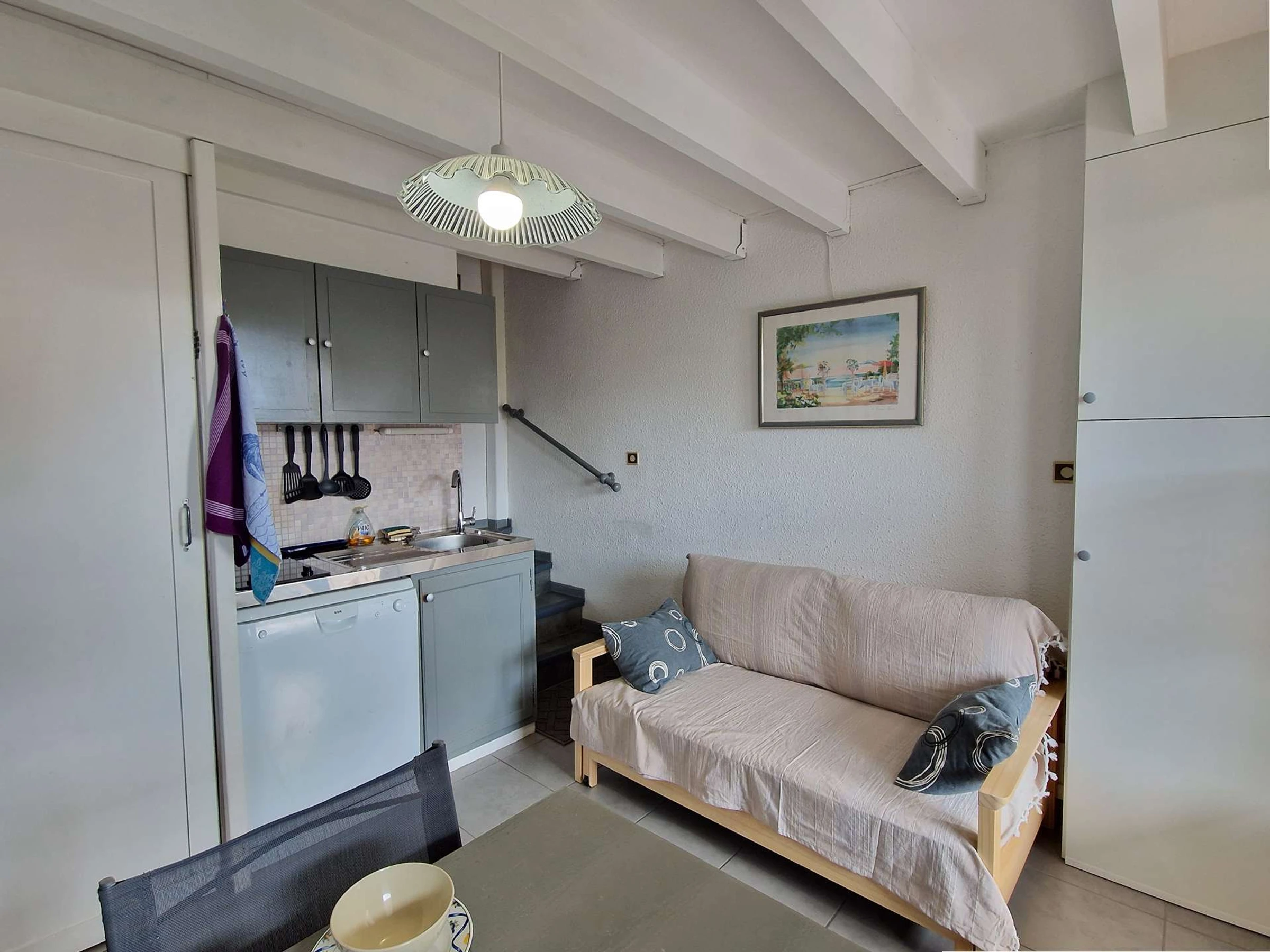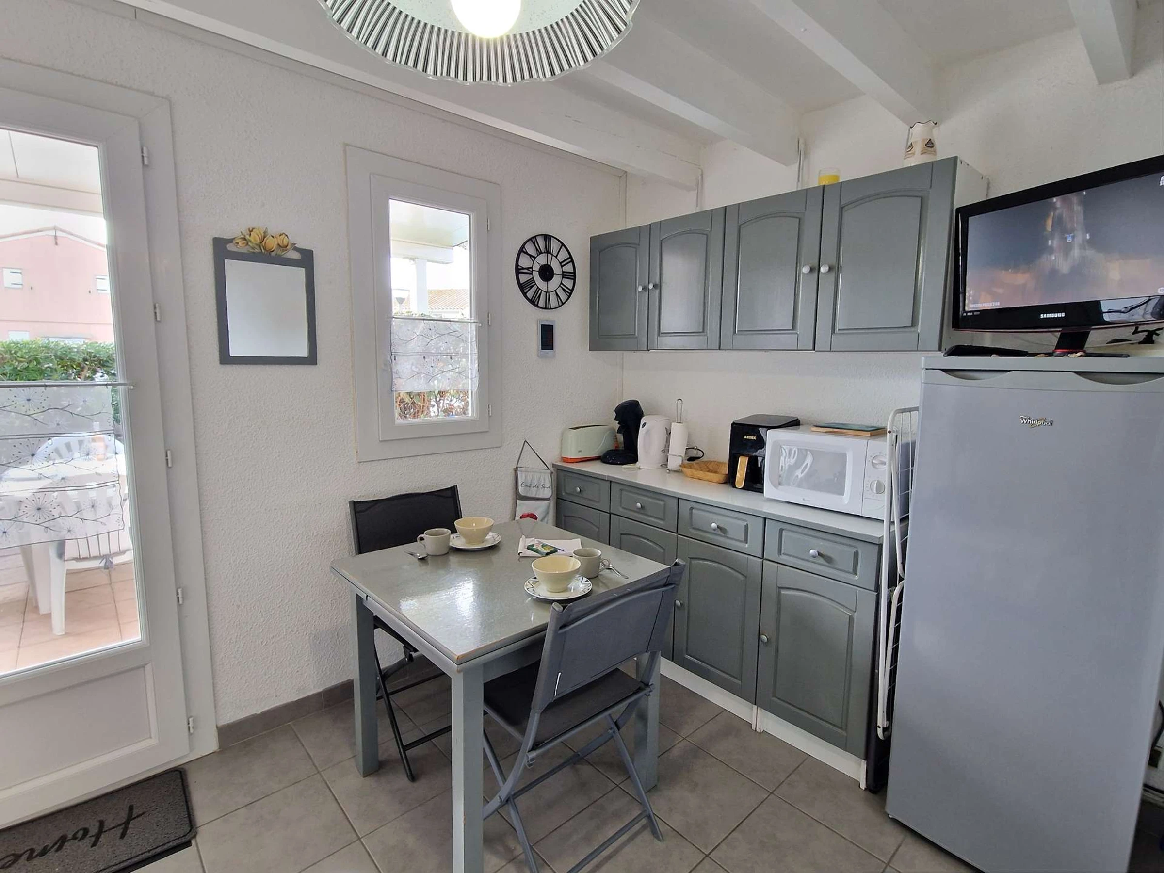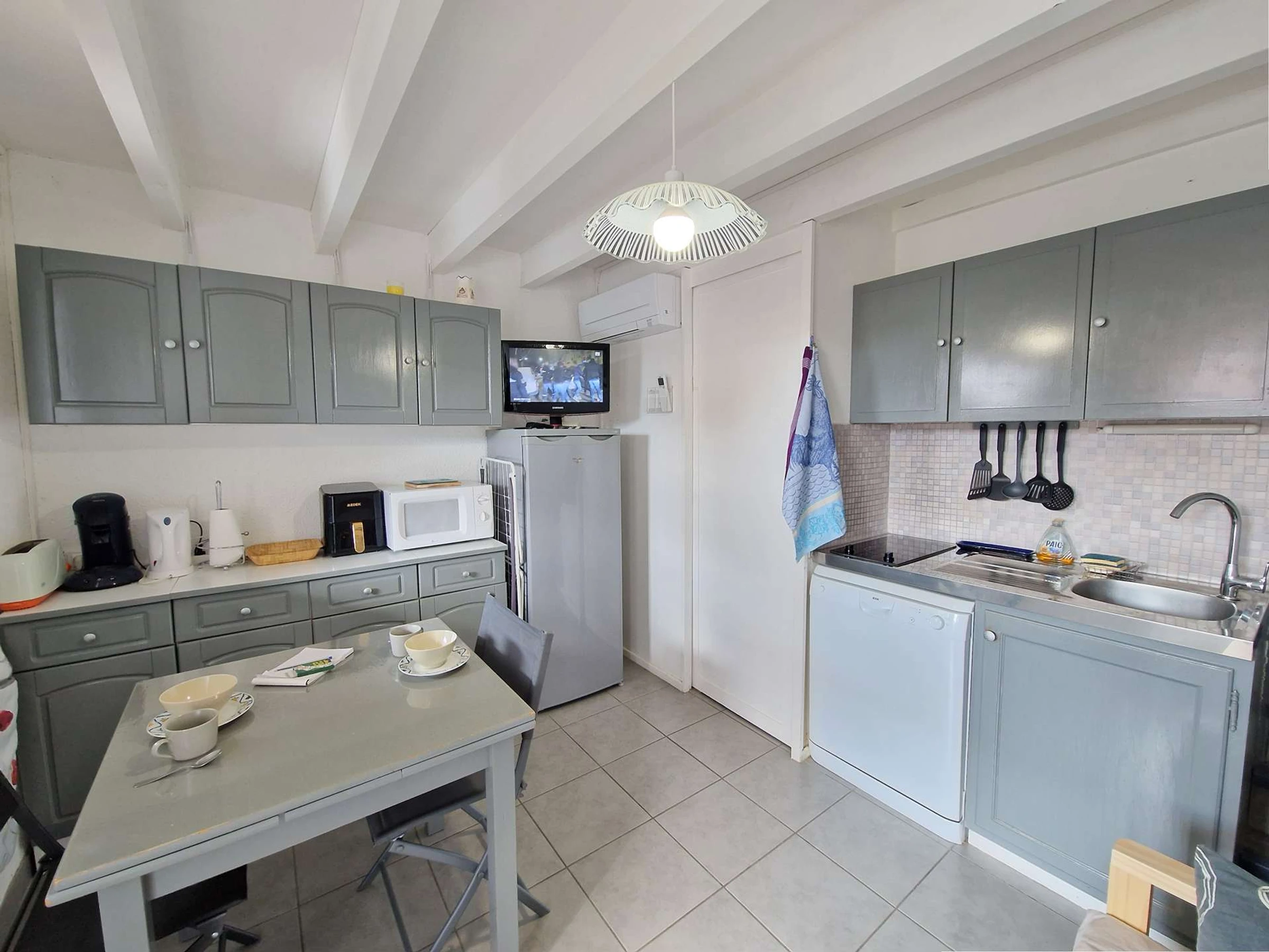 Cuisine équipée : micro-ondes, mini-four, plaques électriques, cafetière électrique, réfrigérateur, bouilloire électrique, grille-pain et lave-vaisselle.