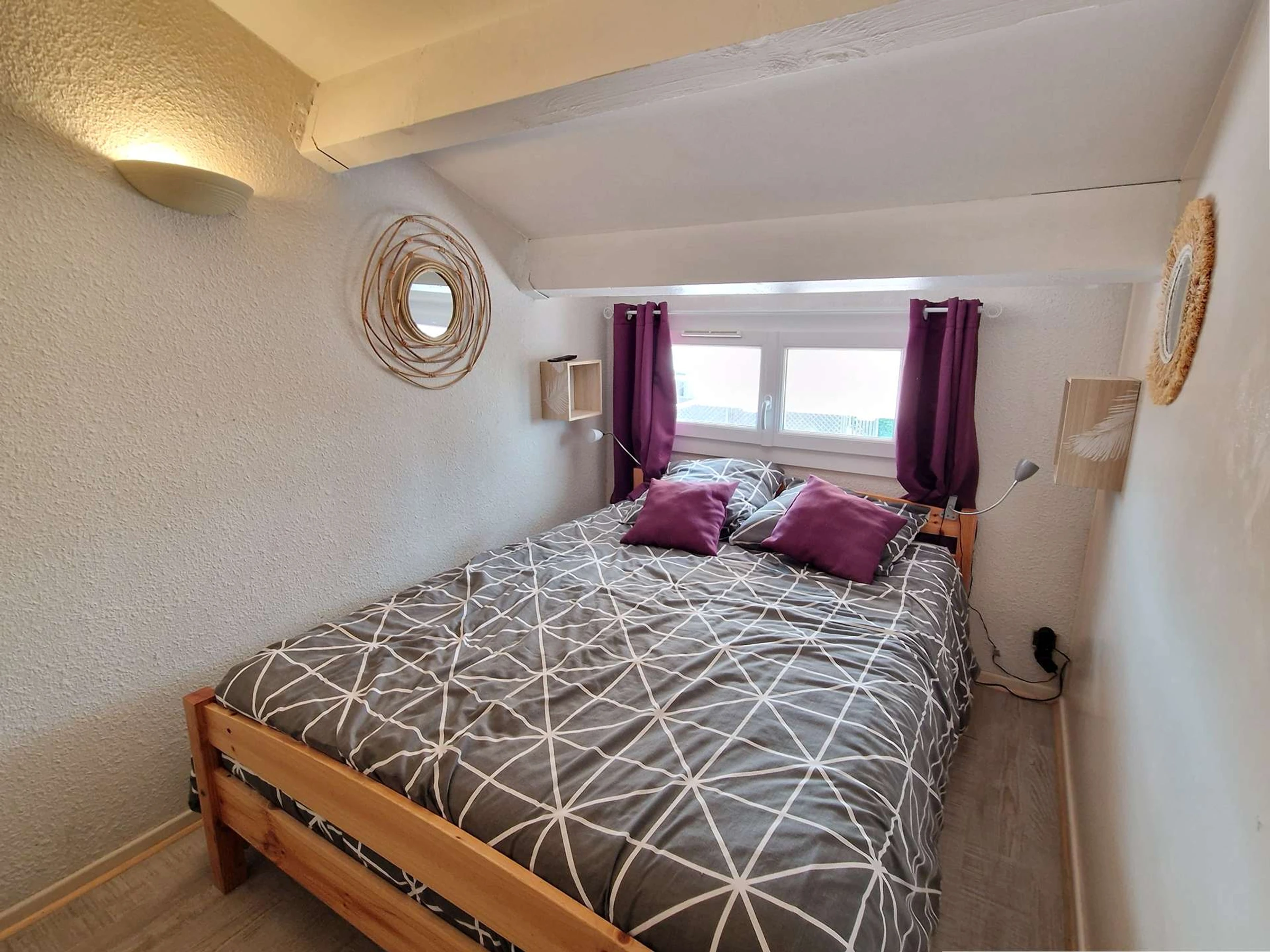 A l'étage : climatisation et chambres : une chambre avec un grand lit et une télévision, et un coin cabine avec 2 lits superposés, idéal pour les enfants.