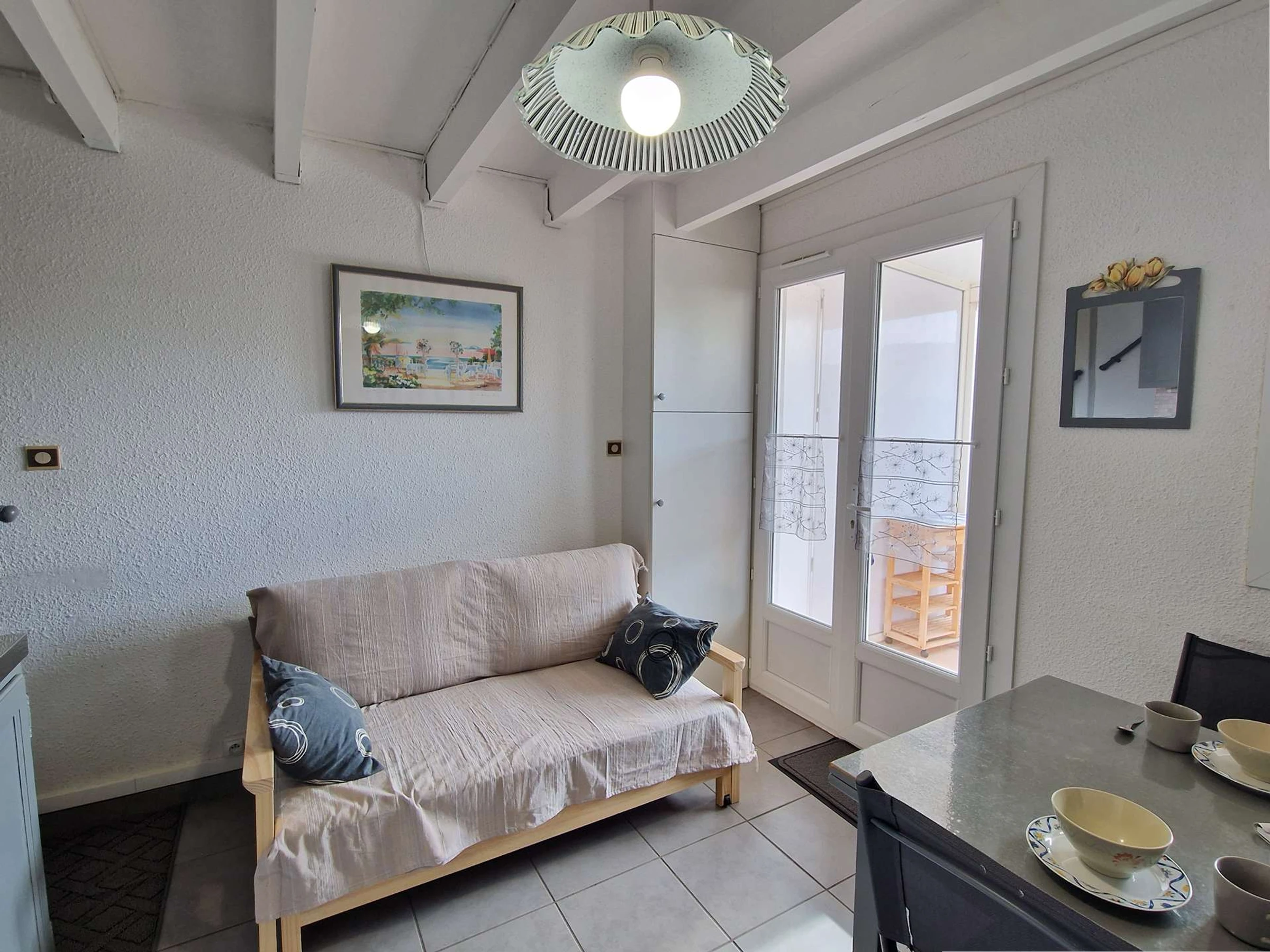 Séjour fonctionnel : climatisation, canapé convertible, table, chaises et télévision.