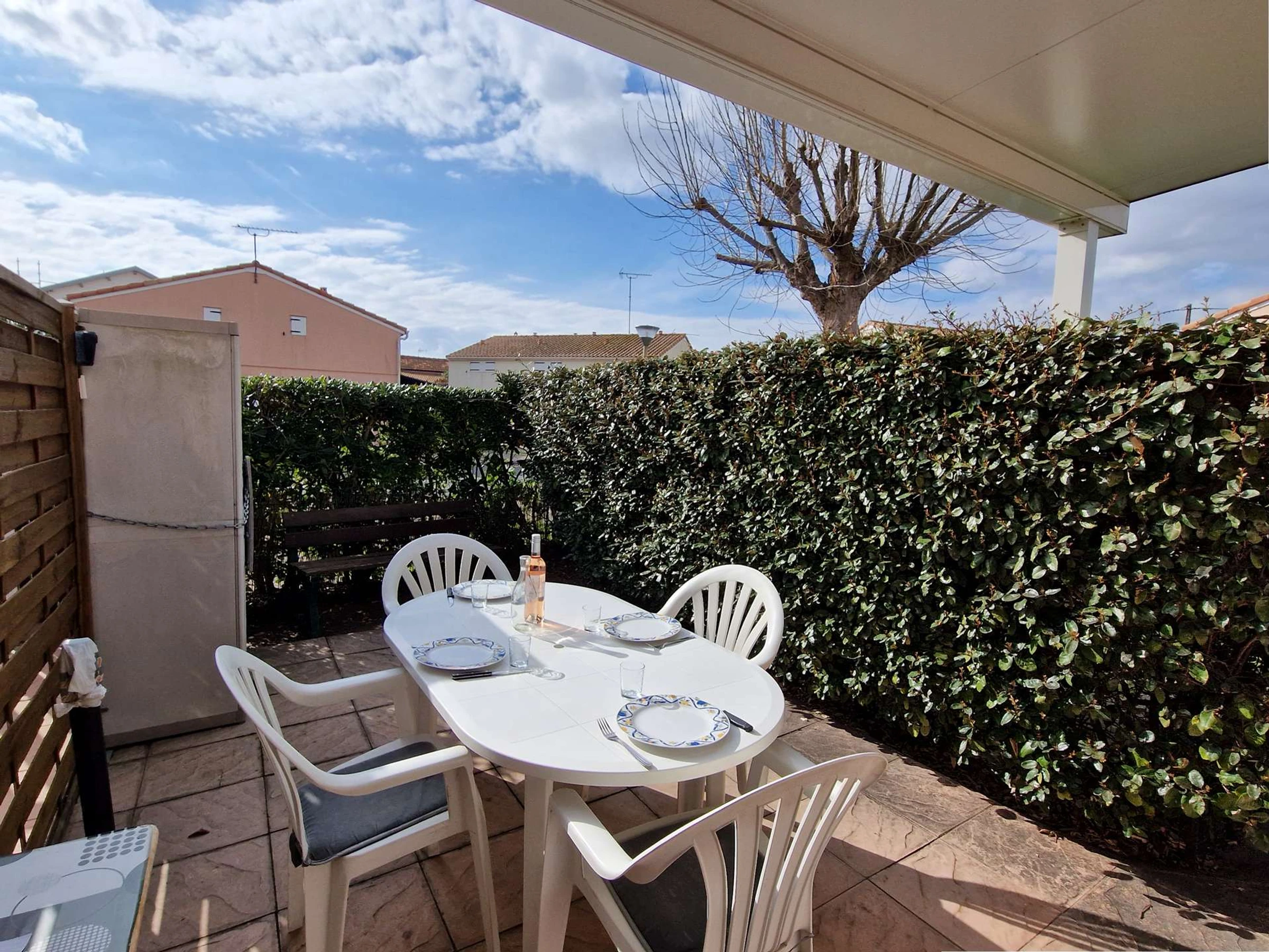 Terrasse privée : salon de jardin et 2 transats pour un moment de détente. Une place de parking privé dans la résidence sécurisée.