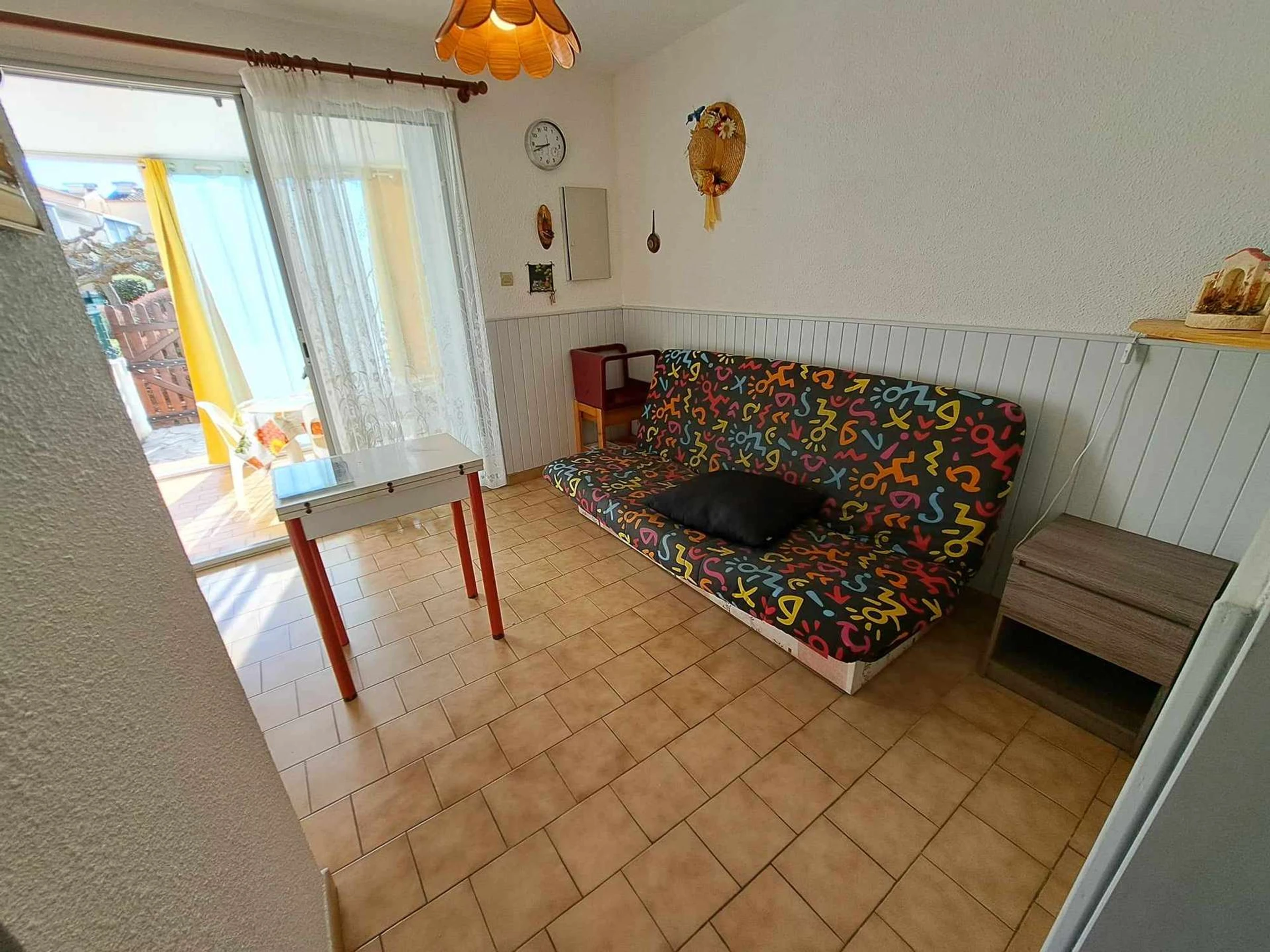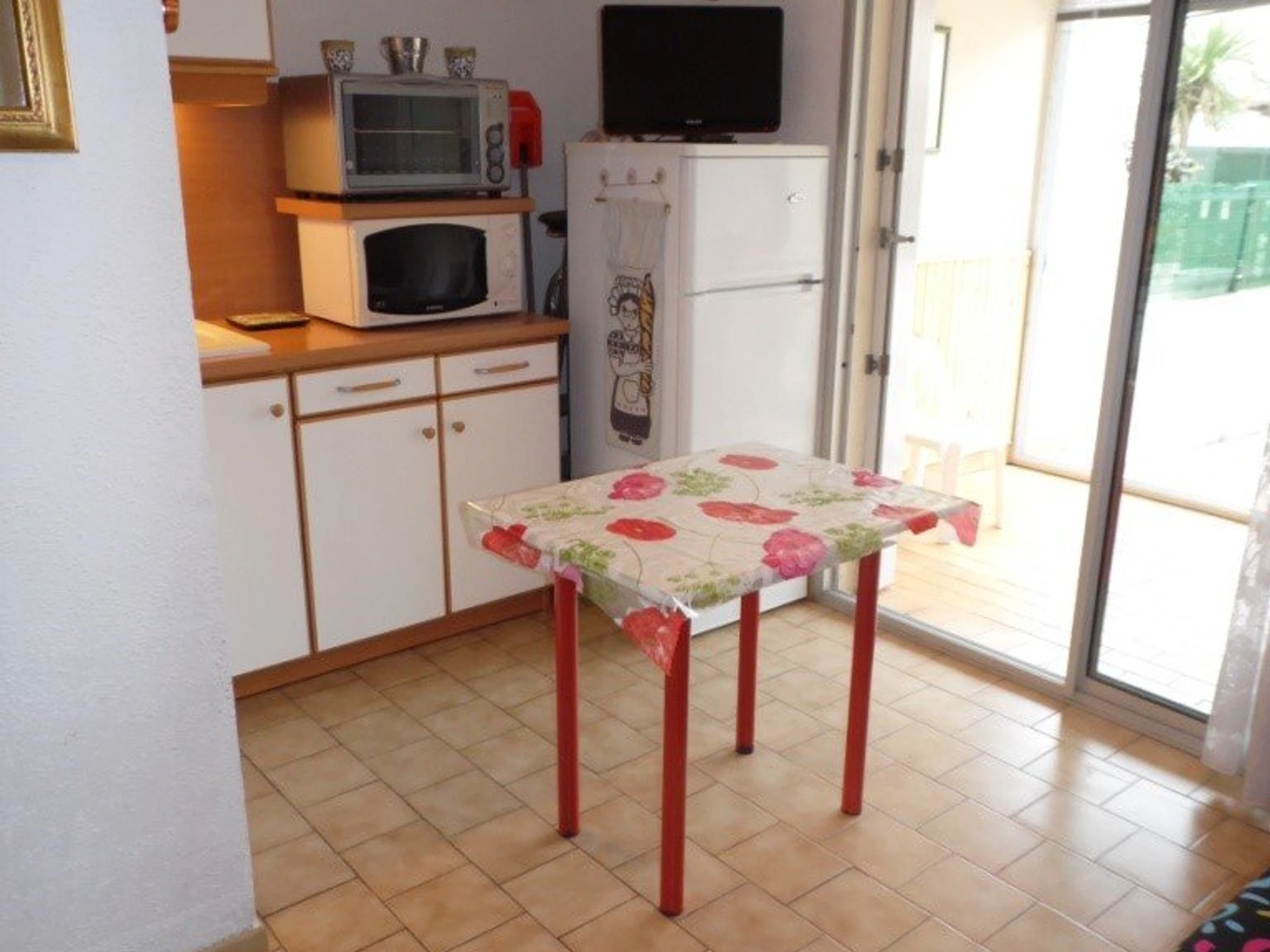 Séjour avec clic clac et TV écran plat, coin cuisine équipé avec 2 plaques électriques, hotte, four, micro ondes, réfrigérateur/congélateur.