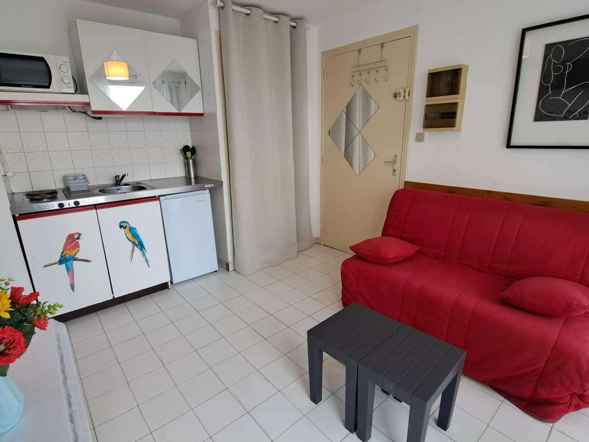 Séjour avec canapé BZ et TV écran plat avec lecteur DVD, coin cuisine équipé avec 2 plaques électriques, micro ondes, cafetière électrique, bouilloire électrique, grille pain et frigo top.