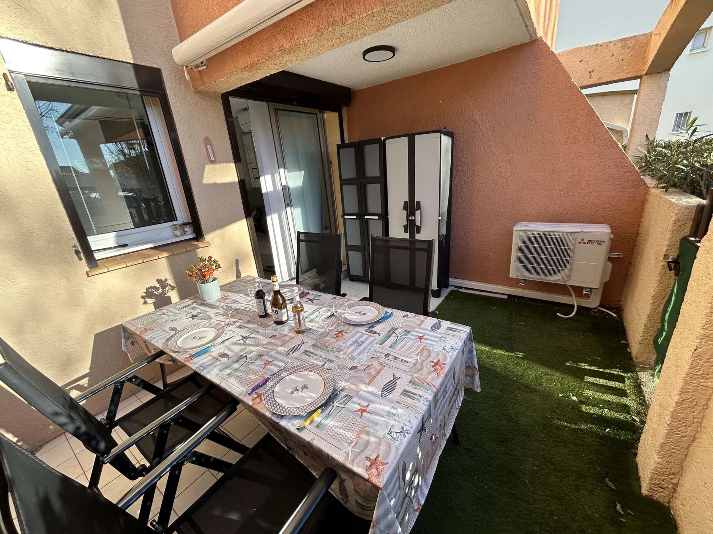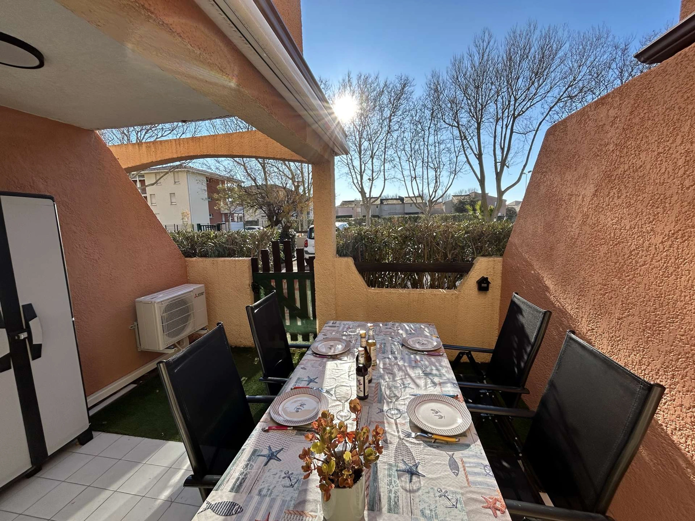 Profitez d'une terrasse privée avec salon de jardin et store pour vos repas en extérieur. Un parking privé est également inclus.