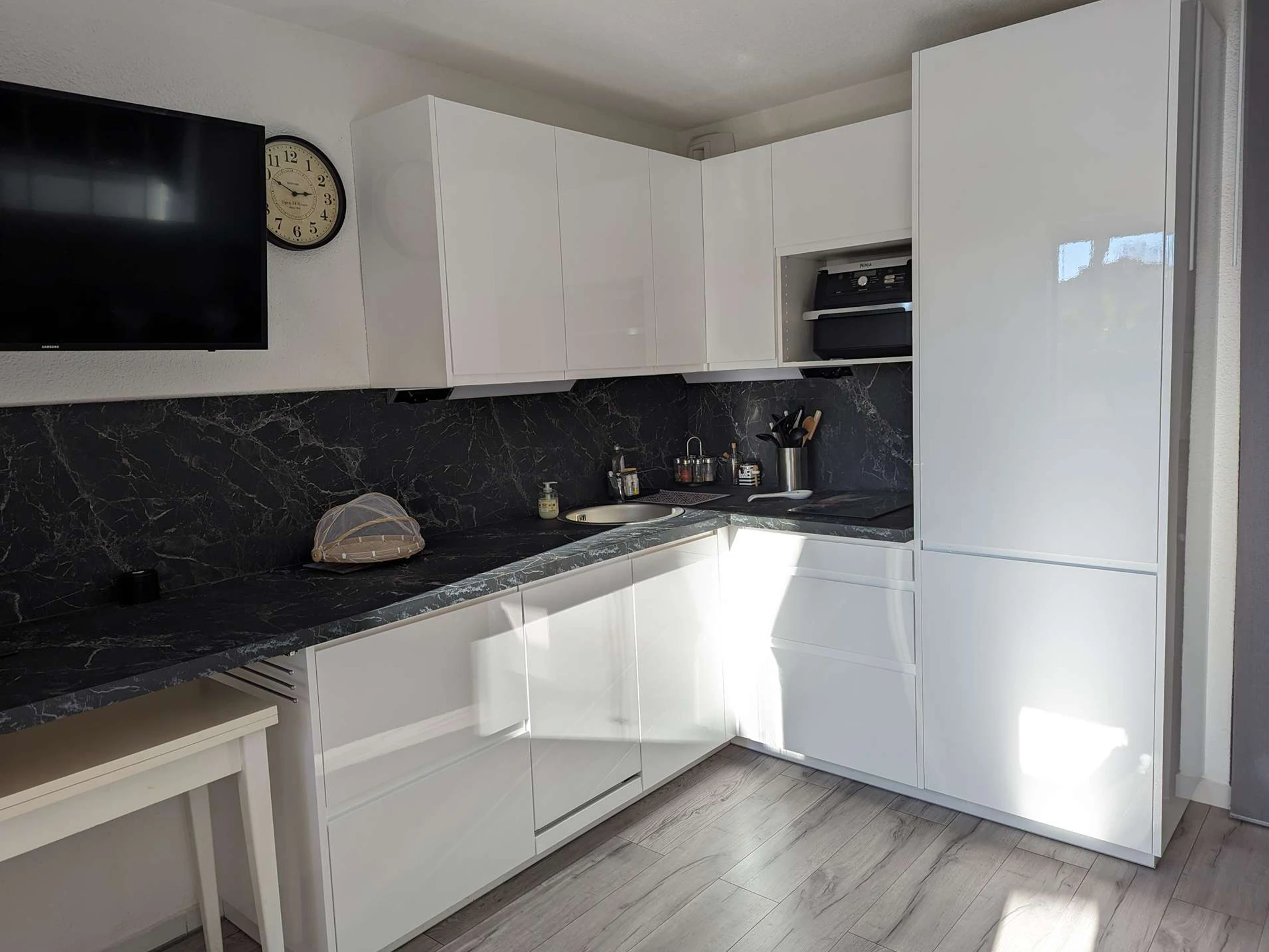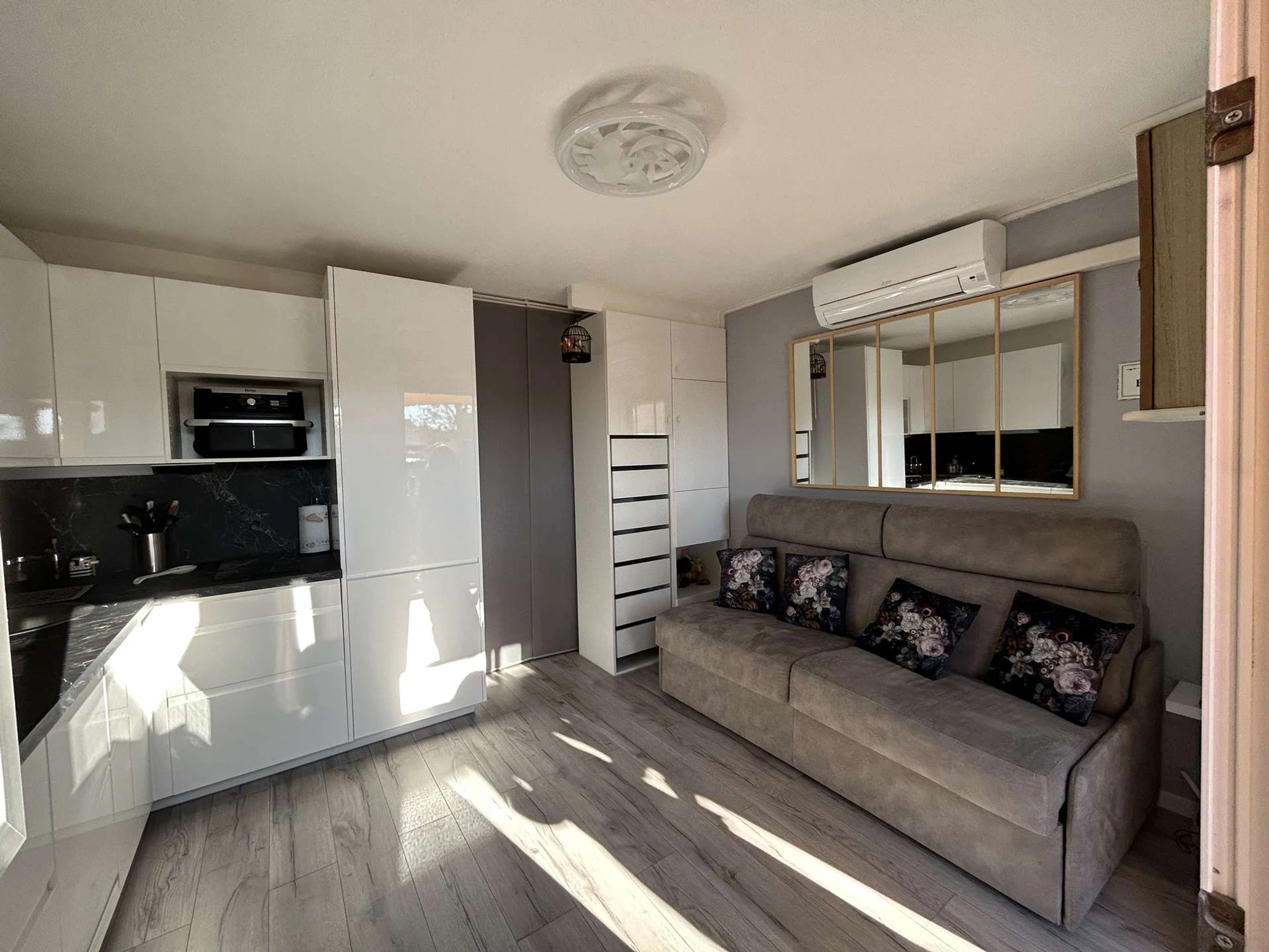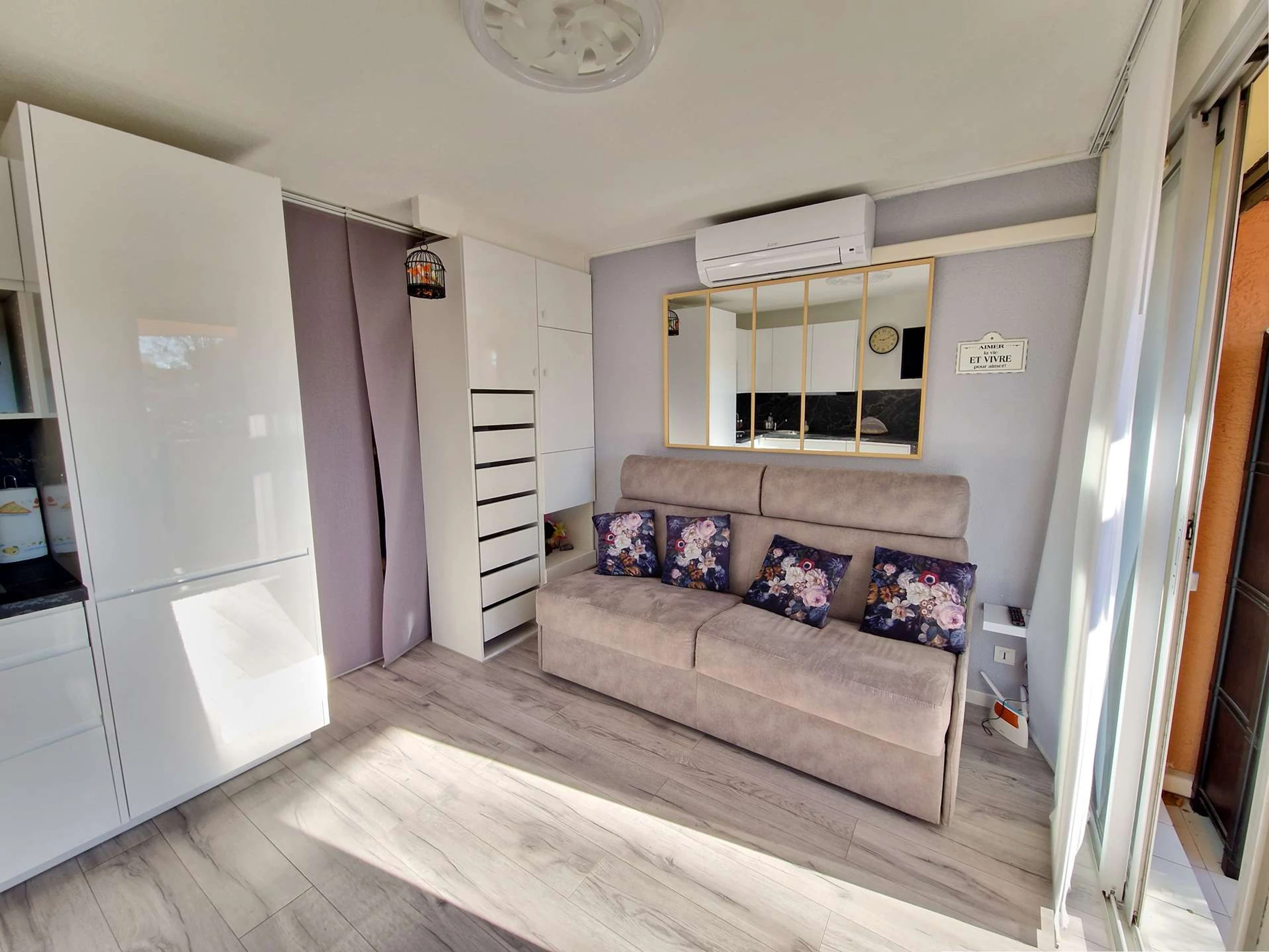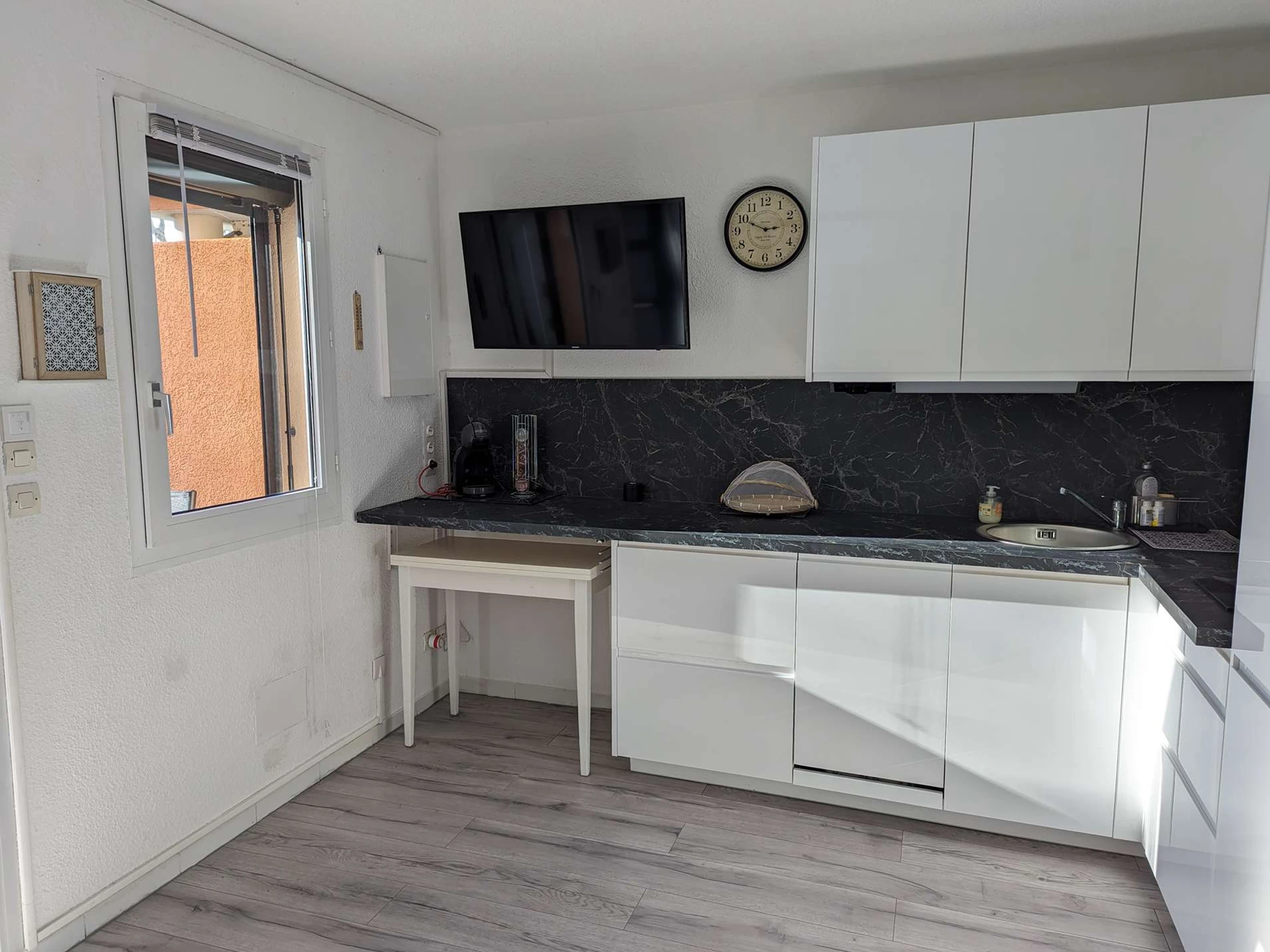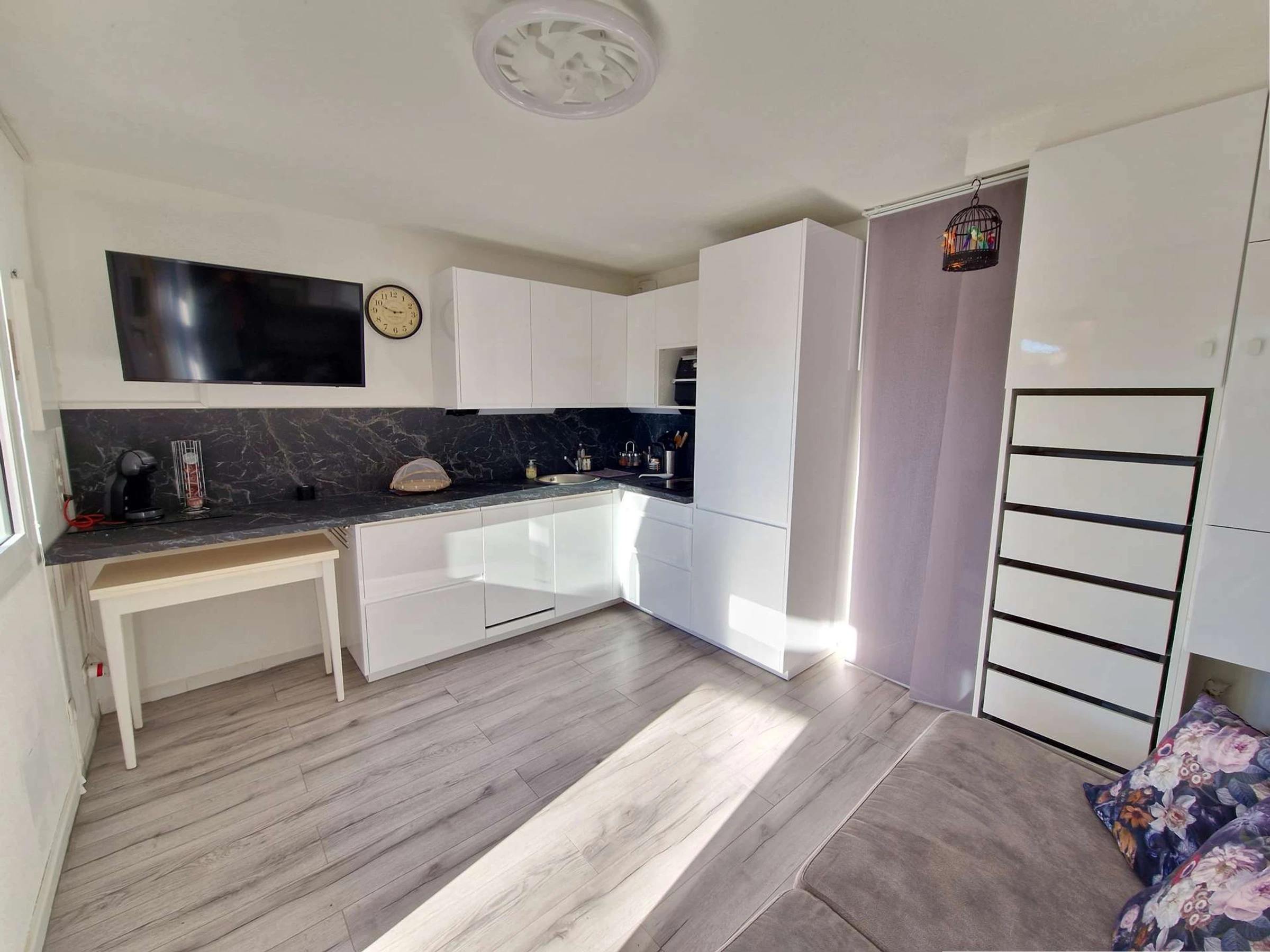 Le séjour lumineux dispose d'un canapé convertible BZ, de meubles fonctionnels, d'une télévision, ainsi que d'une table à manger avec chaises. L'appartement est climatisé pour votre confort. La cuisine est équipée avec micro-ondes, cafetière électrique, plaque vitrocéramique, réfrigérateur/congélateur, lave-linge et lave-vaisselle, offrant ainsi tout le nécessaire pour cuisiner en toute simplicité.