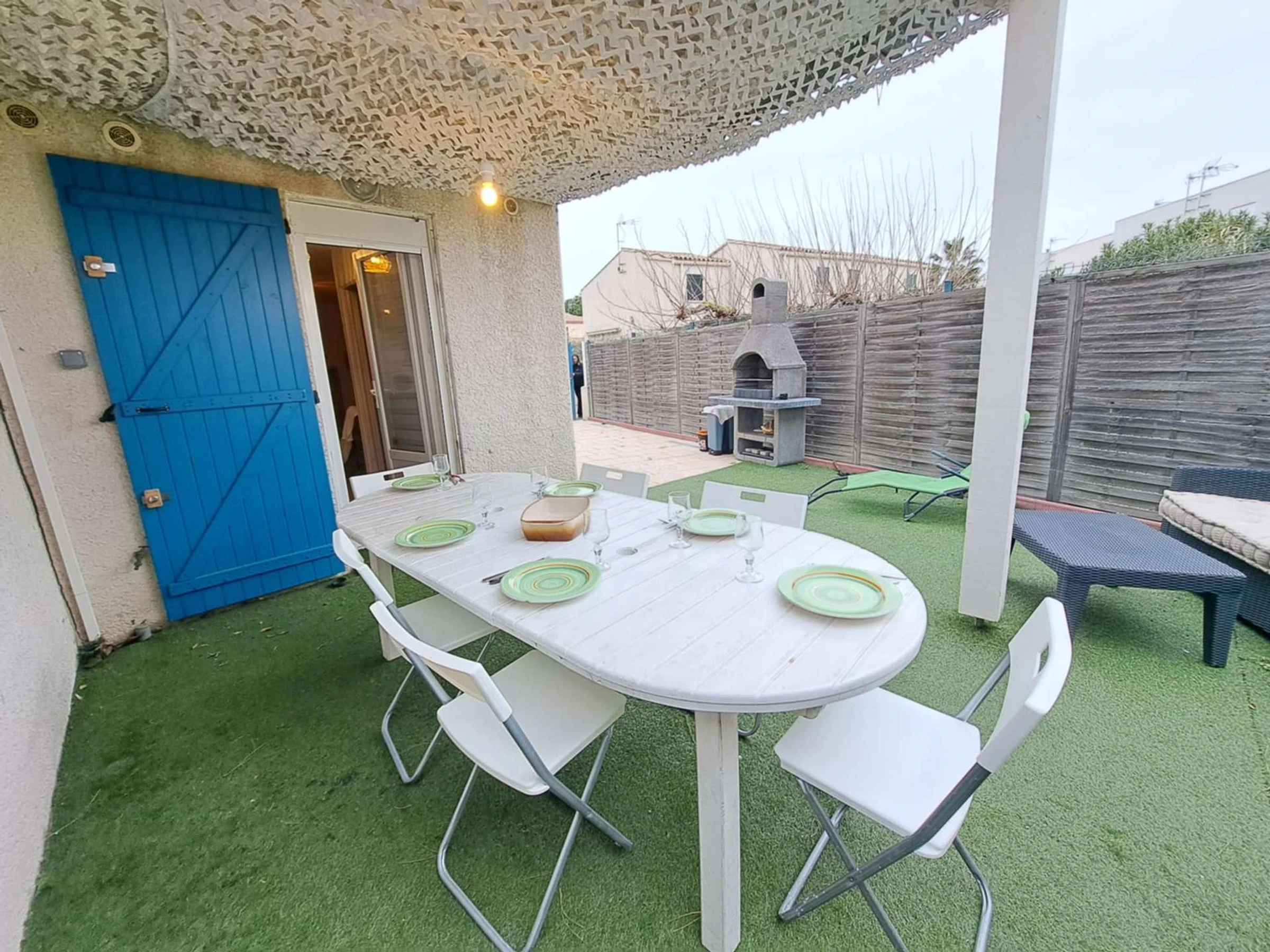 À l’extérieur, une grande terrasse avec pergola aménagée avec un salon de jardin et un barbecue fixe.