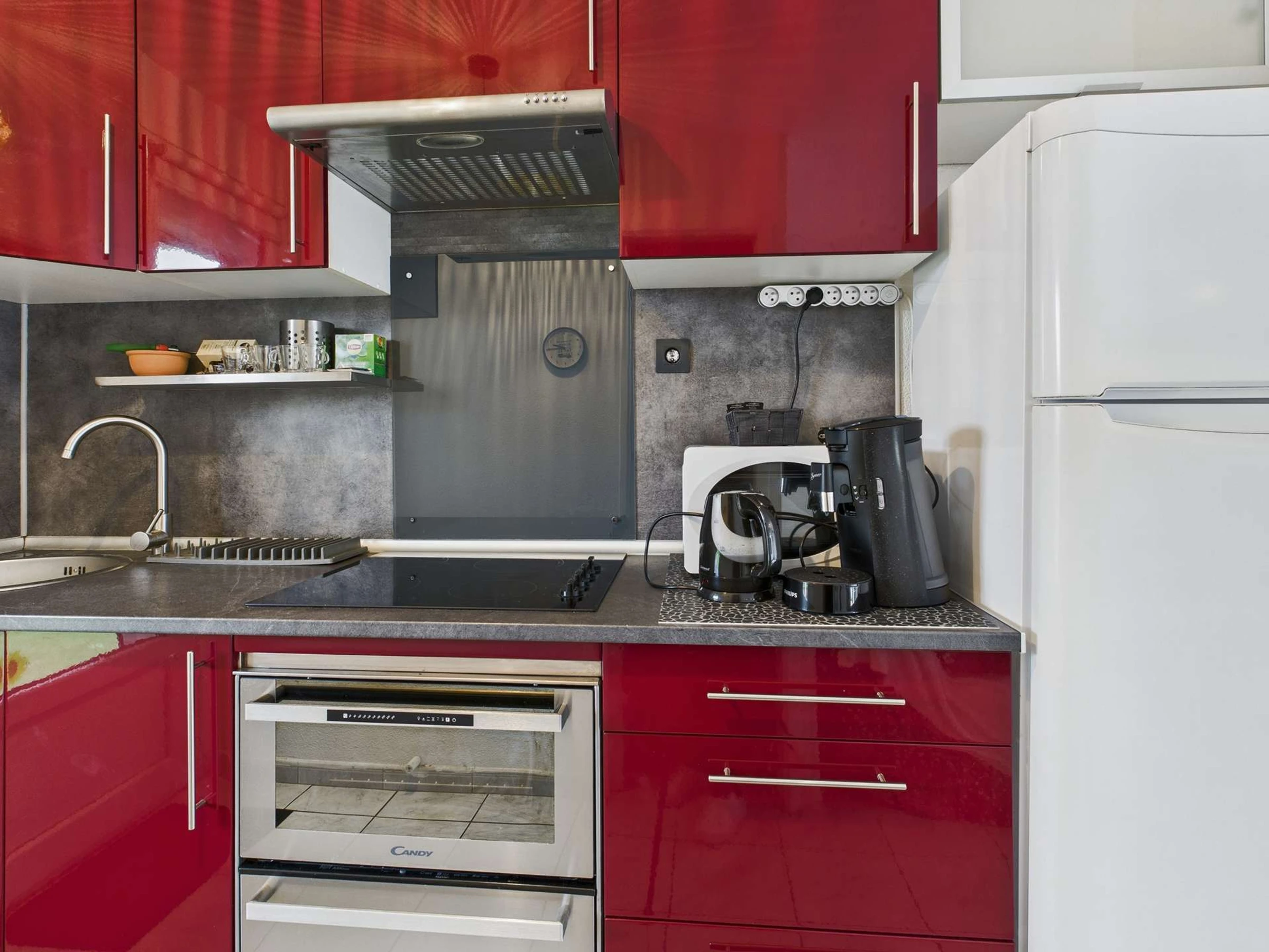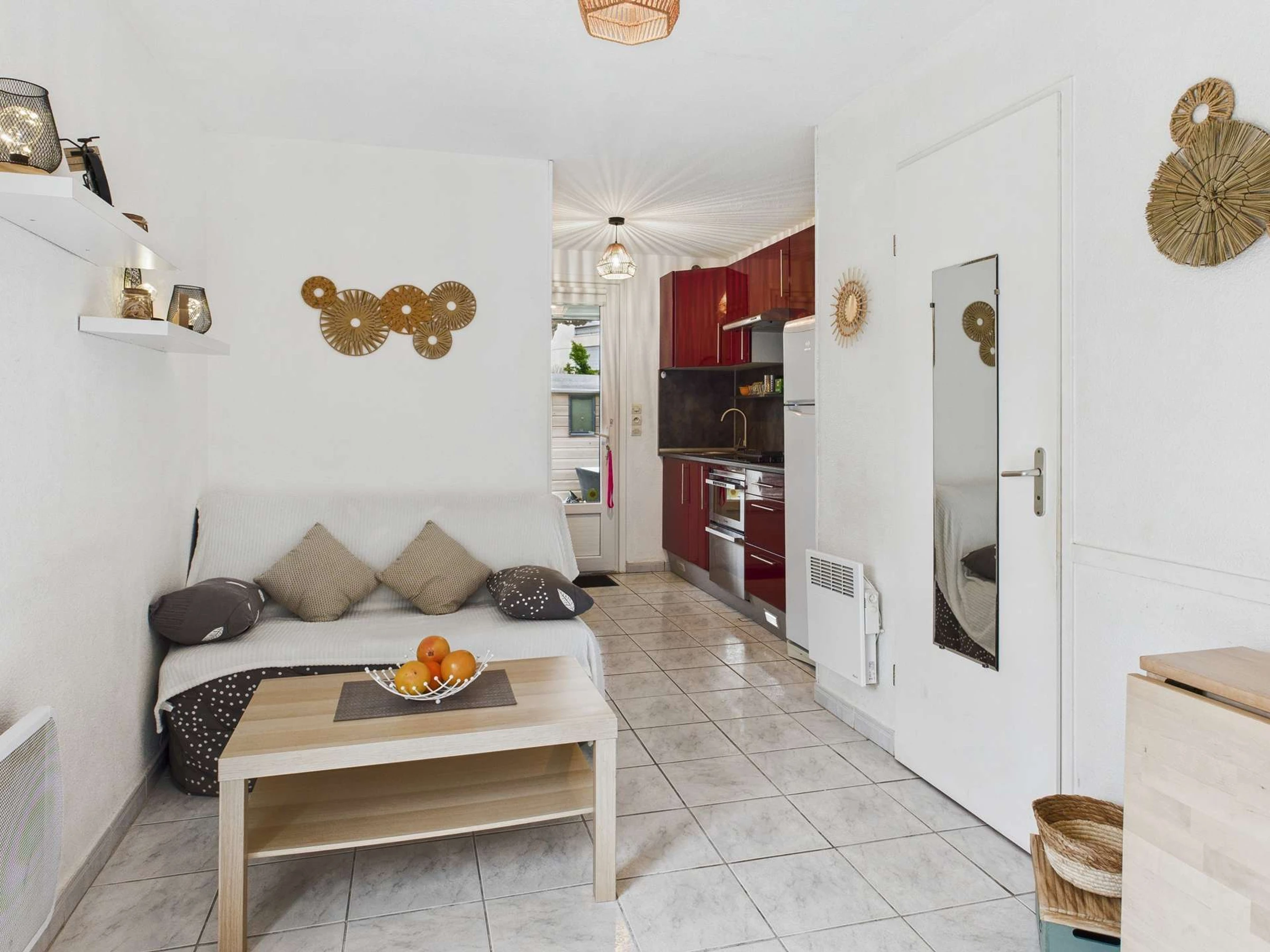 Au rez-de-chaussée, un séjour avec un canapé convertible et une télévision, ainsi qu'un coin cuisine fonctionnel comprenant un petit lave-vaisselle, un four, un micro-ondes, un réfrigérateur-congélateur, des plaques vitrocéramiques et une hotte aspirante. Ce niveau dispose également de toilettes indépendantes avec une machine à laver.