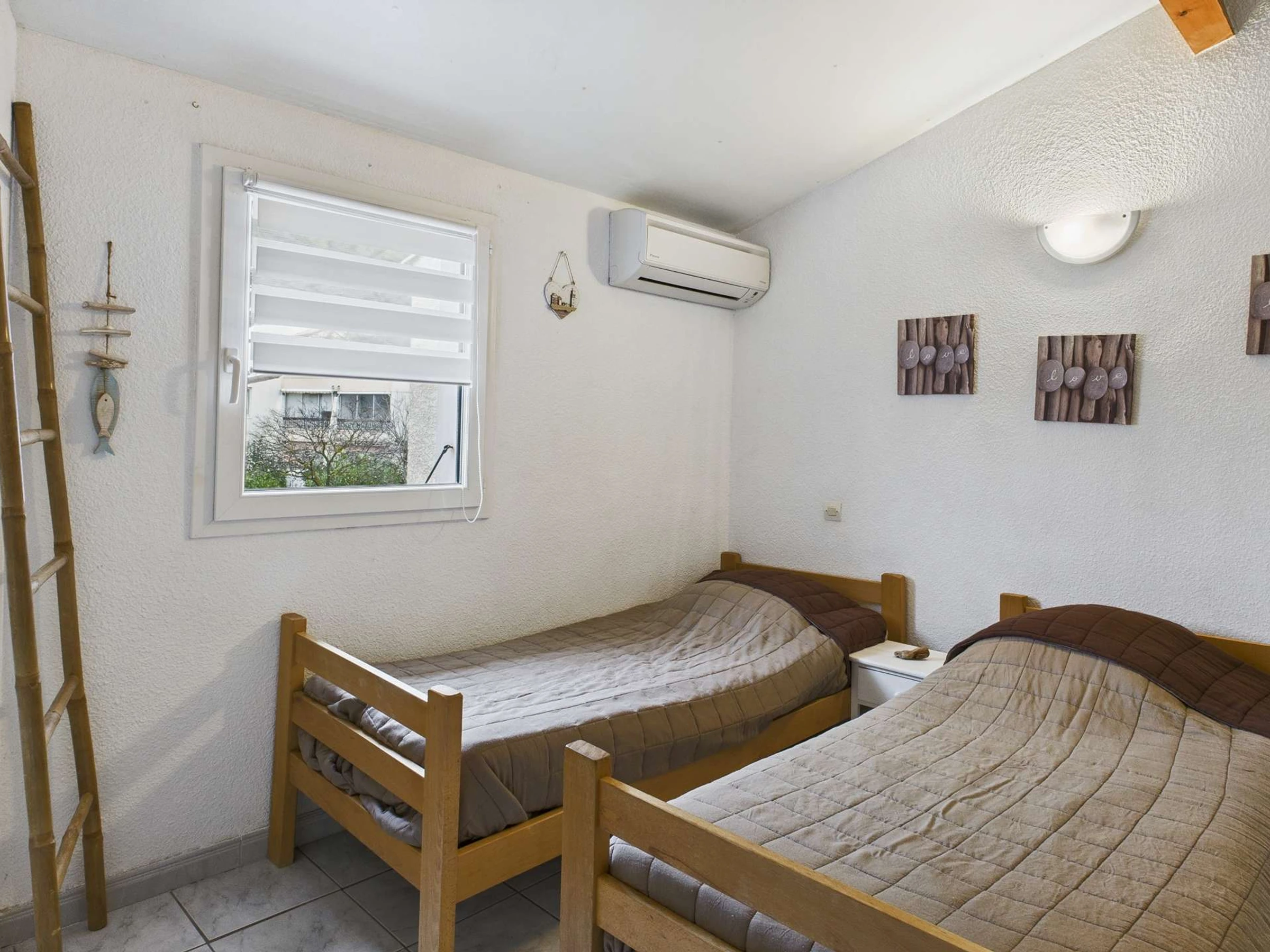À l’étage, vous trouverez deux chambres : une avec un lit double en 140 cm et l’autre équipée de deux lits simples en 90 cm. À noter, la climatisation est disponible uniquement à l’étage(OPTION 20€/SEMAINE).