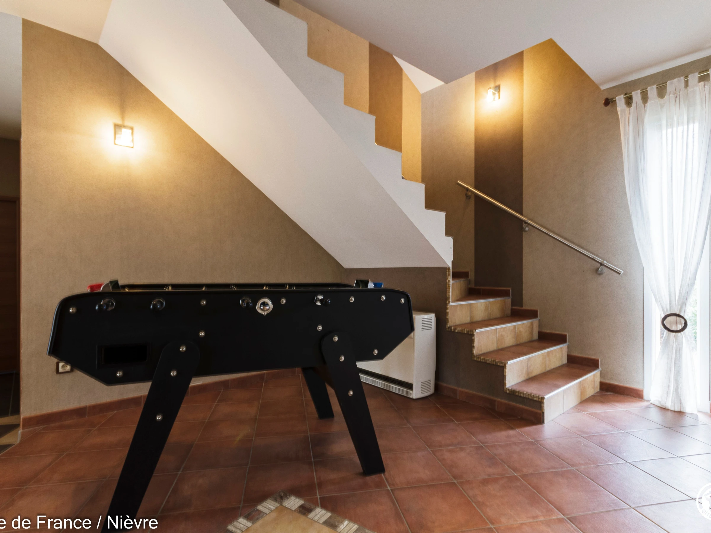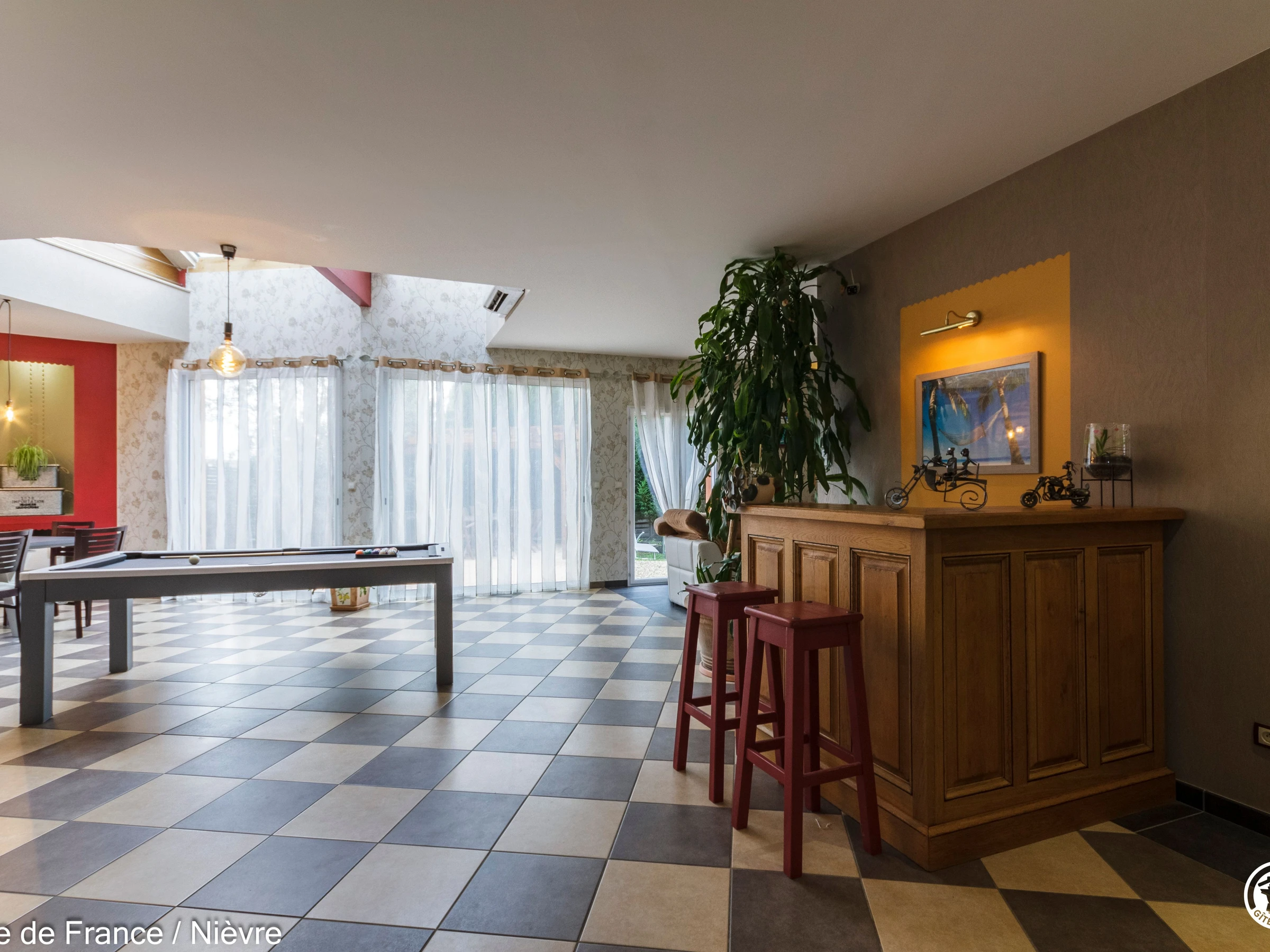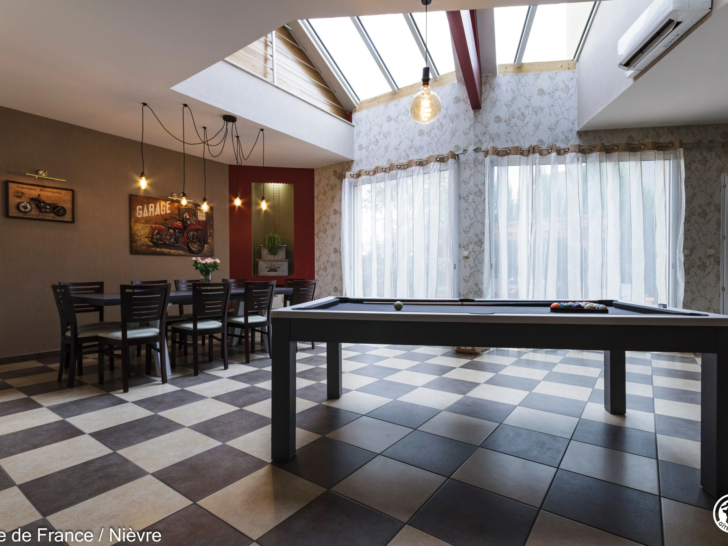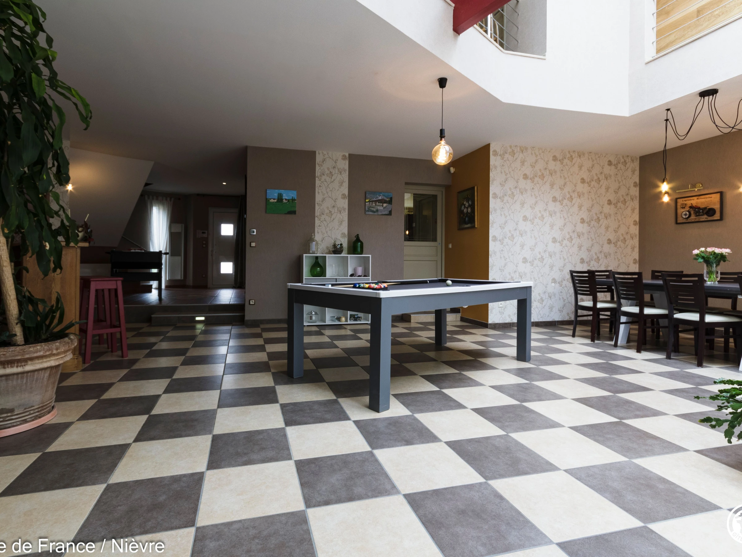 Maison d'architecte présentant de beaux volumes pour un séjour en famille ou entre amis tout confort, à moins de 10 mn de Nevers Jardin clos avec barbecue et salon de jardin, garage à disposition pour les motos. Hall d'entrée avec babyfoot, une grande pièce à vivre cathédrale avec espace salon (billard, bar, canapés, télé, wifi, chaîne hi-fi) et espace repas; une grande cuisine séparée aménagée et équipée. Une chambre en rez-de-chaussée avec 1 lit 160x200, télé, accès direct au jardin et dressing; 1 wc séparé, 1 salle d'eau avec douche de grande dimension. A l'étage une grande mezzanine; une chambre avec un lit 160x200; une salle de bain comprenant une baignoire et une douche, lave-linge et sèche-linge; un wc séparé; une chambre avec 1 lit 140x190 + 1 lit 90x190 et une chambre avec 1 lit 140x190 + 1 lit 90x190 (2 chambres sont climatisées à l'étage). Espace salle de jeux entre les 2 chambres.