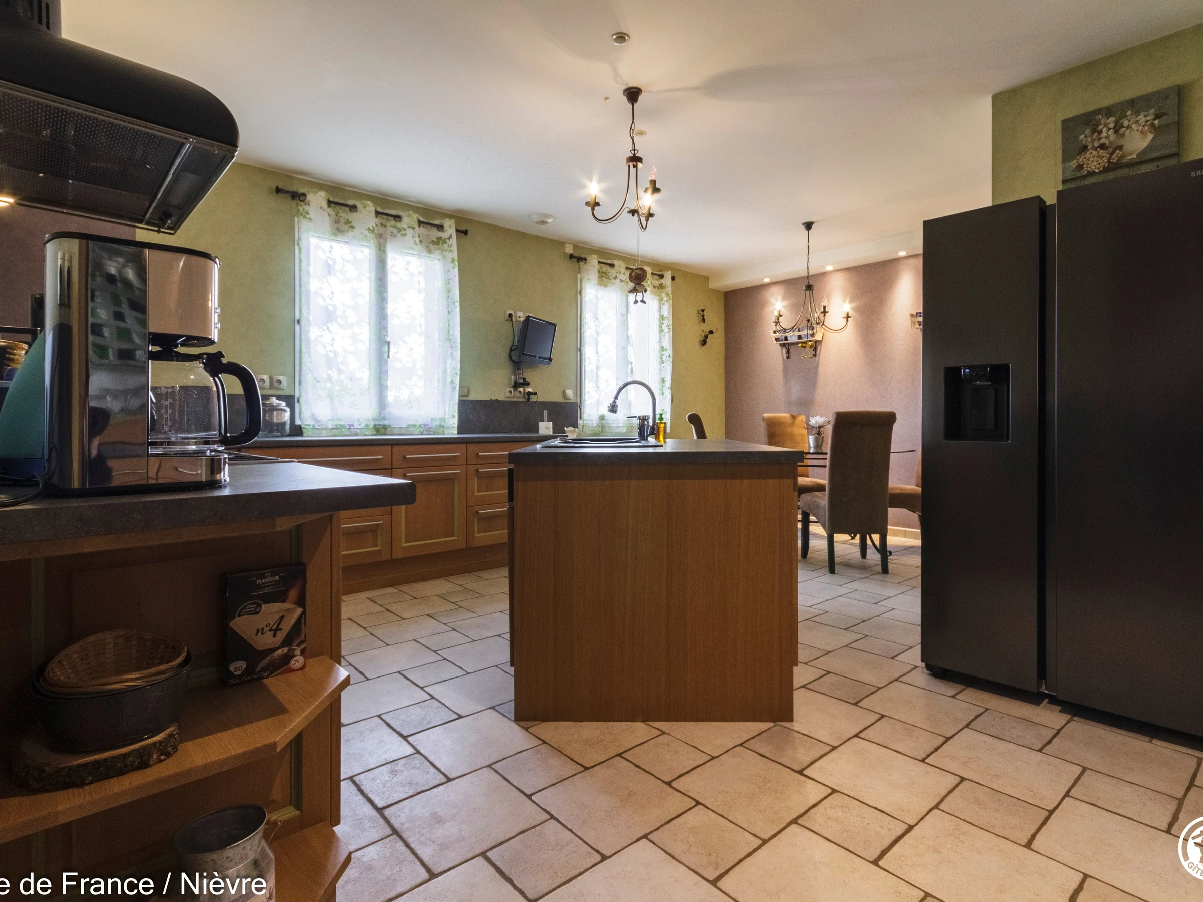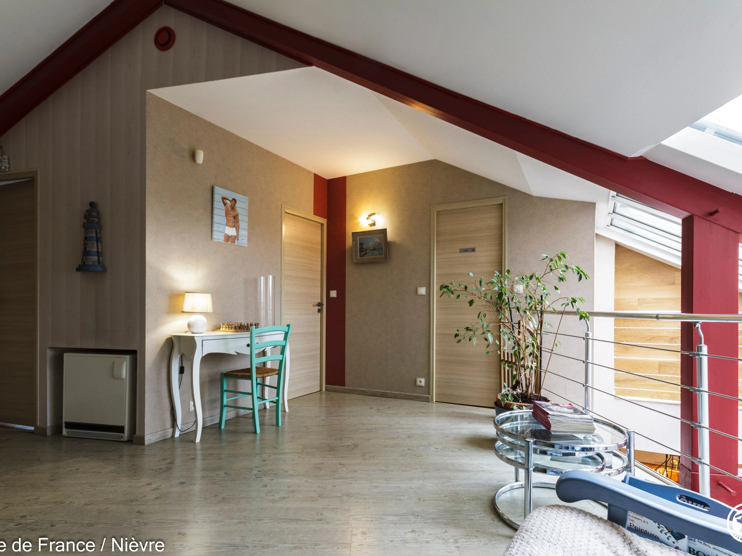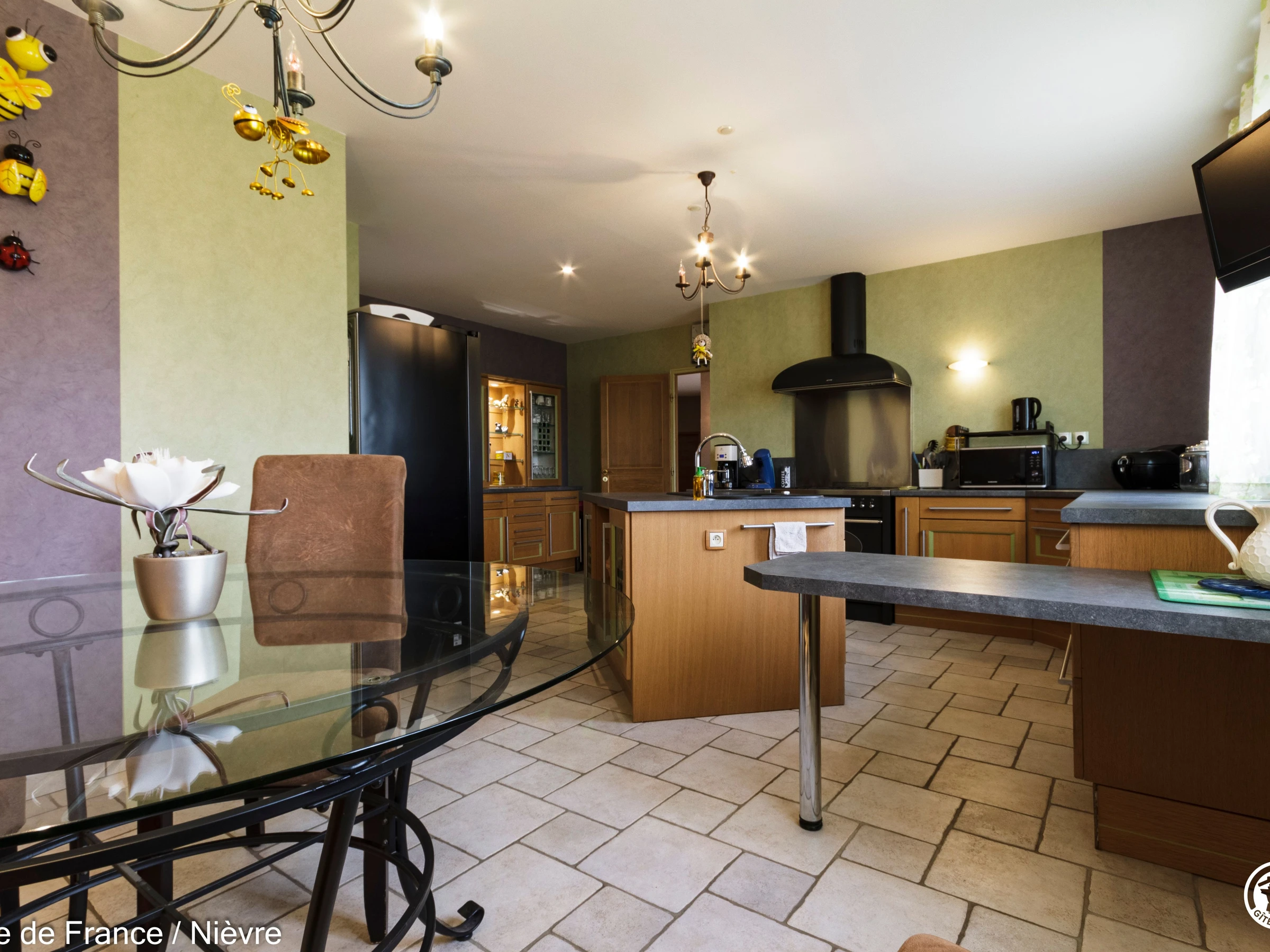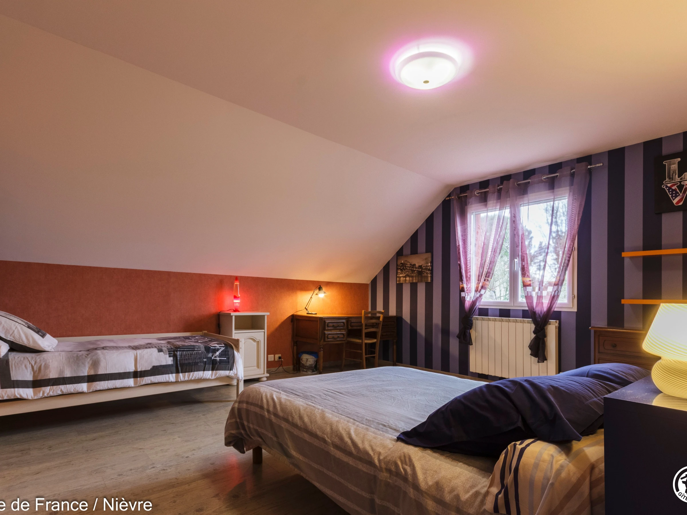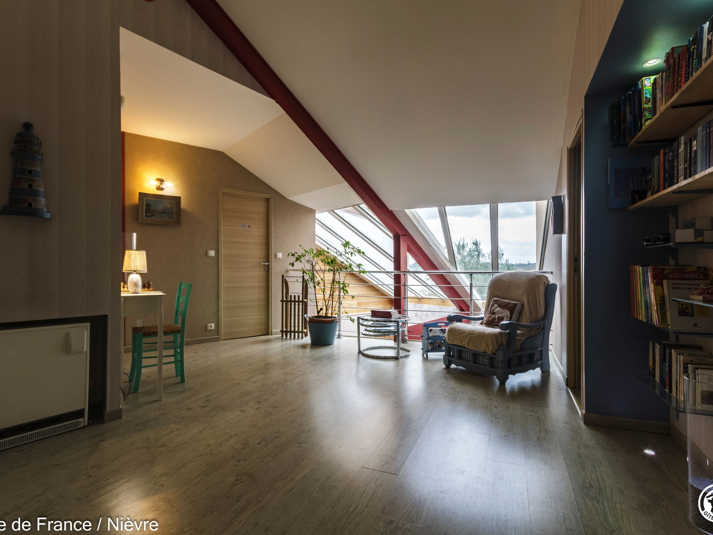 Maison d'architecte présentant de beaux volumes pour un séjour en famille ou entre amis tout confort, à moins de 10 mn de Nevers Jardin clos avec barbecue et salon de jardin, garage à disposition pour les motos. Hall d'entrée avec babyfoot, une grande pièce à vivre cathédrale avec espace salon (billard, bar, canapés, télé, wifi, chaîne hi-fi) et espace repas; une grande cuisine séparée aménagée et équipée. Une chambre en rez-de-chaussée avec 1 lit 160x200, télé, accès direct au jardin et dressing; 1 wc séparé, 1 salle d'eau avec douche de grande dimension. A l'étage une grande mezzanine; une chambre avec un lit 160x200; une salle de bain comprenant une baignoire et une douche, lave-linge et sèche-linge; un wc séparé; une chambre avec 1 lit 140x190 + 1 lit 90x190 et une chambre avec 1 lit 140x190 + 1 lit 90x190 (2 chambres sont climatisées à l'étage). Espace salle de jeux entre les 2 chambres.