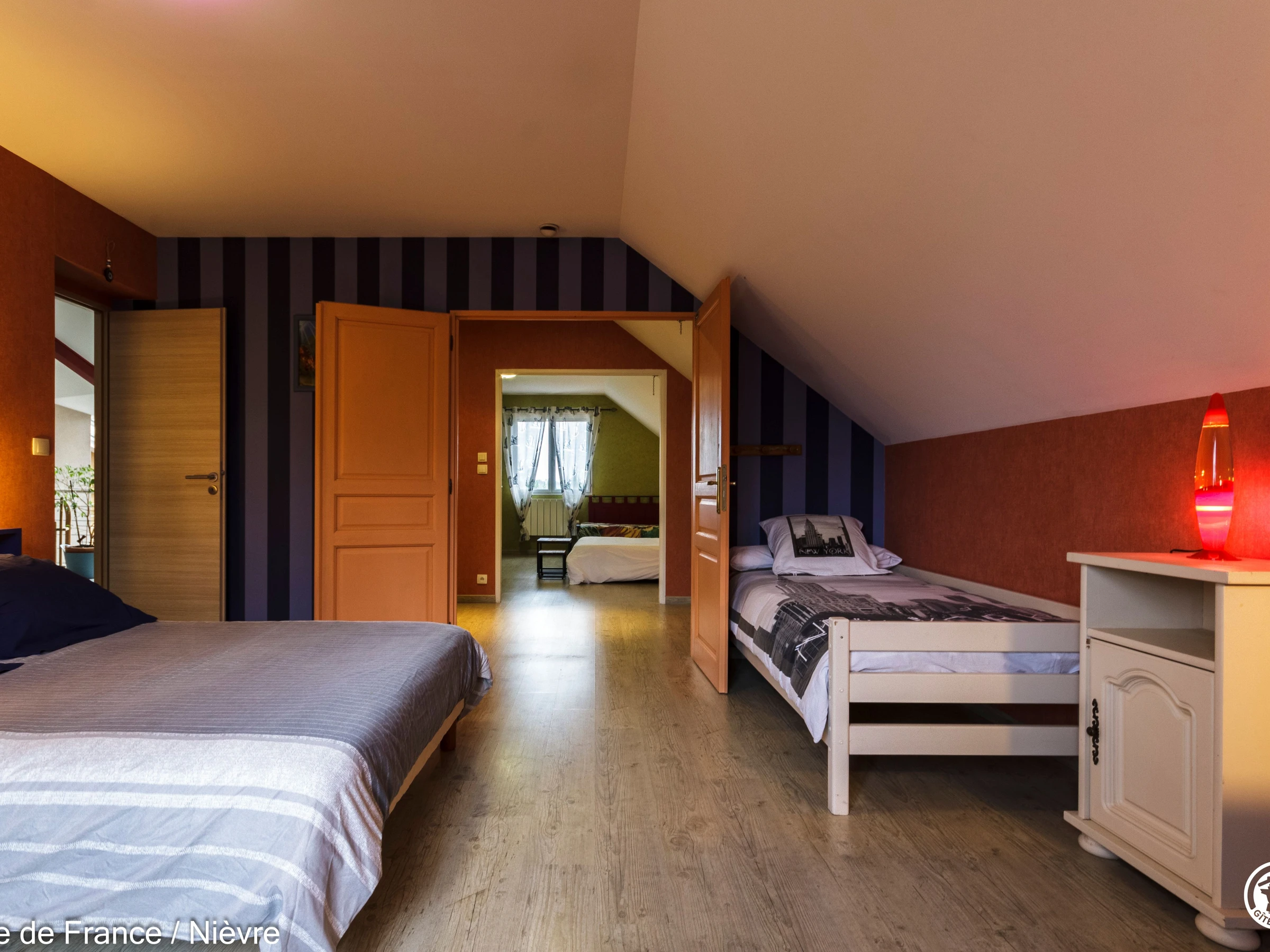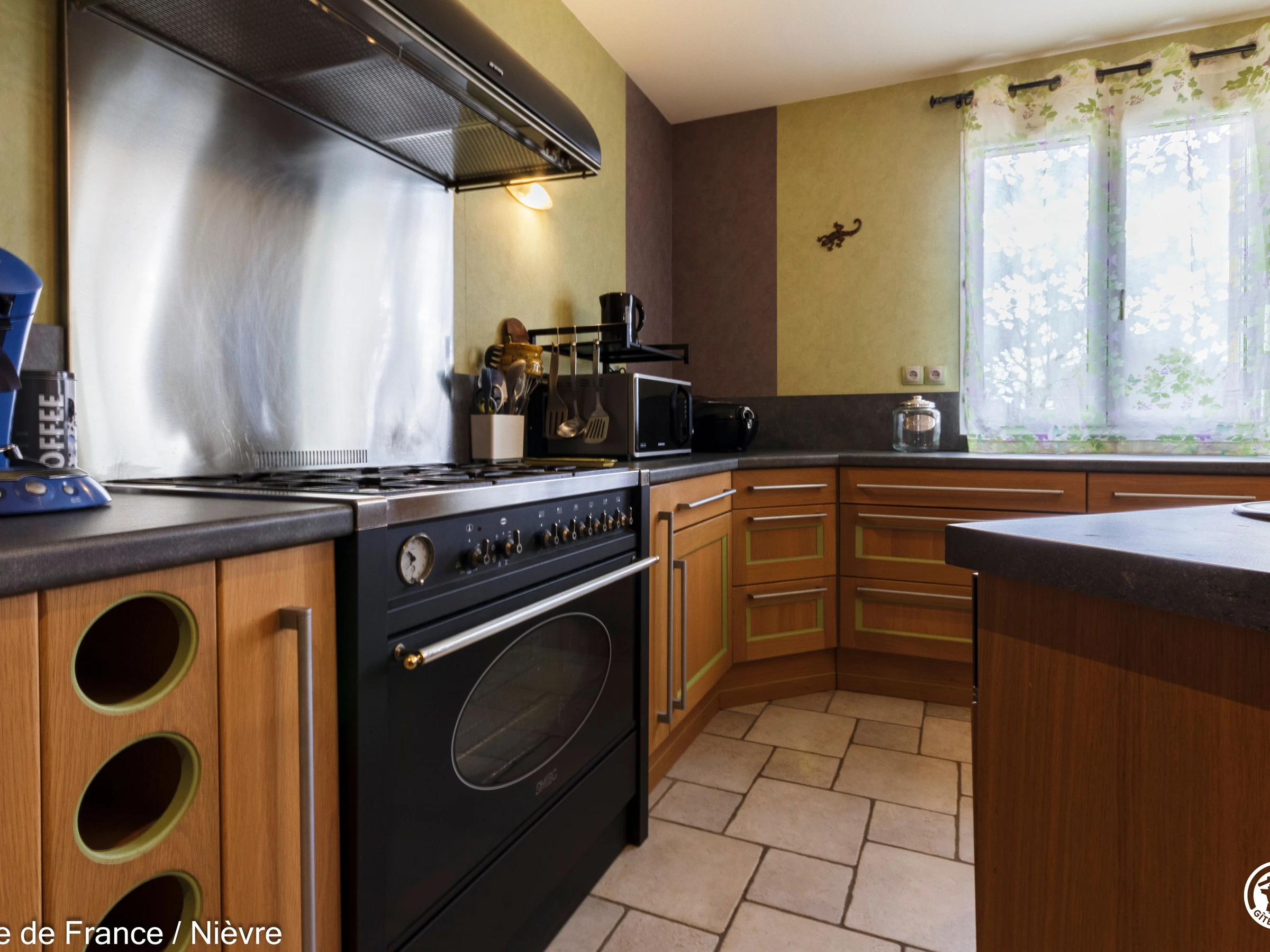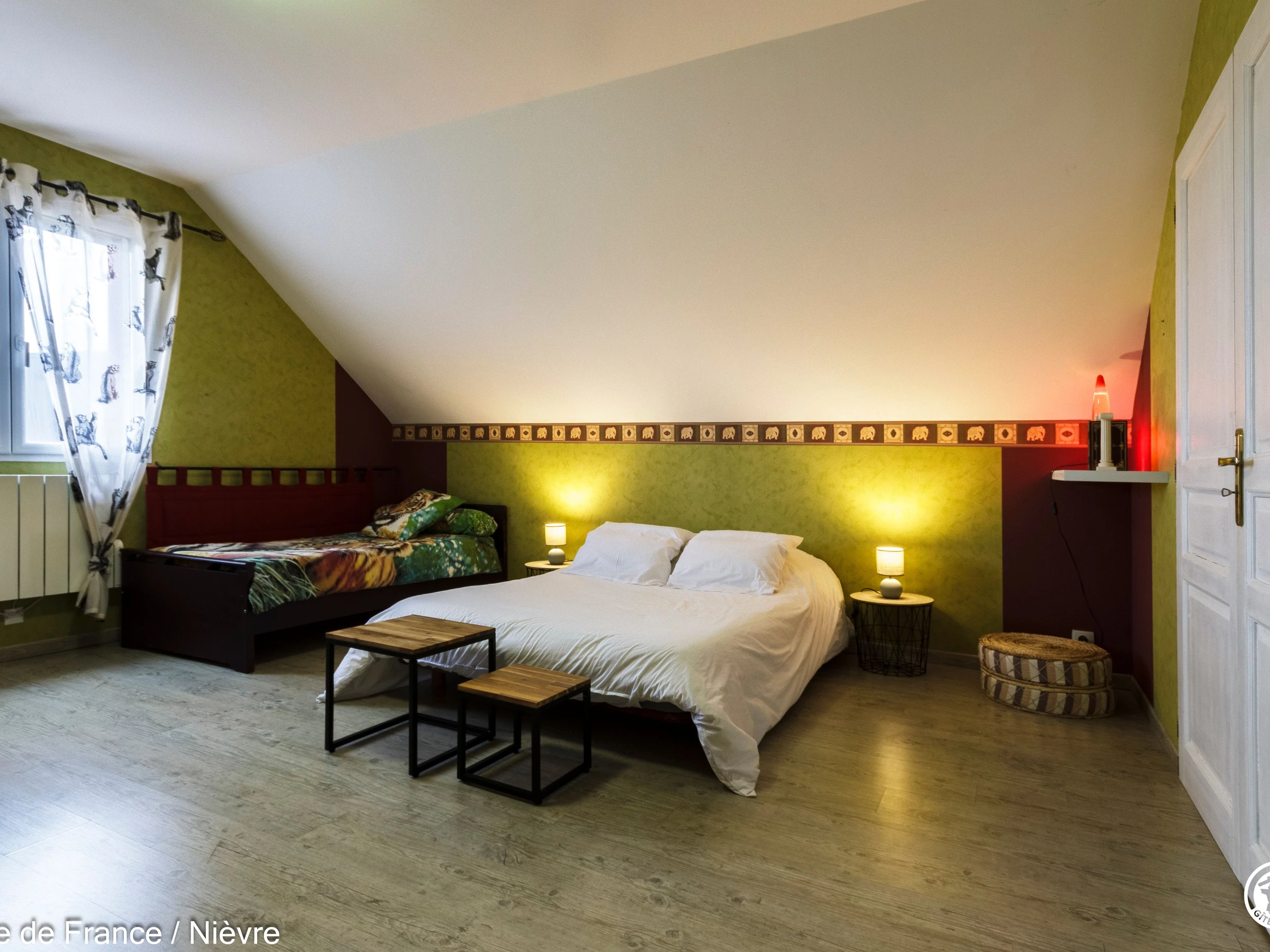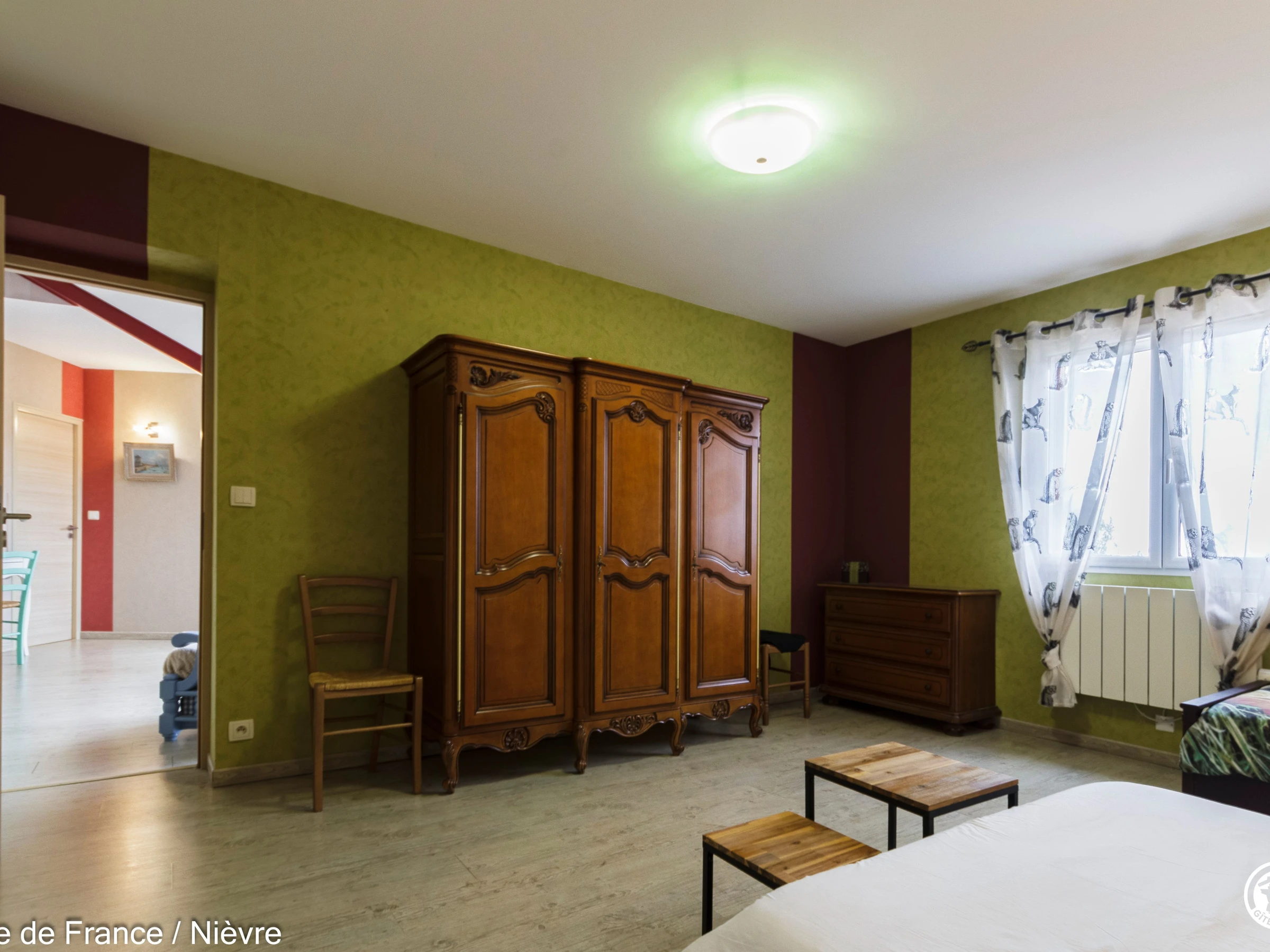 Maison d'architecte présentant de beaux volumes pour un séjour en famille ou entre amis tout confort, à moins de 10 mn de Nevers Jardin clos avec barbecue et salon de jardin, garage à disposition pour les motos. Hall d'entrée avec babyfoot, une grande pièce à vivre cathédrale avec espace salon (billard, bar, canapés, télé, wifi, chaîne hi-fi) et espace repas; une grande cuisine séparée aménagée et équipée. Une chambre en rez-de-chaussée avec 1 lit 160x200, télé, accès direct au jardin et dressing; 1 wc séparé, 1 salle d'eau avec douche de grande dimension. A l'étage une grande mezzanine; une chambre avec un lit 160x200; une salle de bain comprenant une baignoire et une douche, lave-linge et sèche-linge; un wc séparé; une chambre avec 1 lit 140x190 + 1 lit 90x190 et une chambre avec 1 lit 140x190 + 1 lit 90x190 (2 chambres sont climatisées à l'étage). Espace salle de jeux entre les 2 chambres.