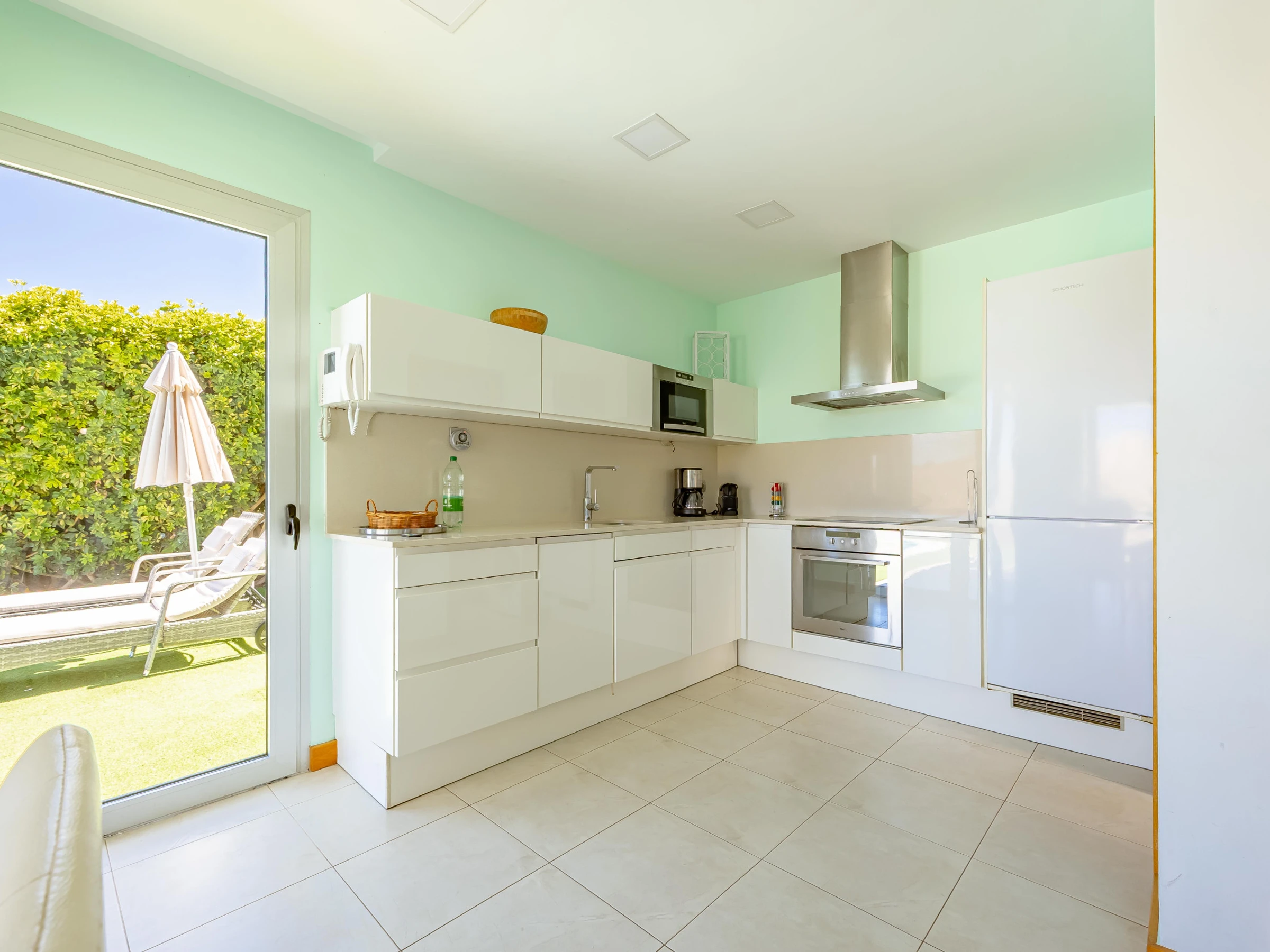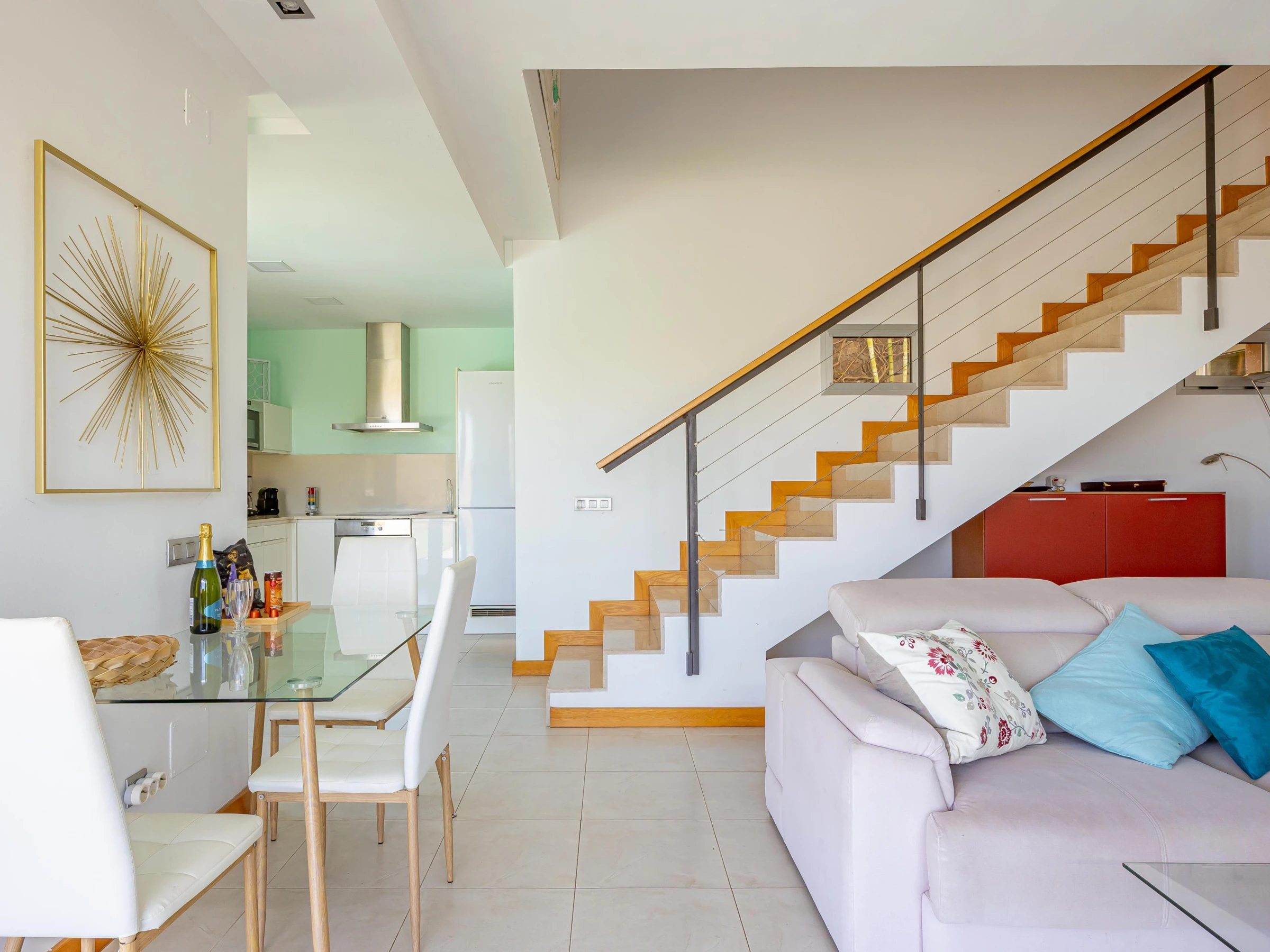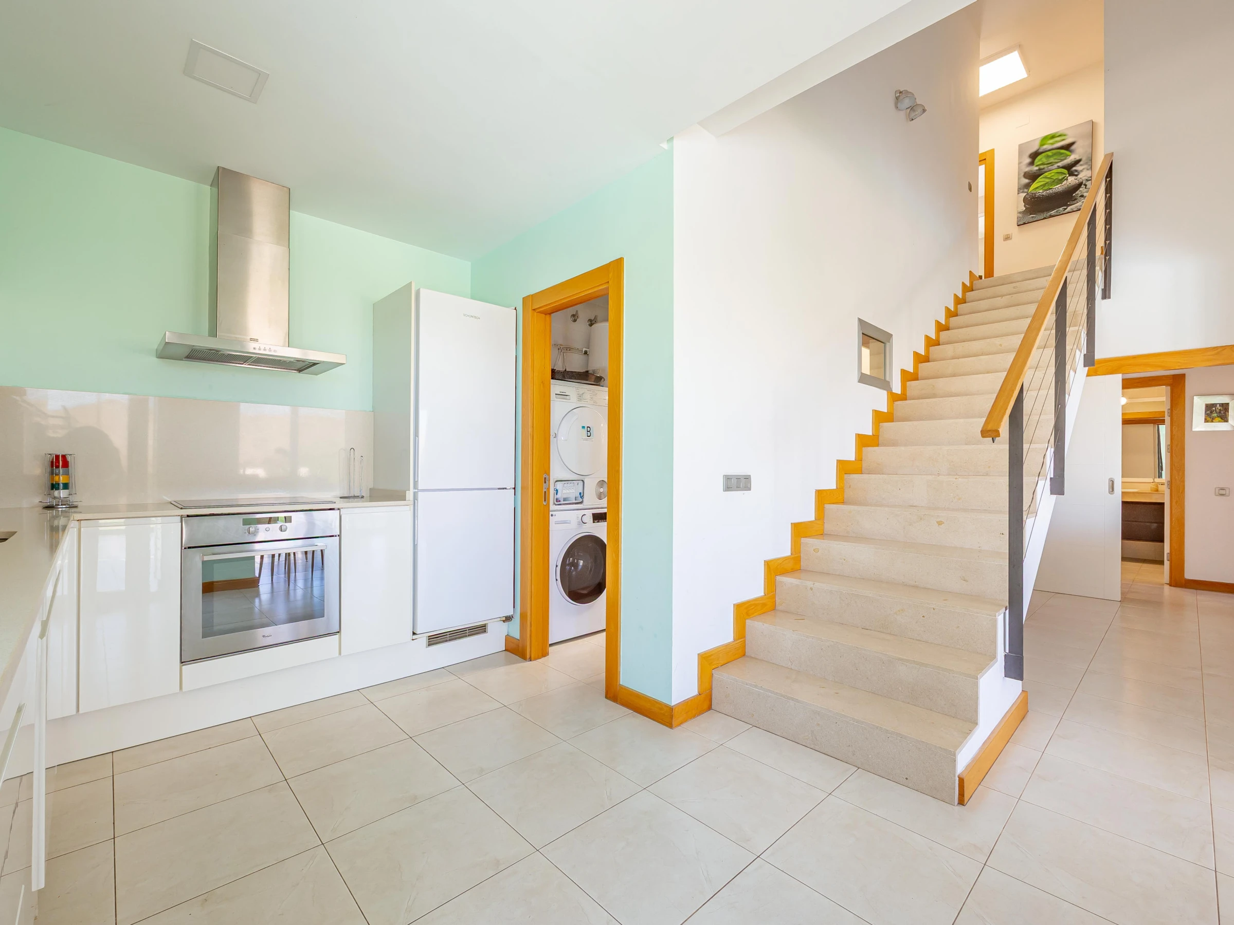 L'appartement dispose d'un salon-salle à manger confortable adjacent à la cuisine américaine, entièrement équipée d'appareils électroménagers de dernière génération, y compris four, micro-ondes, lave-vaisselle et lave-linge/sèche-linge.