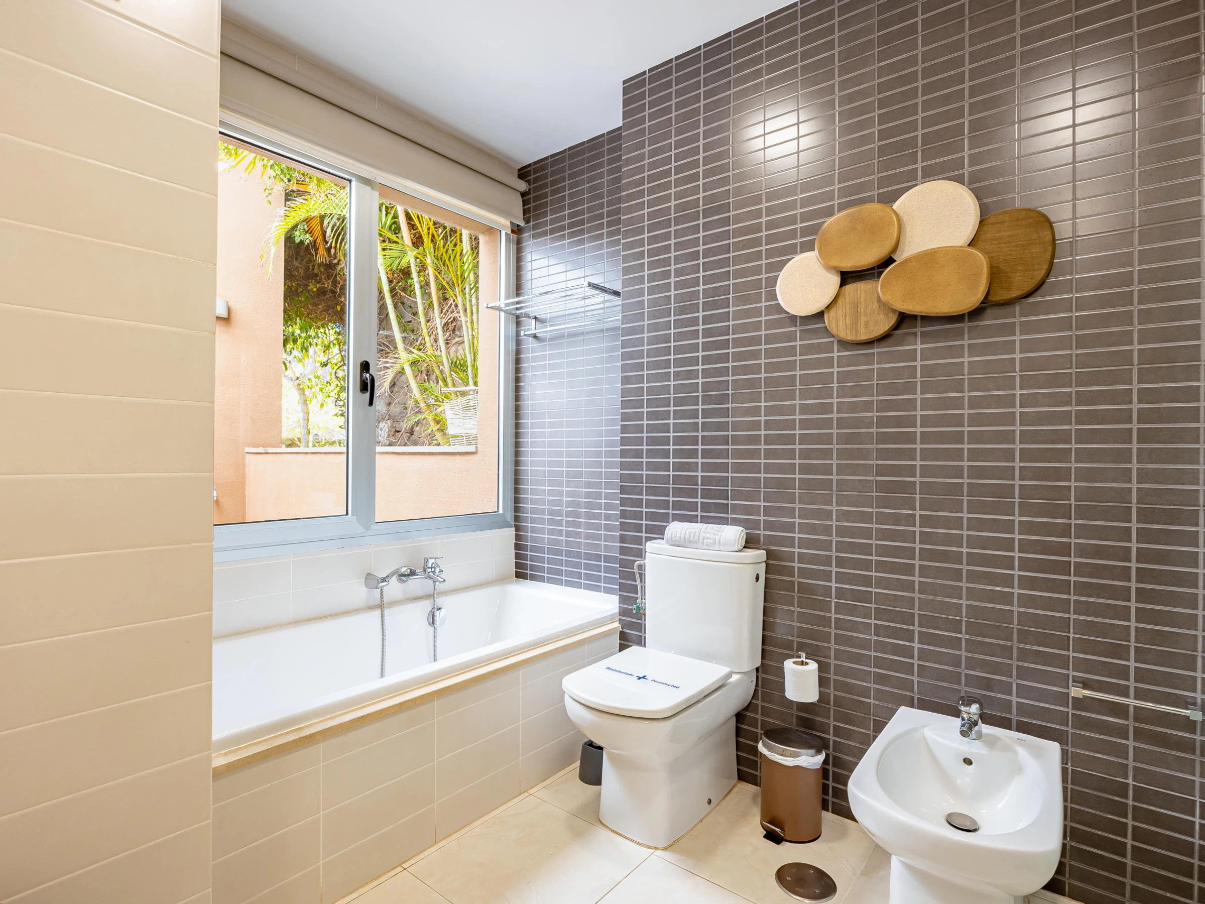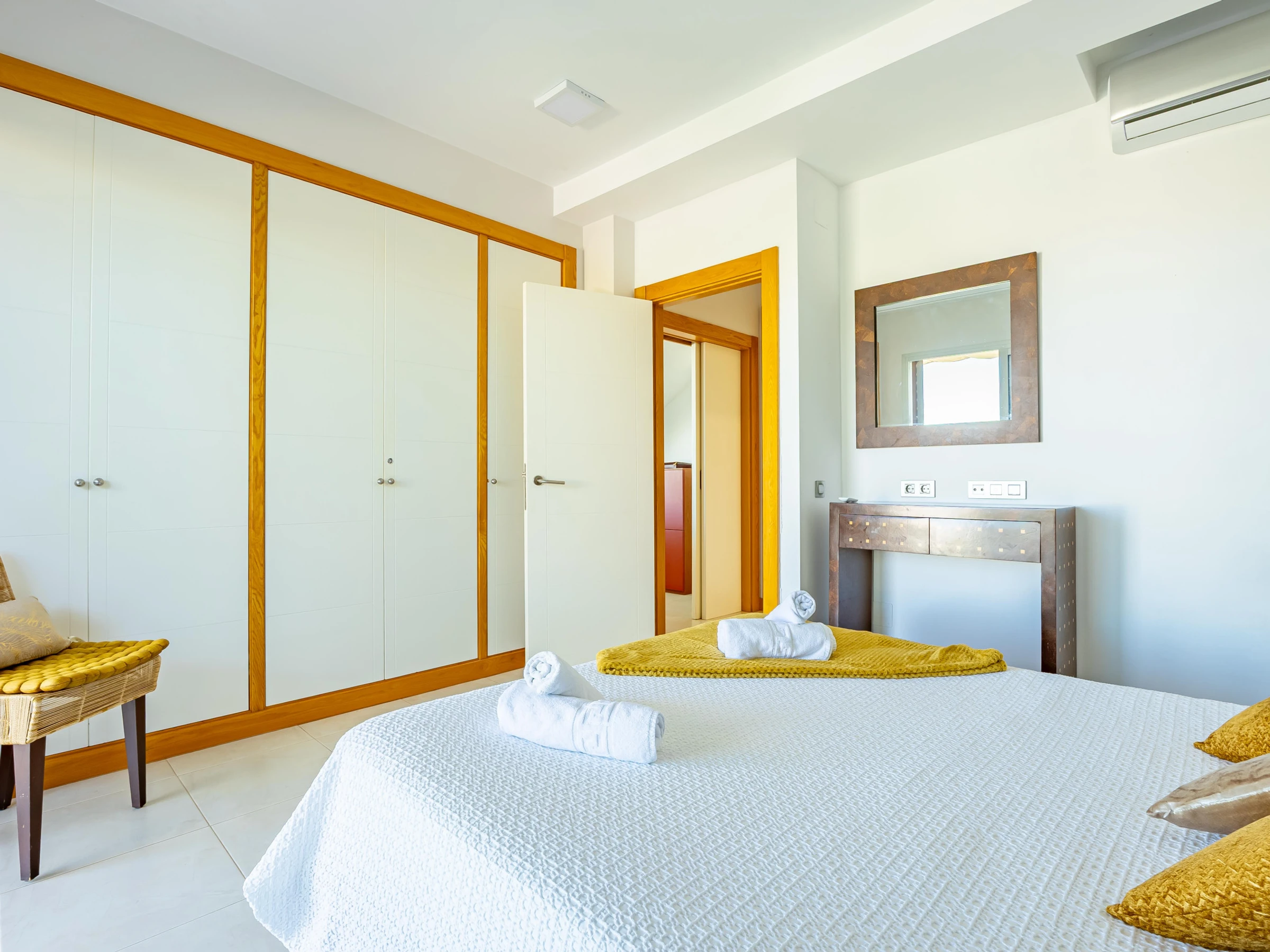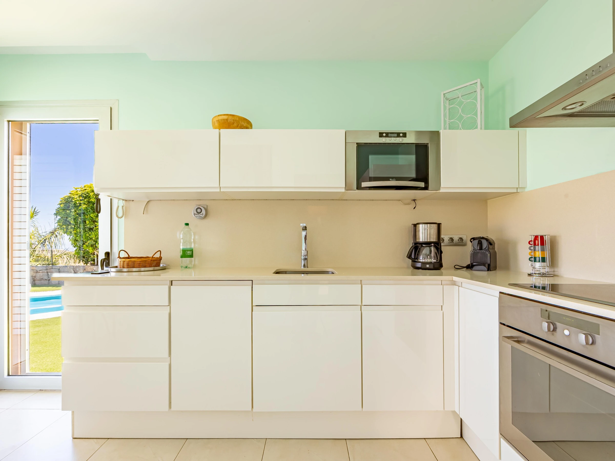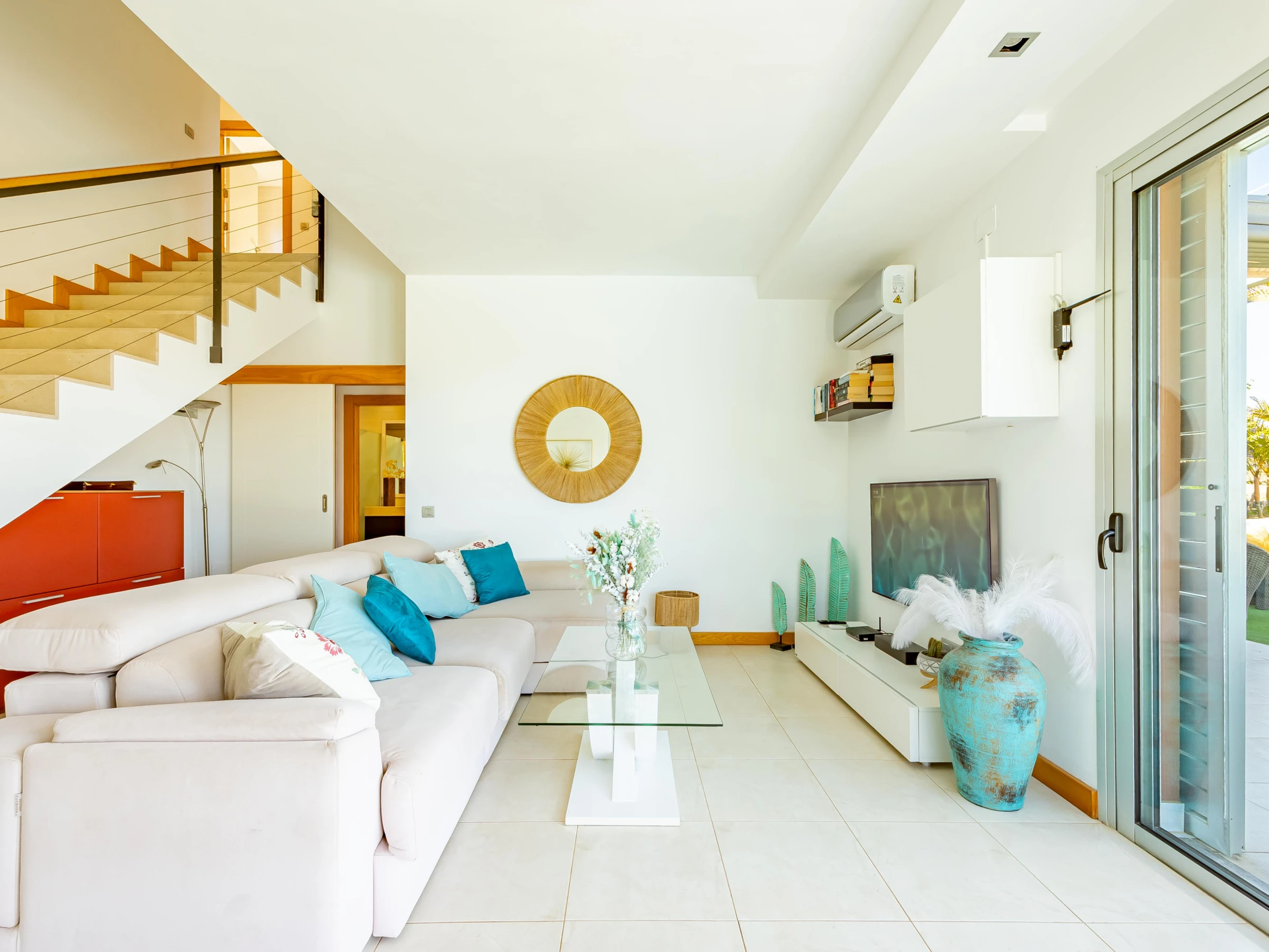 L'appartement dispose d'un salon-salle à manger confortable adjacent à la cuisine américaine, entièrement équipée d'appareils électroménagers de dernière génération, y compris four, micro-ondes, lave-vaisselle et lave-linge/sèche-linge.