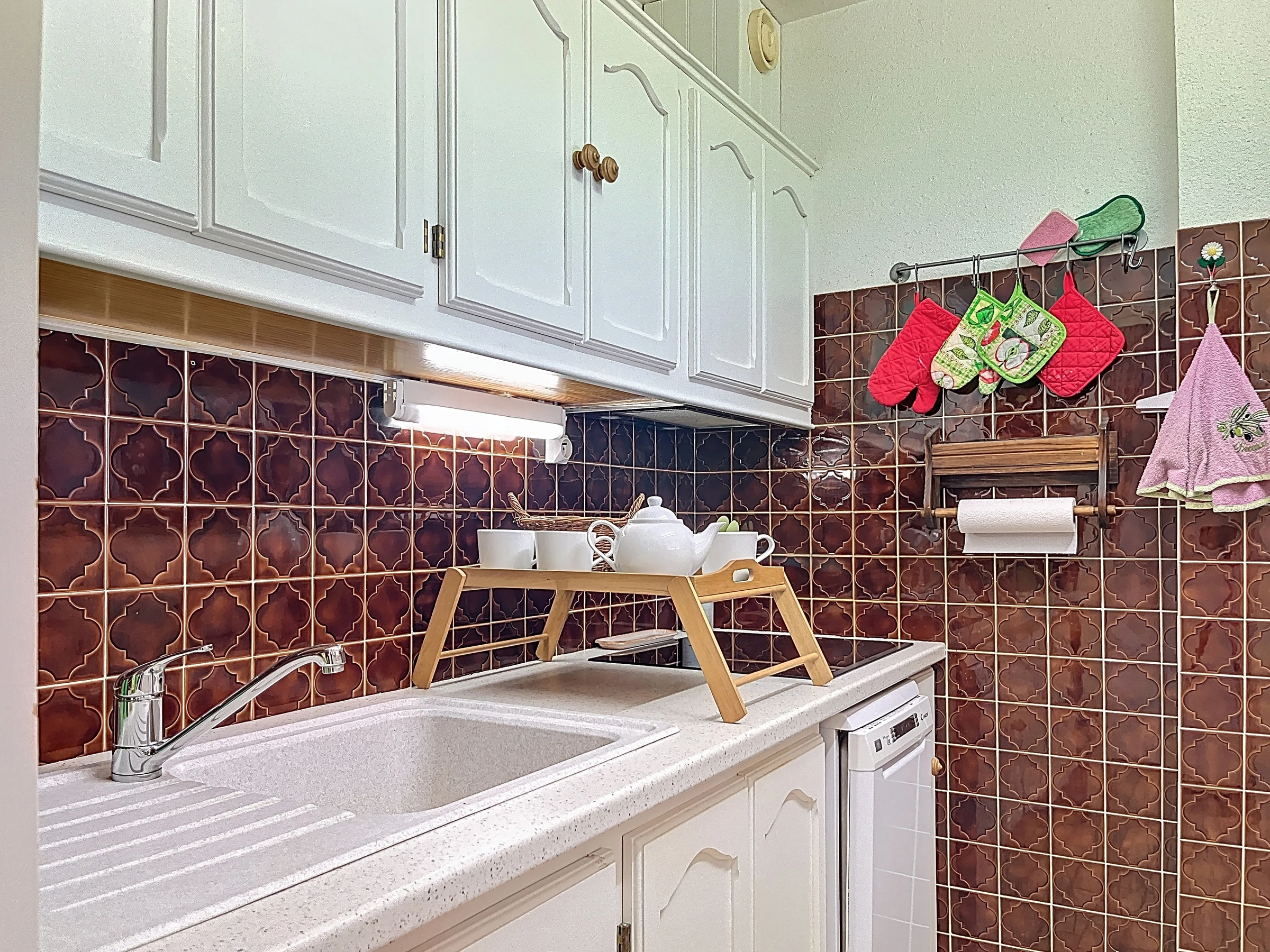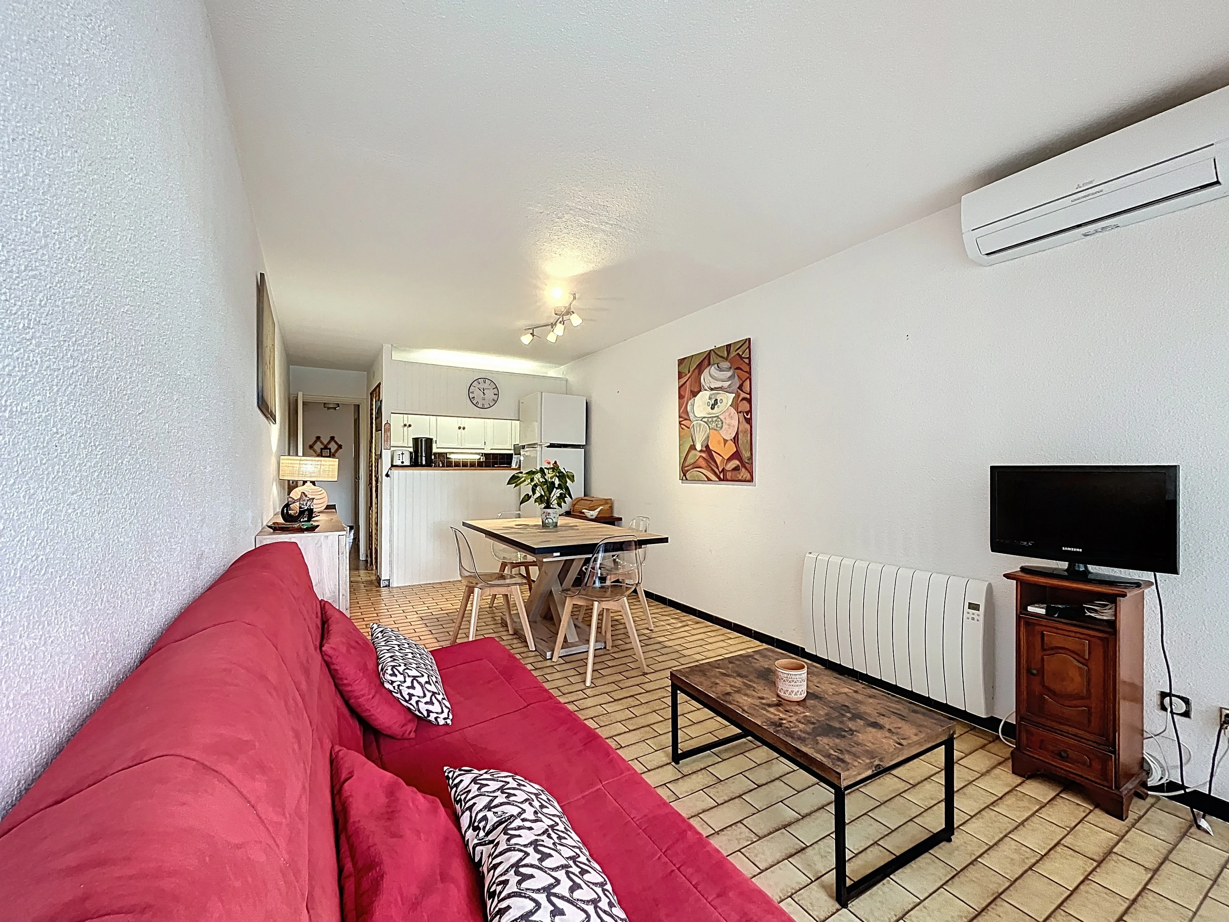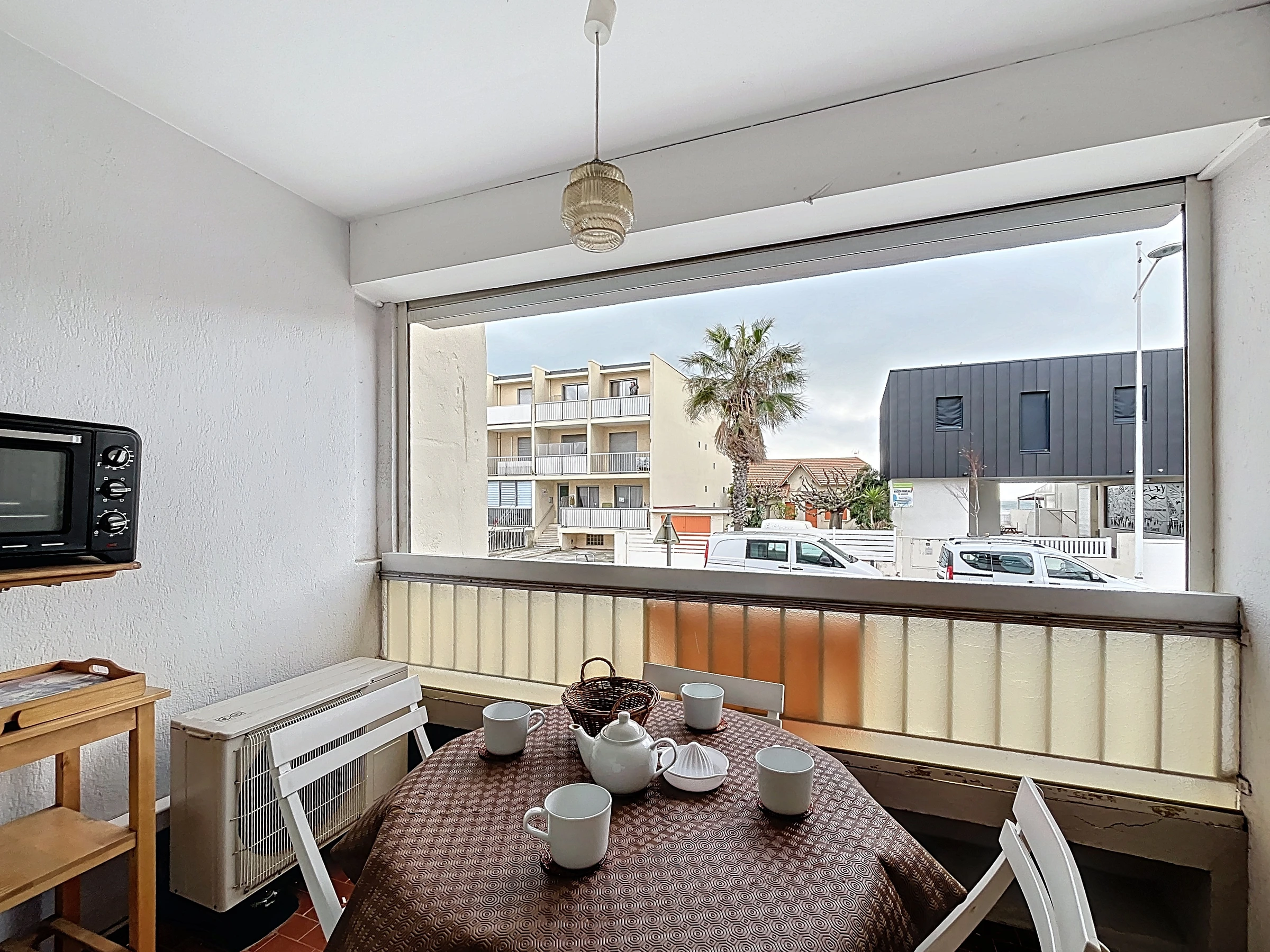 Dans une petite résidence sans ascenseur, en deuxième ligne, spacieux deux pièces traversant en RDC surélevé (1/2 étage), à 50 m de la plage, avec parking privé en sous-sol. Il comprend un séjour/cuisine (canapé convertible) ouvert sur une loggia au sud, un dégagement desservant un toilette, une salle d'eau, un coin cabine avec lits superposés, une chambre avec lit double et balcon au nord.
