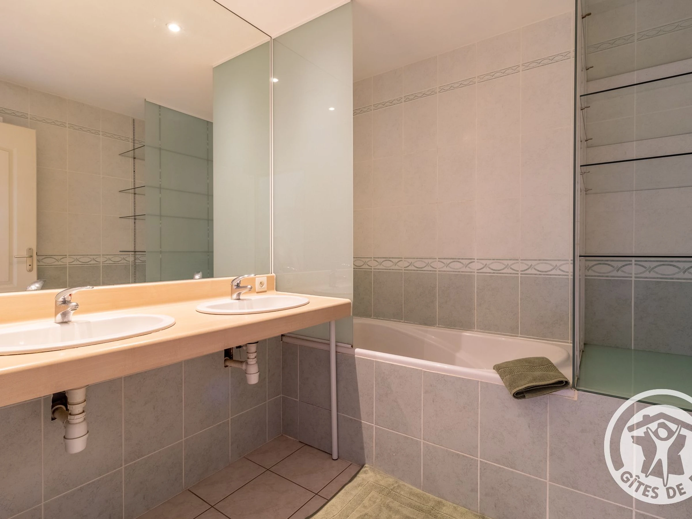 - salle de bain avec baignoire et double vasque (sèche-cheveux), équipements bébé : baignoire et table à langer)