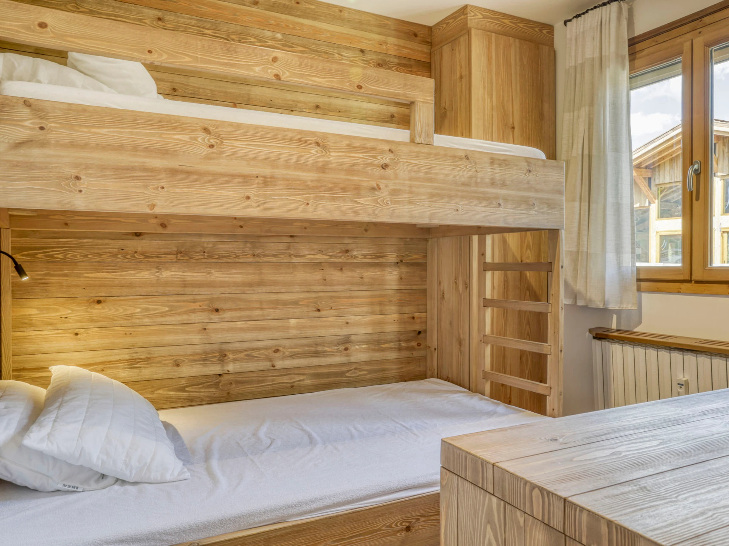 - une chambre avec lits superposés de 120cm en bas et 90cm en haut (le lit du haut ne convient pas aux enfants de moins de six ans),