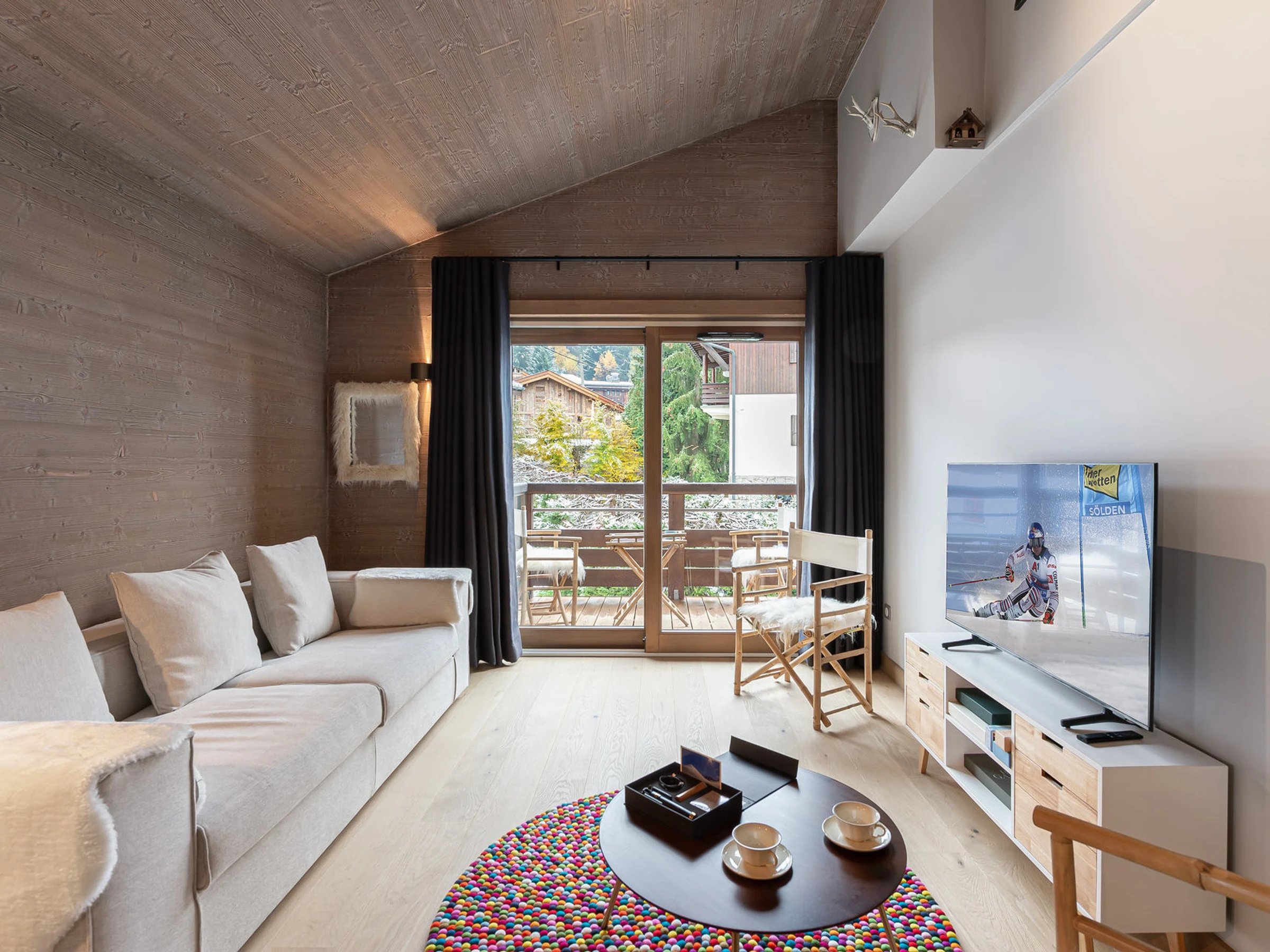 Appartement de 66 m² dans la nouvelle résidence Stallion à Rochebrune, Megève, pouvant accueillir jusqu'à 4 personnes grâce à ses deux chambres doubles. La pièce de vie confortable est idéale pour réunir la famille autour d'un bon repas.