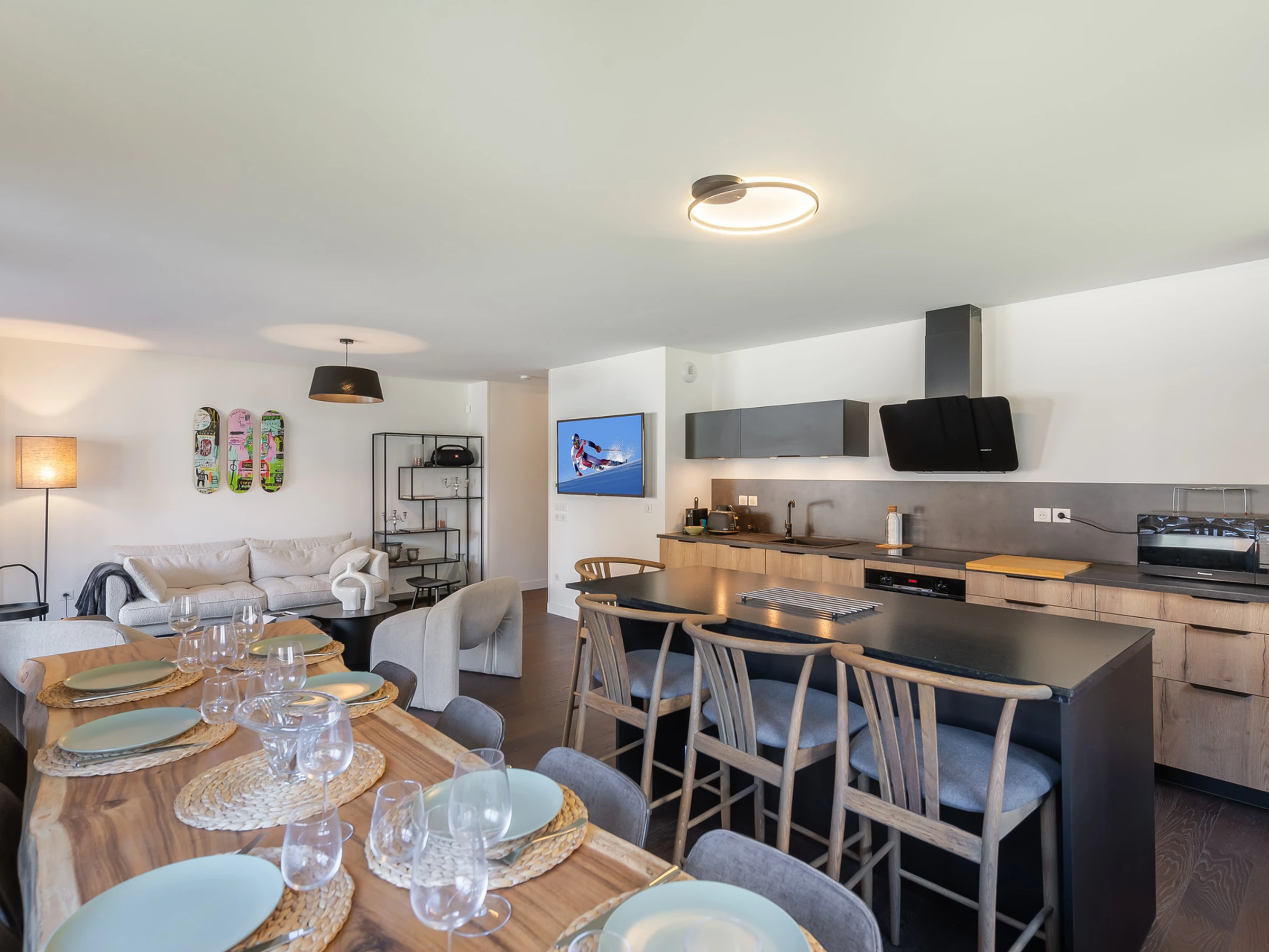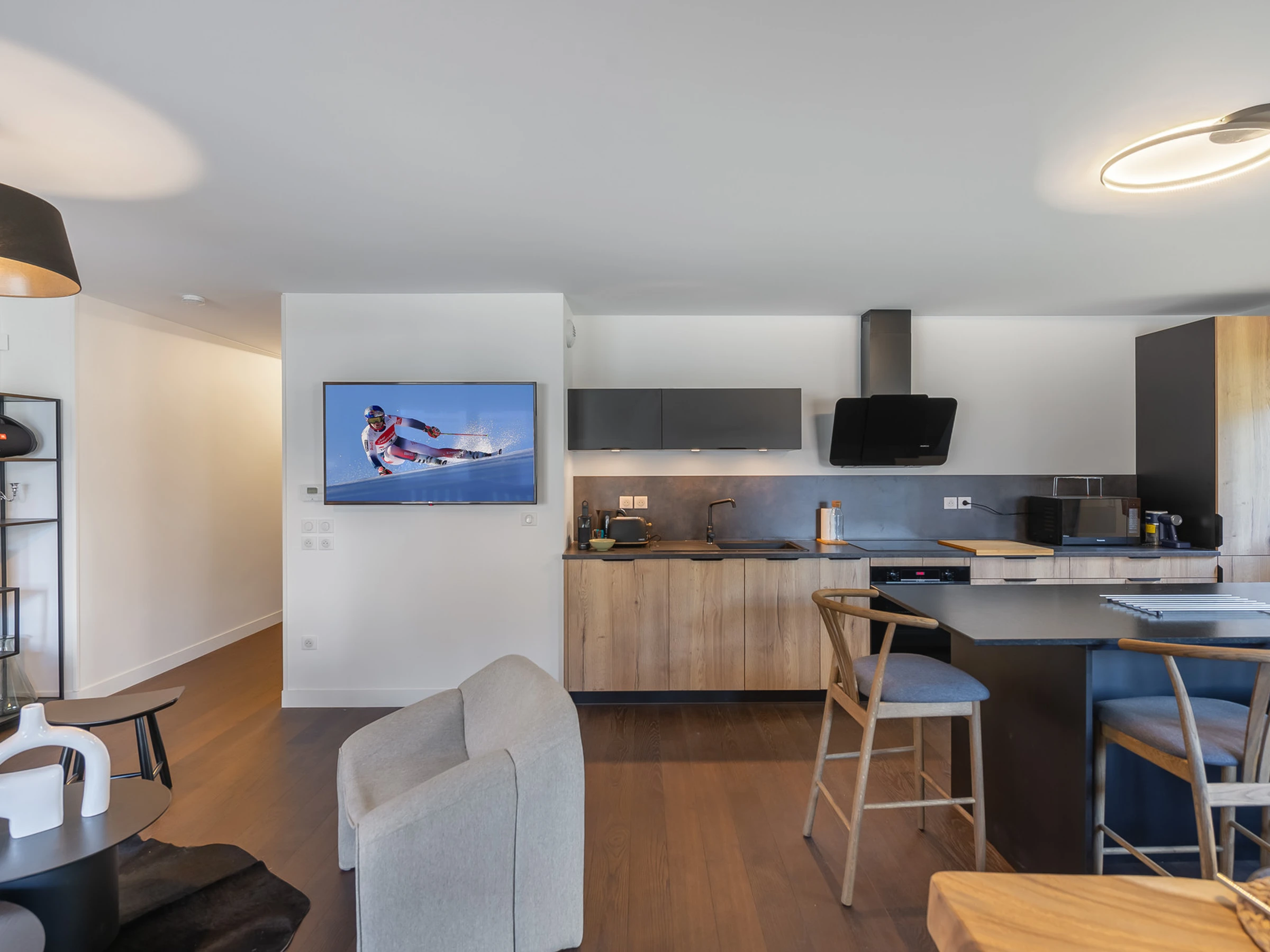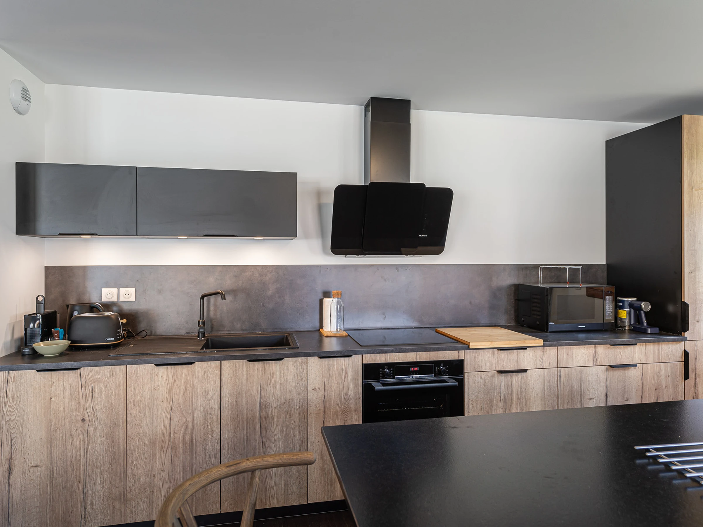 - Pièce de vie avec cuisine ouverte et salon (Nespresso, Grille-pain, bouilloire, lave-vaisselle, four, plaque, micro-onde)