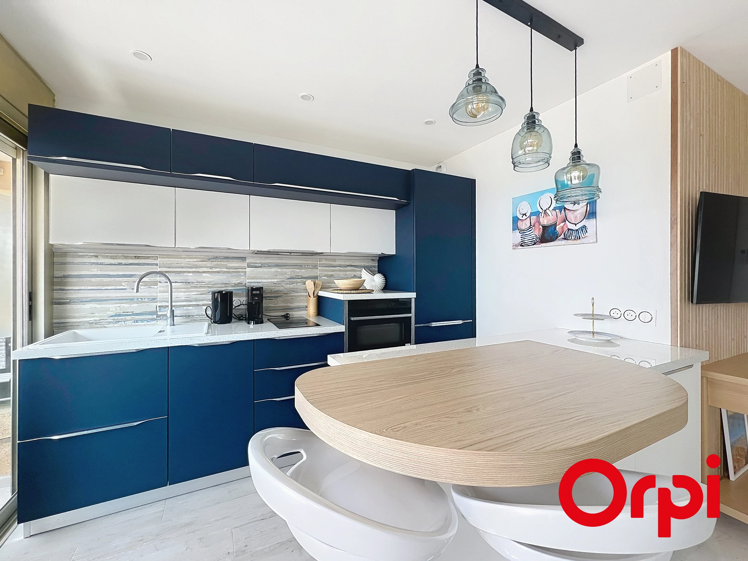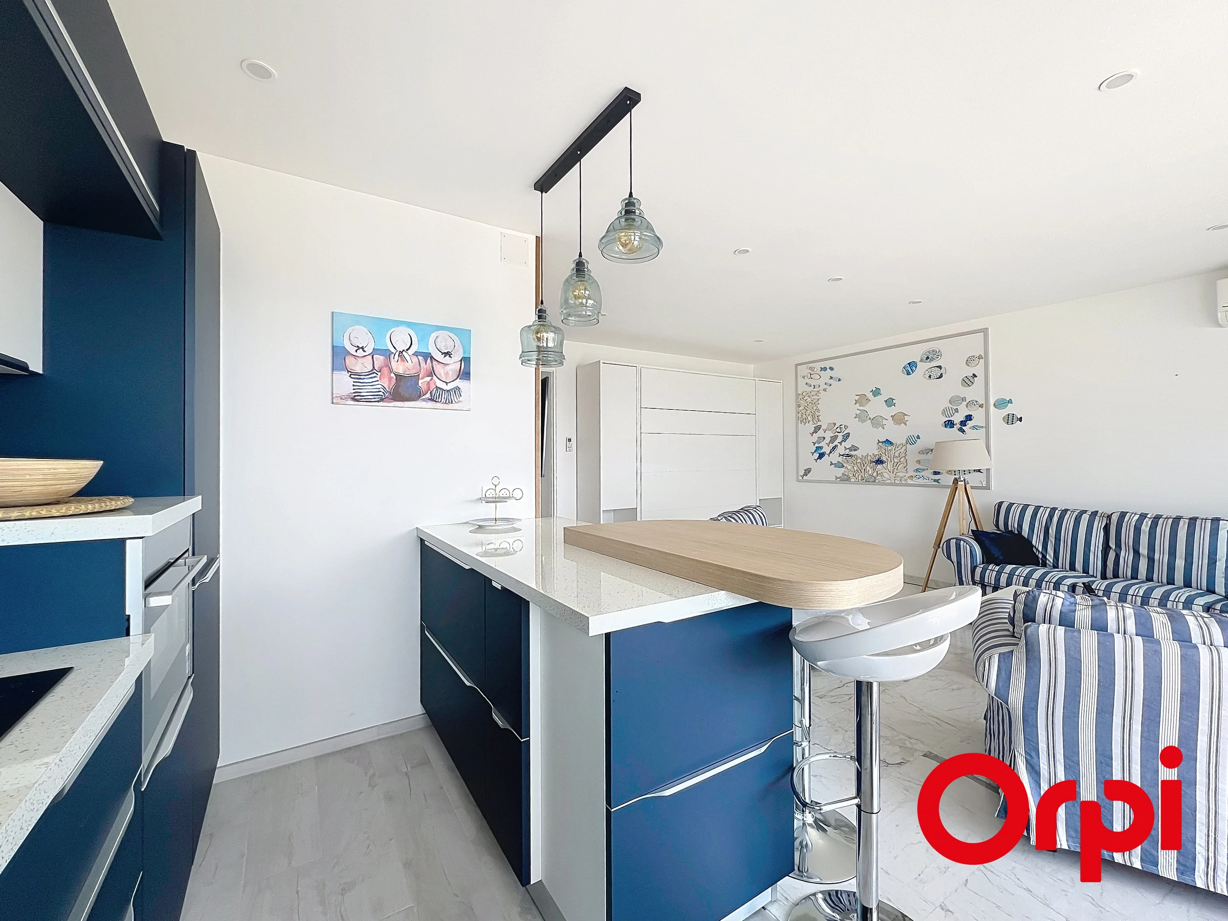 Il se compose d'une entrée avec rangement, d'un séjour avec lit escamotable (160x200cm) et de nombreux rangement, canapé, 2 fauteuils et TV écran plat au mur, d'un coin cuisine équipée de lave-vaisselle, grand réfrigérateur congélateur, four/micro-ondes, machine à café et plaque à induction donnant sur une grande terrasse. Une salle d'eau équipée d'un lave-linge/sèche-linge et douche à l'italienne. Un WC indépendant. WIFI inclus, les parures de lits et les serviettes de toilettes sont fournies. Un cadre idéal pour un séjour tout confort face à la Méditerranée.