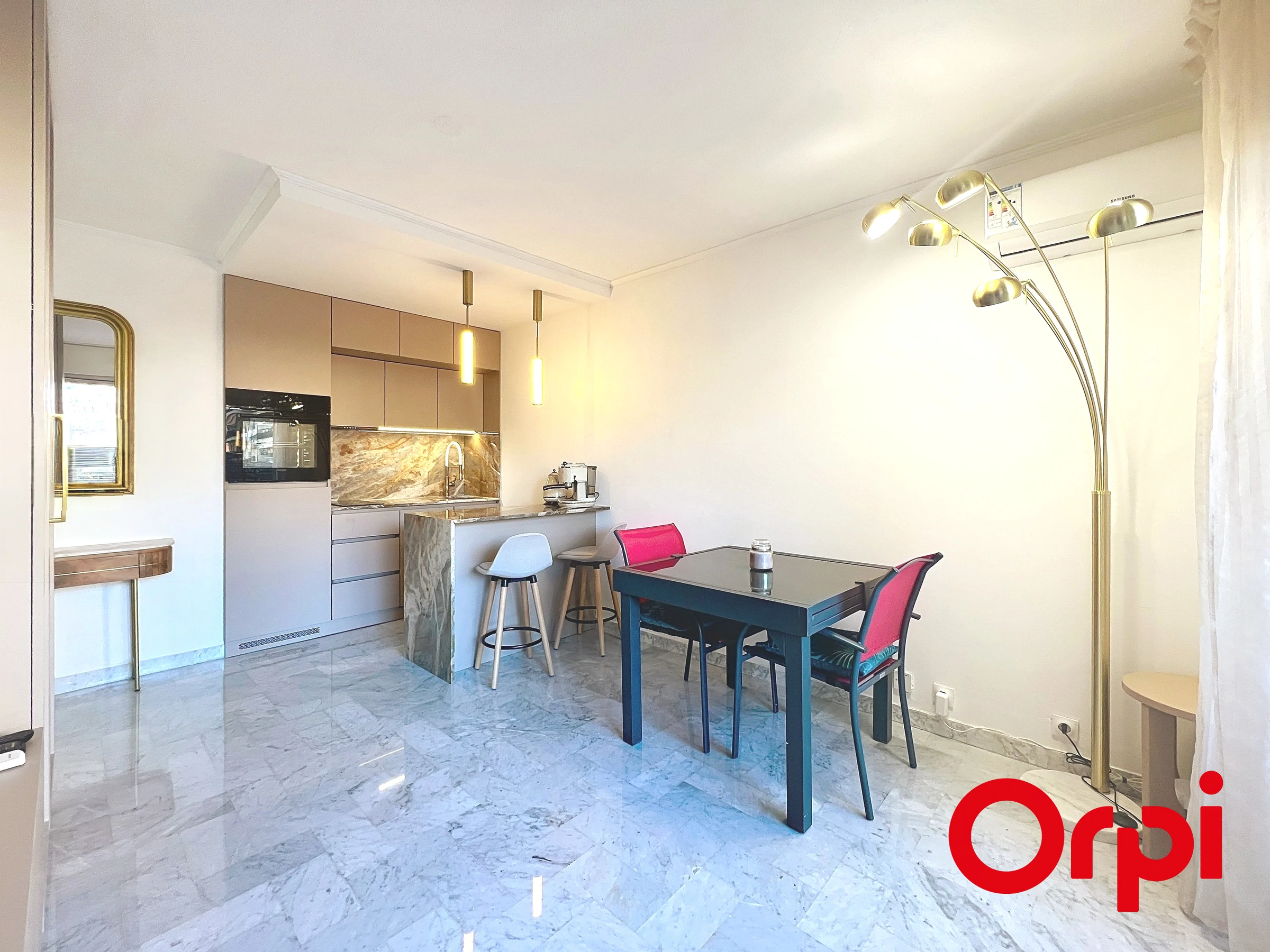 Il dispose d’un agréable coin nuit, avec un lit 140 x 200cm, séparé du séjour, offrant un espace cosy et pratique pour se reposer. Vous apprécierez sa cuisine américaine aménagée et entièrement équipée, parfaite pour préparer vos repas comme à la maison. Le logement s’ouvre sur une belle terrasse, idéale pour profiter du climat méditerranéen, prendre vos repas à l’extérieur ou simplement vous détendre. La salle d’eau élégante, entièrement neuve, apporte une touche de confort et de modernité supplémentaire. L’appartement est équipé du Wi-Fi, idéal pour le télétravail comme pour les séjours de loisirs.