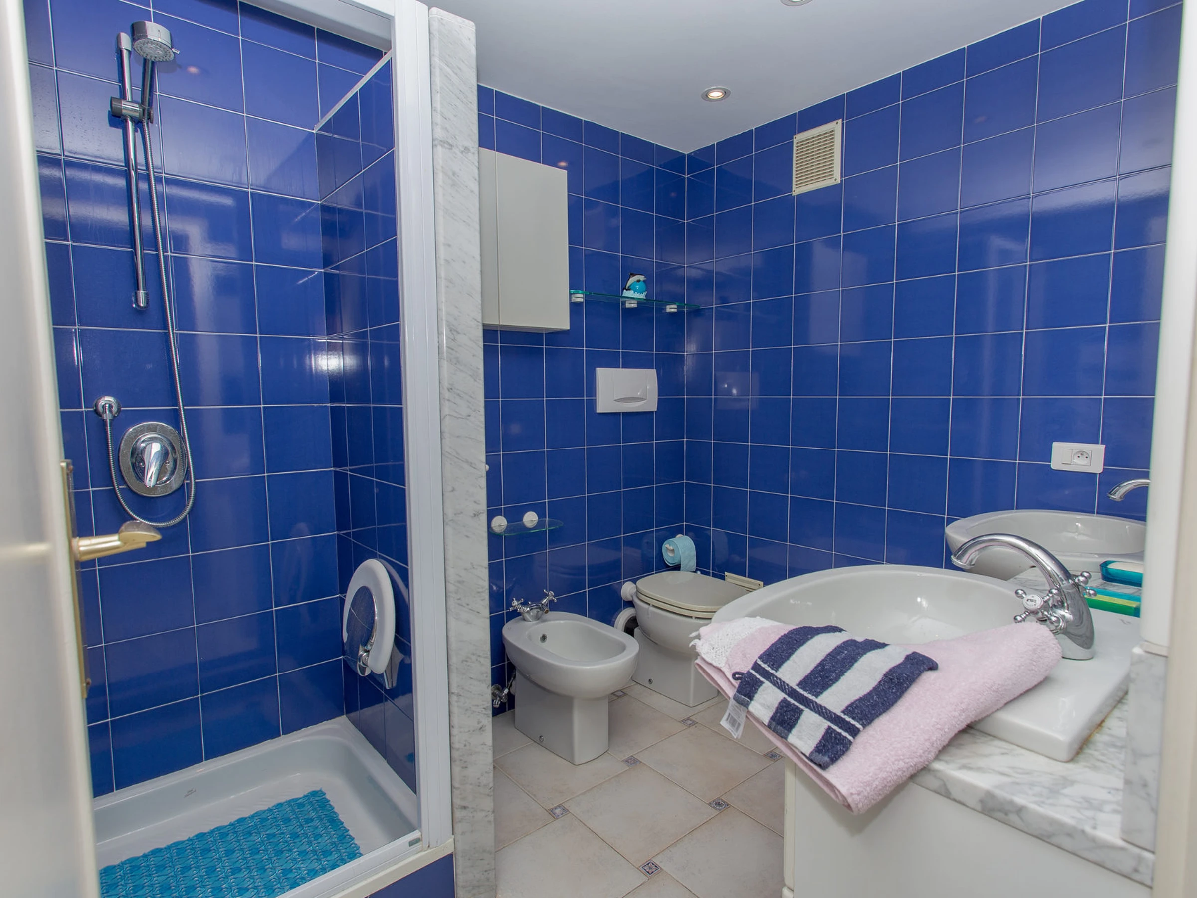 Salle de bains équipée de douche, WC, bidet et double vasque.