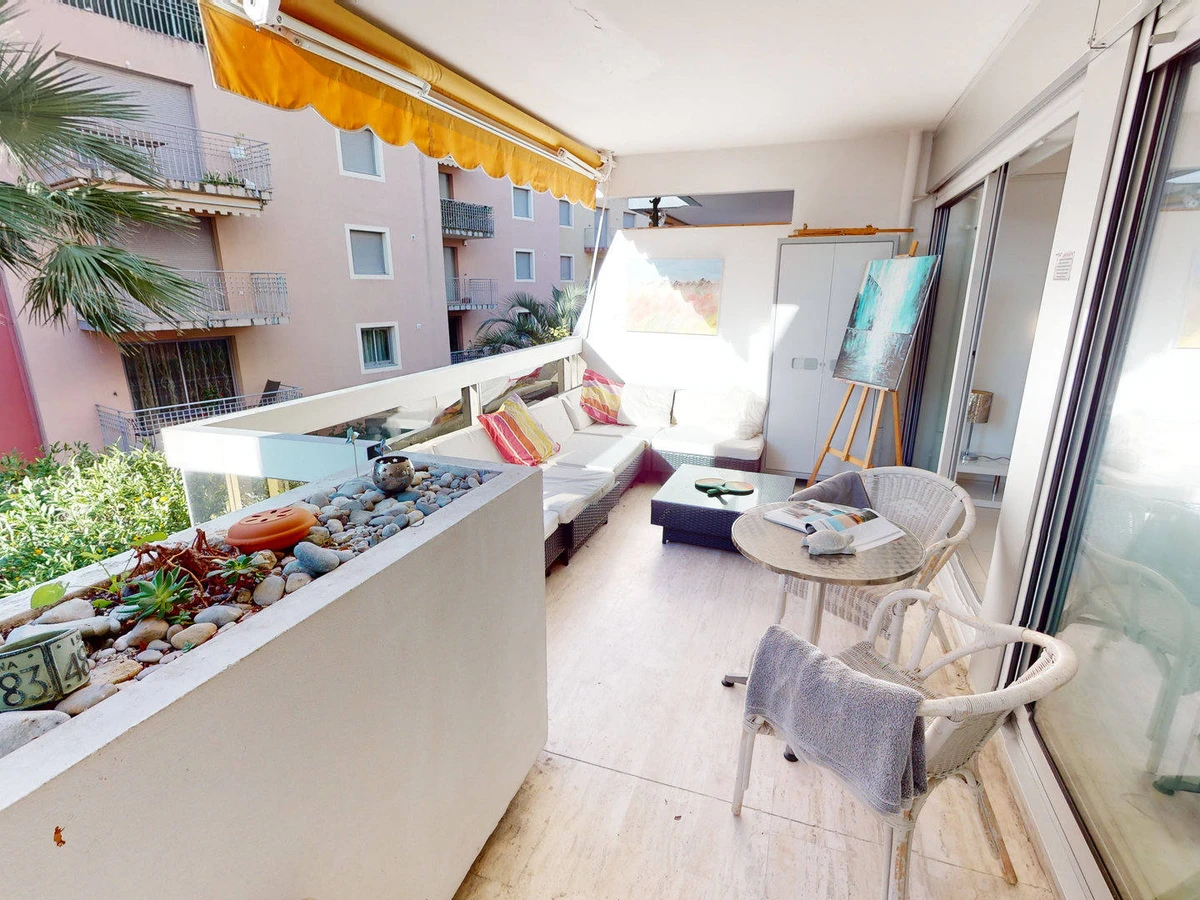 Beau et moderne 2 pièces climatisé avec alcôve, terrasse et parking privé dans une résidence calme avec piscine et proche de la mer et du centre-ville.