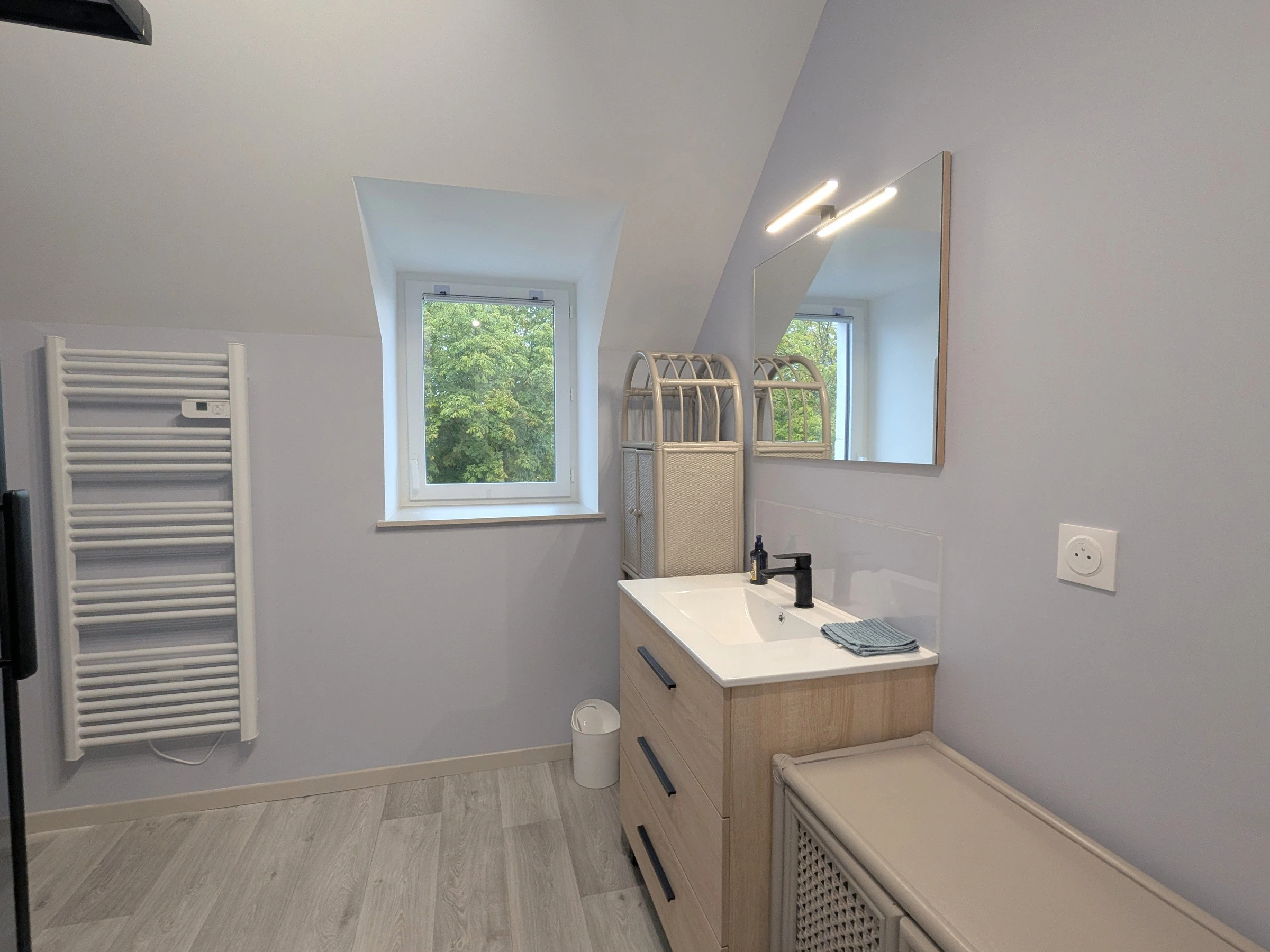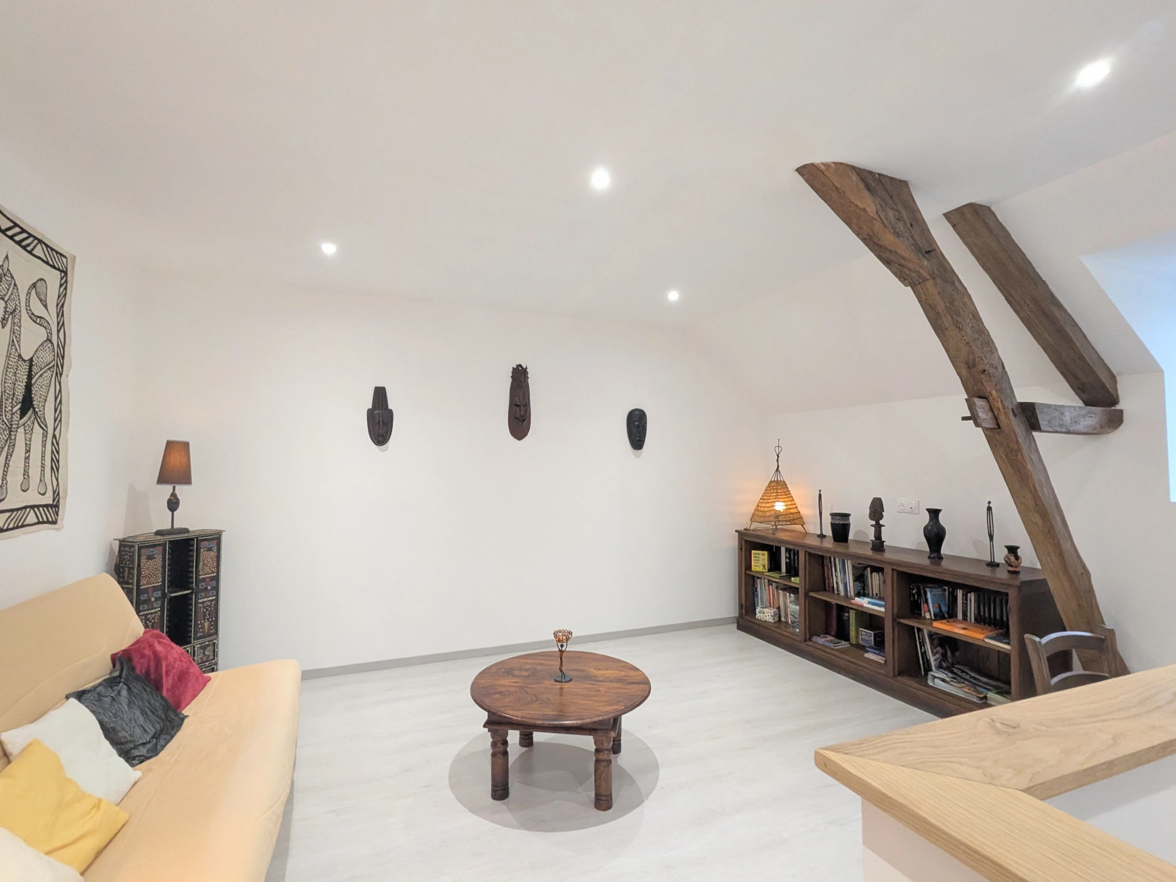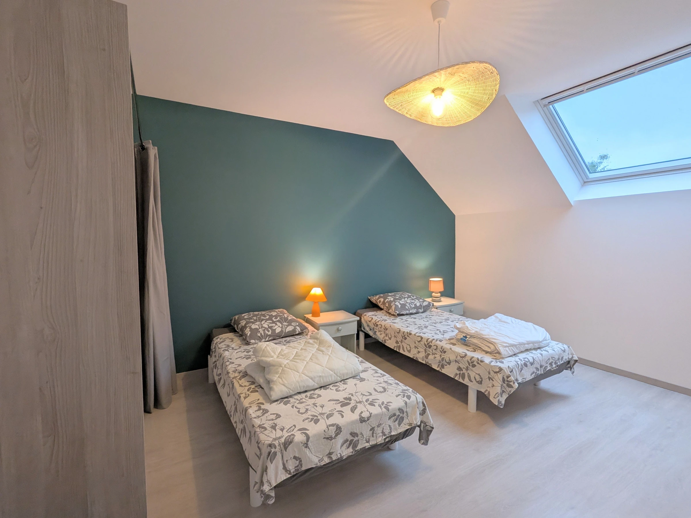 Au premier étage, un grand palier avec un canapé convertible clic-clac (couchage d'appoint 140x190 cm), une chambre avec un lit 2 personnes (160x200 cm) et un lit 1 personne (90 x 190 cm), une chambre avec 2 lits 1 personne (90x190 cm), une salle d'eau, wc.