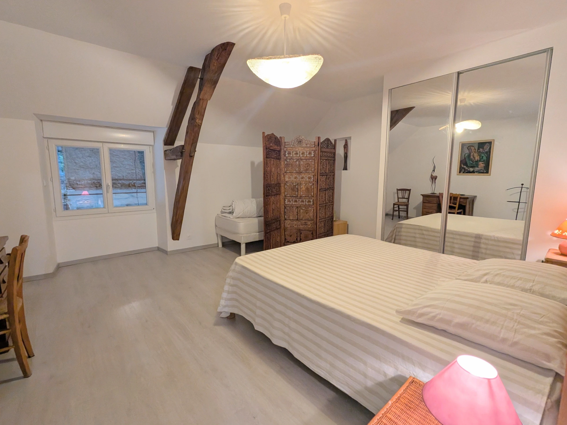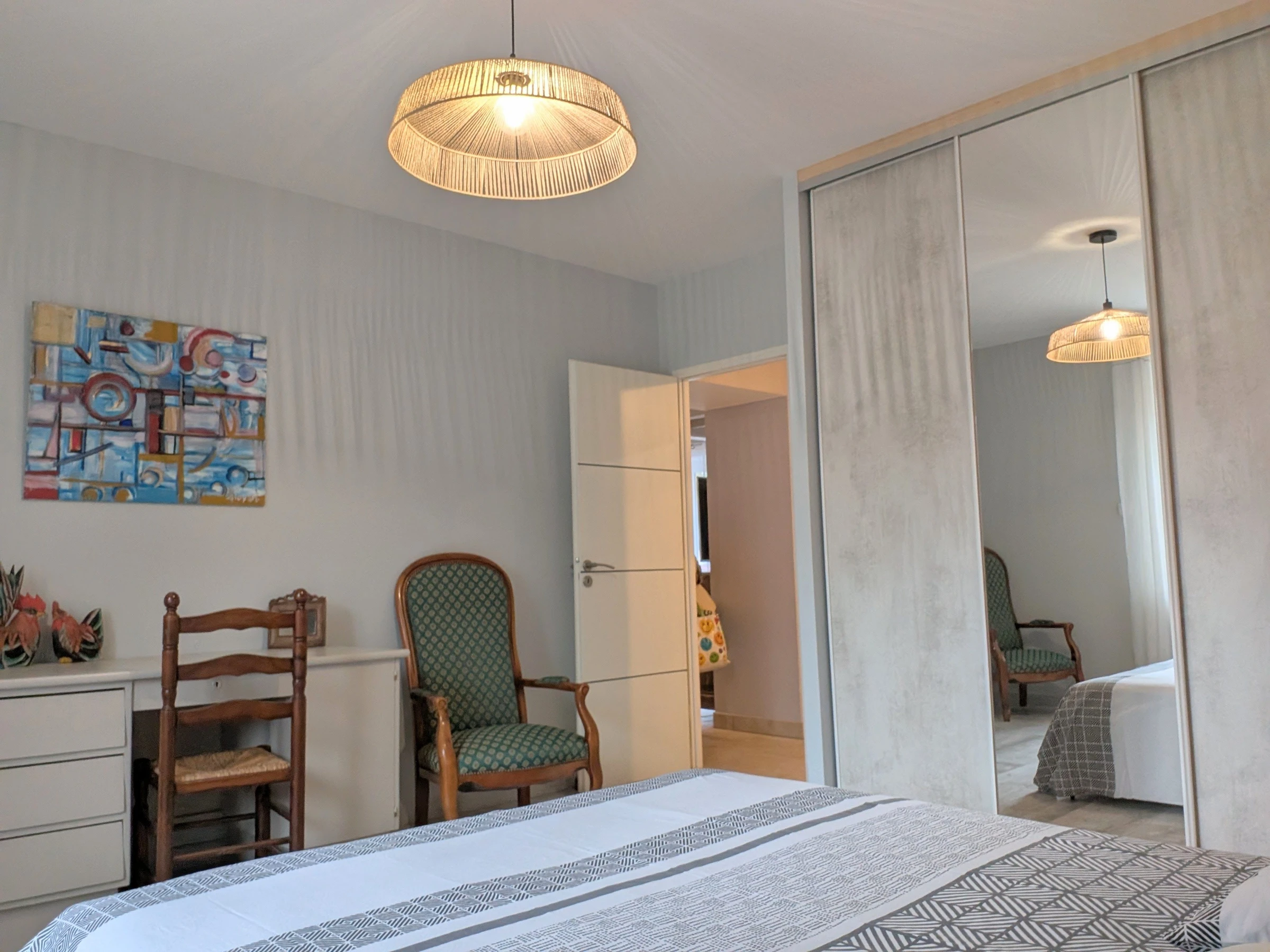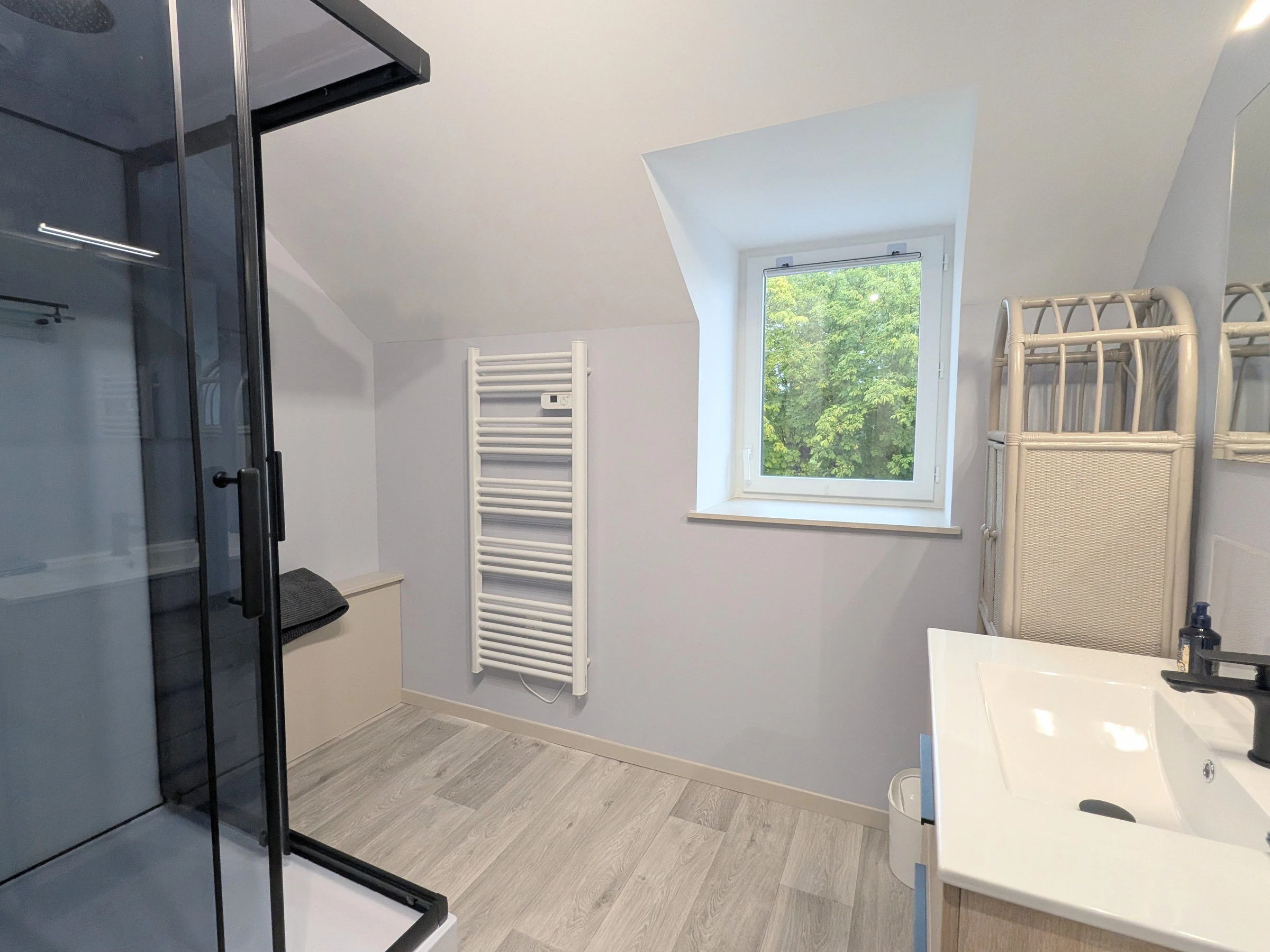 Au premier étage, un grand palier avec un canapé convertible clic-clac (couchage d'appoint 140x190 cm), une chambre avec un lit 2 personnes (160x200 cm) et un lit 1 personne (90 x 190 cm), une chambre avec 2 lits 1 personne (90x190 cm), une salle d'eau, wc.